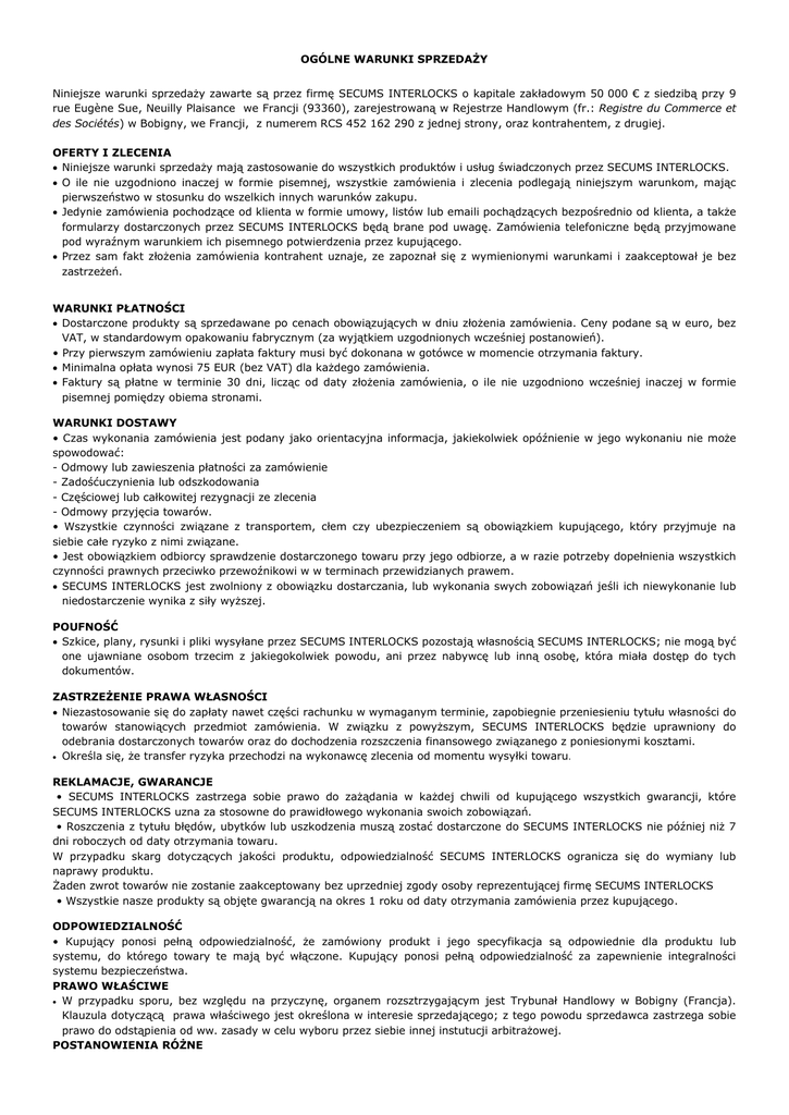 OGÓLNE WARUNKI SPRZEDAŻY Niniejsze warunki sprzedaży zawarte są przez firmę SECUMS INTERLOCKS o kapitale zakładowym 50 000 € z siedzibą przy 9 rue Eugène Sue, Neuilly Plaisance we Francji (93360), zarejestrowaną w Rejestrze Handlowym (fr.: Registre du Commerce et des Sociétés) w Bobigny, we Francji, z numerem RCS 452 162 290 z jednej strony, oraz kontrahentem, z drugiej. OFERTY I ZLECENIA Niniejsze warunki sprzedaży mają zastosowanie do wszystkich produktów i usług świadczonych przez SECUMS INTERLOCKS. O ile nie uzgodniono inaczej w formie pisemnej, wszystkie zamówienia i zlecenia podlegają niniejszym warunkom, mając pierwszeństwo w stosunku do wszelkich innych warunków zakupu. Jedynie zamówienia pochodzące od klienta w formie umowy, listów lub emaili pochądzących bezpośrednio od klienta, a także formularzy dostarczonych przez SECUMS INTERLOCKS będą brane pod uwagę. Zamówienia telefoniczne będą przyjmowane pod wyraźnym warunkiem ich pisemnego potwierdzenia przez kupującego. Przez sam fakt złożenia zamówienia kontrahent uznaje, ze zapoznał się z wymienionymi warunkami i zaakceptował je bez zastrzeżeń. WARUNKI PŁATNOŚCI Dostarczone produkty są sprzedawane po cenach obowiązujących w dniu złożenia zamówienia. Ceny podane są w euro, bez VAT, w standardowym opakowaniu fabrycznym (za wyjątkiem uzgodnionych wcześniej postanowień). • Przy pierwszym zamówieniu zapłata faktury musi być dokonana w gotówce w momencie otrzymania faktury. Minimalna opłata wynosi 75 EUR (bez VAT) dla każdego zamówienia. Faktury są płatne w terminie 30 dni, licząc od daty złożenia zamówienia, o ile nie uzgodniono wcześniej inaczej w formie pisemnej pomiędzy obiema stronami. WARUNKI DOSTAWY • Czas wykonania zamówienia jest podany jako orientacyjna informacja, jakiekolwiek opóźnienie w jego wykonaniu nie może spowodować: - Odmowy lub zawieszenia płatności za zamówienie - Zadośćuczynienia lub odszkodowania - Częściowej lub całkowitej rezygnacji ze zlecenia - Odmowy przyjęcia towarów. • Wszystkie czynności związane z transportem, cłem czy ubezpieczeniem są obowiązkiem kupującego, który przyjmuje na siebie całe ryzyko z nimi związane. • Jest obowiązkiem odbiorcy sprawdzenie dostarczonego towaru przy jego odbiorze, a w razie potrzeby dopełnienia wszystkich czynności prawnych przeciwko przewoźnikowi w w terminach przewidzianych prawem. SECUMS INTERLOCKS jest zwolniony z obowiązku dostarczania, lub wykonania swych zobowiązań jeśli ich niewykonanie lub niedostarczenie wynika z siły wyższej. POUFNOŚĆ Szkice, plany, rysunki i pliki wysyłane przez SECUMS INTERLOCKS pozostają własnością SECUMS INTERLOCKS; nie mogą być one ujawniane osobom trzecim z jakiegokolwiek powodu, ani przez nabywcę lub inną osobę, która miała dostęp do tych dokumentów. ZASTRZEŻENIE PRAWA WŁASNOŚCI Niezastosowanie się do zapłaty nawet części rachunku w wymaganym terminie, zapobiegnie przeniesieniu tytułu własności do towarów stanowiących przedmiot zamówienia. W związku z powyższym, SECUMS INTERLOCKS będzie uprawniony do odebrania dostarczonych towarów oraz do dochodzenia rozszczenia finansowego związanego z poniesionymi kosztami. Określa się, że transfer ryzyka przechodzi na wykonawcę zlecenia od momentu wysyłki towaru. REKLAMACJE, GWARANCJE • SECUMS INTERLOCKS zastrzega sobie prawo do zażądania w każdej chwili od kupującego wszystkich gwarancji, które SECUMS INTERLOCKS uzna za stosowne do prawidłowego wykonania swoich zobowiązań. • Roszczenia z tytułu błędów, ubytków lub uszkodzenia muszą zostać dostarczone do SECUMS INTERLOCKS nie później niż 7 dni roboczych od daty otrzymania towaru. W przypadku skarg dotyczących jakości produktu, odpowiedzialność SECUMS INTERLOCKS ogranicza się do wymiany lub naprawy produktu. Żaden zwrot towarów nie zostanie zaakceptowany bez uprzedniej zgody osoby reprezentującej firmę SECUMS INTERLOCKS • Wszystkie nasze produkty są objęte gwarancją na okres 1 roku od daty otrzymania zamówienia przez kupującego. ODPOWIEDZIALNOŚĆ • Kupujący ponosi pełną odpowiedzialność, że zamówiony produkt i jego specyfikacja są odpowiednie dla produktu lub systemu, do którego towary te mają być włączone. Kupujący ponosi pełną odpowiedzialność za zapewnienie integralności systemu bezpieczeństwa. PRAWO WŁAŚCIWE W przypadku sporu, bez względu na przyczynę, organem rozsztrzygającym jest Trybunał Handlowy w Bobigny (Francja). Klauzula dotyczącą prawa właściwego jest określona w interesie sprzedającego; z tego powodu sprzedawca zastrzega sobie prawo do odstąpienia od ww. zasady w celu wyboru przez siebie innej instutucji arbitrażowej. POSTANOWIENIA RÓŻNE Informacje zawarte w naszych broszurach, cenniku i innych dokumentach nie mają natury wiążącej. Nasza firma zastrzega sobie prawo do wprowadzania zmian do informacji podanych w tych dokumentach.