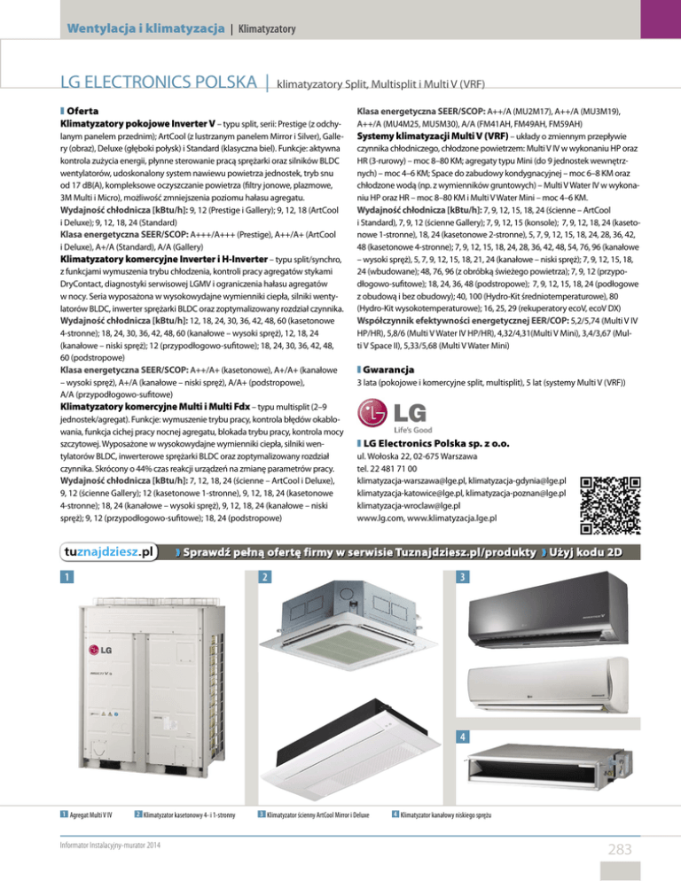 Wentylacja i klimatyzacja | Klimatyzatory LG ELECTRONICS POLSKA | klimatyzatory Split, Multisplit i Multi V (VRF) ❚ Oferta Klimatyzatory pokojowe Inverter V– typu split, serii: Prestige (z odchylanym panelem przednim); ArtCool (z lustrzanym panelem Mirror i Silver), Gallery (obraz), Deluxe (głęboki połysk) i Standard (klasyczna biel). Funkcje: aktywna kontrola zużycia energii, płynne sterowanie pracą sprężarki oraz silników BLDC wentylatorów, udoskonalony system nawiewu powietrza jednostek, tryb snu od 17 dB(A), kompleksowe oczyszczanie powietrza (filtry jonowe, plazmowe, 3M Multi i Micro), możliwość zmniejszenia poziomu hałasu agregatu. Wydajność chłodnicza [kBtu/h]: 9, 12 (Prestige i Gallery); 9, 12, 18 (ArtCool i Deluxe); 9, 12, 18, 24 (Standard) Klasa energetyczna SEER/SCOP: A+++/A+++ (Prestige), A++/A+ (ArtCool i Deluxe), A+/A (Standard), A/A (Gallery) Klimatyzatory komercyjne Inverter i H-Inverter– typu split/synchro, z funkcjami wymuszenia trybu chłodzenia, kontroli pracy agregatów stykami DryContact, diagnostyki serwisowej LGMV i ograniczenia hałasu agregatów w nocy. Seria wyposażona w wysokowydajne wymienniki ciepła, silniki wentylatorów BLDC, inwerter sprężarki BLDC oraz zoptymalizowany rozdział czynnika. Wydajność chłodnicza [kBtu/h]: 12, 18, 24, 30, 36, 42, 48, 60 (kasetonowe 4-stronne); 18, 24, 30, 36, 42, 48, 60 (kanałowe – wysoki spręż), 12, 18, 24 (kanałowe – niski spręż); 12 (przypodłogowo-sufitowe); 18, 24, 30, 36, 42, 48, 60 (podstropowe) Klasa energetyczna SEER/SCOP: A++/A+ (kasetonowe), A+/A+ (kanałowe – wysoki spręż), A+/A (kanałowe – niski spręż), A/A+ (podstropowe), A/A (przypodłogowo-sufitowe) Klimatyzatory komercyjne Multi i Multi Fdx – typu multisplit (2–9 jednostek/agregat). Funkcje: wymuszenie trybu pracy, kontrola błędów okablowania, funkcja cichej pracy nocnej agregatu, blokada trybu pracy, kontrola mocy szczytowej. Wyposażone w wysokowydajne wymienniki ciepła, silniki wentylatorów BLDC, inwerterowe sprężarki BLDC oraz zoptymalizowany rozdział czynnika. Skrócony o 44% czas reakcji urządzeń na zmianę parametrów pracy. Wydajność chłodnicza [kBtu/h]: 7, 12, 18, 24 (ścienne – ArtCool i Deluxe), 9, 12 (ścienne Gallery); 12 (kasetonowe 1-stronne), 9, 12, 18, 24 (kasetonowe 4-stronne); 18, 24 (kanałowe – wysoki spręż), 9, 12, 18, 24 (kanałowe – niski spręż); 9, 12 (przypodłogowo-sufitowe); 18, 24 (podstropowe) Klasa energetyczna SEER/SCOP: A++/A (MU2M17), A++/A (MU3M19), A++/A (MU4M25, MU5M30), A/A (FM41AH, FM49AH, FM59AH) Systemy klimatyzacji Multi V (VRF)– układy o zmiennym przepływie czynnika chłodniczego, chłodzone powietrzem: Multi V IV w wykonaniu HP oraz HR (3-rurowy) – moc 8–80 KM; agregaty typu Mini (do 9 jednostek wewnętrznych) – moc 4–6 KM; Space do zabudowy kondygnacyjnej – moc 6–8 KM oraz chłodzone wodą (np. z wymienników gruntowych) – Multi V Water IV w wykonaniu HP oraz HR – moc 8–80 KM i Multi V Water Mini – moc 4–6 KM. Wydajność chłodnicza [kBtu/h]: 7, 9, 12, 15, 18, 24 (ścienne – ArtCool i Standard), 7, 9, 12 (ścienne Gallery); 7, 9, 12, 15 (konsole); 7, 9, 12, 18, 24 (kasetonowe 1-stronne), 18, 24 (kasetonowe 2-stronne), 5, 7, 9, 12, 15, 18, 24, 28, 36, 42, 48 (kasetonowe 4-stronne); 7, 9, 12, 15, 18, 24, 28, 36, 42, 48, 54, 76, 96 (kanałowe – wysoki spręż), 5, 7, 9, 12, 15, 18, 21, 24 (kanałowe – niski spręż); 7, 9, 12, 15, 18, 24 (wbudowane); 48, 76, 96 (z obróbką świeżego powietrza); 7, 9, 12 (przypodłogowo-sufitowe); 18, 24, 36, 48 (podstropowe); 7, 9, 12, 15, 18, 24 (podłogowe z obudową i bez obudowy); 40, 100 (Hydro-Kit średniotemperaturowe), 80 (Hydro-Kit wysokotemperaturowe); 16, 25, 29 (rekuperatory ecoV, ecoV DX) Współczynnik efektywności energetycznej EER/COP: 5,2/5,74 (Multi V IV HP/HR), 5,8/6 (Multi V Water IV HP/HR), 4,32/4,31(Multi V Mini), 3,4/3,67 (Multi V Space II), 5,33/5,68 (Multi V Water Mini) z Gwarancja 3 lata (pokojowe i komercyjne split, multisplit), 5 lat (systemy Multi V (VRF)) ❚ LG Electronics Polska sp. z o.o. ul. Wołoska 22, 02-675 Warszawa tel. 22 481 71 00 [email protected], [email protected] [email protected], [email protected] [email protected] www.lg.com, www.klimatyzacja.lge.pl ❱ Sprawdź pełną ofertę firmy w serwisie Tuznajdziesz.pl/produkty ❱ Użyj kodu 2D 1 2 3 4 1 Agregat Multi V IV 2 Klimatyzator kasetonowy 4- i 1-stronny Informator Instalacyjny-murator 2014 3 Klimatyzator ścienny ArtCool Mirror i Deluxe 4 Klimatyzator kanałowy niskiego sprężu 283