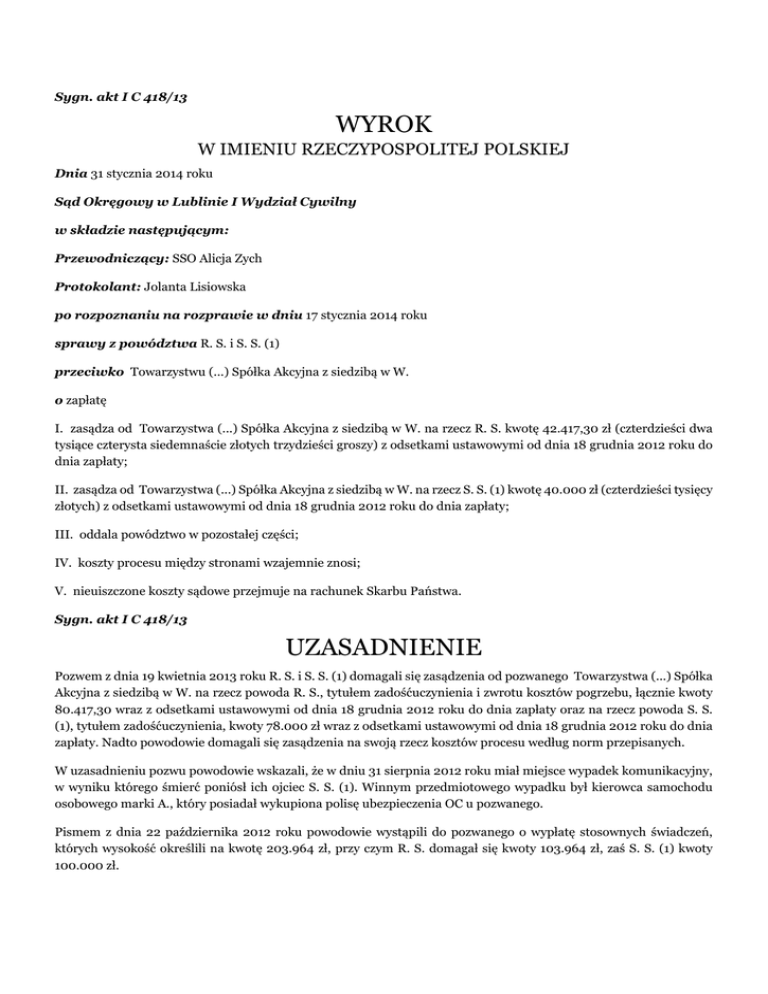 Sygn. akt I C 418/13 WYROK W IMIENIU RZECZYPOSPOLITEJ POLSKIEJ Dnia 31 stycznia 2014 roku Sąd Okręgowy w Lublinie I Wydział Cywilny w składzie następującym: Przewodniczący: SSO Alicja Zych Protokolant: Jolanta Lisiowska po rozpoznaniu na rozprawie w dniu 17 stycznia 2014 roku sprawy z powództwa R. S. i S. S. (1) przeciwko Towarzystwu (...) Spółka Akcyjna z siedzibą w W. o zapłatę I. zasądza od Towarzystwa (...) Spółka Akcyjna z siedzibą w W. na rzecz R. S. kwotę 42.417,30 zł (czterdzieści dwa tysiące czterysta siedemnaście złotych trzydzieści groszy) z odsetkami ustawowymi od dnia 18 grudnia 2012 roku do dnia zapłaty; II. zasądza od Towarzystwa (...) Spółka Akcyjna z siedzibą w W. na rzecz S. S. (1) kwotę 40.000 zł (czterdzieści tysięcy złotych) z odsetkami ustawowymi od dnia 18 grudnia 2012 roku do dnia zapłaty; III. oddala powództwo w pozostałej części; IV. koszty procesu między stronami wzajemnie znosi; V. nieuiszczone koszty sądowe przejmuje na rachunek Skarbu Państwa. Sygn. akt I C 418/13 UZASADNIENIE Pozwem z dnia 19 kwietnia 2013 roku R. S. i S. S. (1) domagali się zasądzenia od pozwanego Towarzystwa (...) Spółka Akcyjna z siedzibą w W. na rzecz powoda R. S., tytułem zadośćuczynienia i zwrotu kosztów pogrzebu, łącznie kwoty 80.417,30 wraz z odsetkami ustawowymi od dnia 18 grudnia 2012 roku do dnia zapłaty oraz na rzecz powoda S. S. (1), tytułem zadośćuczynienia, kwoty 78.000 zł wraz z odsetkami ustawowymi od dnia 18 grudnia 2012 roku do dnia zapłaty. Nadto powodowie domagali się zasądzenia na swoją rzecz kosztów procesu według norm przepisanych. W uzasadnieniu pozwu powodowie wskazali, że w dniu 31 sierpnia 2012 roku miał miejsce wypadek komunikacyjny, w wyniku którego śmierć poniósł ich ojciec S. S. (1). Winnym przedmiotowego wypadku był kierowca samochodu osobowego marki A., który posiadał wykupiona polisę ubezpieczenia OC u pozwanego. Pismem z dnia 22 października 2012 roku powodowie wystąpili do pozwanego o wypłatę stosownych świadczeń, których wysokość określili na kwotę 203.964 zł, przy czym R. S. domagał się kwoty 103.964 zł, zaś S. S. (1) kwoty 100.000 zł. W odpowiedzi pozwany, po przeprowadzeniu postępowania likwidacyjnego i przyjęciu 80 % przyczynienia się zmarłego do zaistnienia szkody ( zmarły nie miał zapiętych pasów bezpieczeństwa), wypłacił powodom po 2 000 zł. tytułem zadośćuczynienia. W ocenie powodów wypłacone na ich rzecz świadczenie jest rażąco niskie, zaś ustalone przyczynienie rażąco za wysokie. Przechodząc do uzasadnienia wysokości swoich żądań powodowie wskazali, że kwotą odpowiednią tytułem zadośćuczynienia, w świetle obowiązujących przepisów, będzie kwota 100.000 zł na rzecz każdego z nich oraz tytułem zwrotu kosztów pogrzebu kwota 3.156,80 zł na rzecz R. S., pomniejszone o 20 % przyczynienie się zmarłego do powstania szkody, co daje kwoty wskazane w żądaniu pozwu ( pozew, k.2 -12). Pozwane Towarzystwo (...) Spółka Akcyjna z siedzibą w W. złożyło odpowiedź na pozew, w której domagało się oddalenia powództwa oraz zasądzenia na swoją rzecz kosztów procesu według norm przepisanych (odpowiedź na pozew k. 68- 74 akt sprawy). Uzasadniając swoje stanowisko w sprawie pozwany podniósł przede wszystkim, że przyczynienie się do zaistnienia szkody ustalone w trakcie postępowania likwidacyjnego, ustalone zostało prawidłowo. Za rażąco niskie uznał natomiast w tym zakresie stanowisko powodów. Przechodząc do wysokości roszczeń wskazanych przez powodów pozwany podniósł, że powodowie w żaden sposób nie wykazali, by doznane przez nich cierpienia psychiczne doprowadziły do rozstroju zdrowia i powstania krzywdy w rozmiarze uzasadniającym przyznanie na ich rzecz zadośćuczynienia w żądanej wysokości. Odnosząc się natomiast do żądania wypłaty na rzecz R. S. zwrotu kosztów pogrzebu, to w ocenie pozwanego kwota wypłaconego w toku postępowania likwidacyjnego świadczenia, mając na uwadze 80 % przyczynienie zmarłego, w całości wyczerpuje żądanie powoda. Pozwany odniósł się również do żądania zasądzenia odsetek, które jego zdaniem, w sytuacji gdyby roszczenie powodów zostało uznane za zasadne, winny zostać zasądzone od dnia wyrokowania, albowiem to na ten dzień ustalony zostanie zakres szkody powodów. Sąd Okręgowy ustalił następujący stan faktyczny: W dniu 31 sierpnia 2012 roku w miejscowości S., pow. (...), miał miejsce wypadek komunikacyjny, uczestnikiem którego był m.in. pasażer samochodu osobowego marki A. (...), o nr rej. (...), ojciec powodów, S. S. (1). W wyniku tego wypadku S. S. (1), który nie miał zapiętych pasów bezpieczeństwa, przez co w chwili zdarzenia został wyrzucony z pojazdu, doznał licznych obrażeń ciała, skutkujących śmiercią (fakt bezsporny, dowód notatka urzędowa k. 1 akt VII K 156/13 oraz zeznania powoda R. S. k. 143v i 16v- 17 akt sprawy). Winnym spowodowania przedmiotowego wypadku, na mocy wyroku Sądu Rejonowego w Chełmie, wydanego w dniu 2 października 2012 roku, w sprawie sygn. akt VII K 156/13, uznany został M. S. (1). W dacie wypadku sprawca posiadał wykupioną, u pozwanego, obowiązkową polisę ubezpieczenia OC pojazdów mechanicznych (fakt bezsporny, dowód wyrok k. 169 akt VII K 156/13, kserokopia polisy k. 18). Świadkiem przedmiotowego zdarzenia był powód R. S.. Brał on także bezpośredni udział w akcji ratunkowej i do czasu przyjazdu karetki pogotowia reanimował ojca. O fakcie śmierci ojca powód dowiedział się w szpitalu. Powód nie jest w stanie pogodzić się ze śmiercią ojca, który był dla niego bardzo ważną osobą. Rozpaczliwa i dramatyczna walka o życie ojca zapadła powodowi w pamięć do tego stopnia, że mimo iż od przedmiotowego zdarzenia upłynęło prawie półtora roku powód miewa koszmary senne z tym związane, co przekłada się na problemy ze snem. Mimo, iż uczestniczył w k