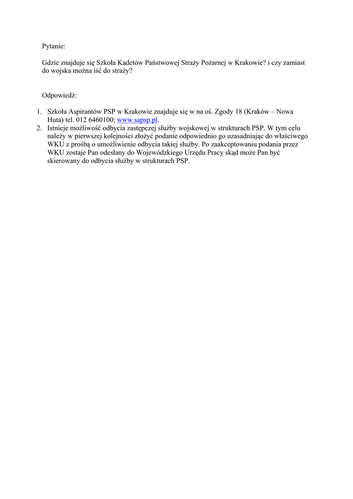 Pytanie: Gdzie znajduje się Szkoła Kadetów Państwowej Straży Pożarnej w Krakowie? i czy zamiast do wojska można iść do straży? Odpowiedź: 1. Szkoła Aspirantów PSP w Krakowie znajduje się w na oś. Zgody 18 (Kraków – Nowa Huta) tel. 012 6460100; www.sapsp.pl. 2. Istnieje możliwość odbycia zastępczej służby wojskowej w strukturach PSP. W tym celu należy w pierwszej kolejności złożyć podanie odpowiednio go uzasadniając do właściwego WKU z prośbą o umożliwienie odbycia takiej służby. Po zaakceptowaniu podania przez WKU zostaje Pan odesłany do Wojewódzkiego Urzędu Pracy skąd może Pan być skierowany do odbycia służby w strukturach PSP.