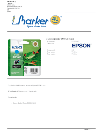 Marker4U.pl Boczna 5 62-800 Kalisz [email protected] Telefon: 884-760-760 gg: skype: Tusz Epson T0542 cyan Kod towaru: Producent: EPST0542 Dostępność: Cena netto: Cena brutto: 24h 79.24 zł 97.46 zł Oryginalny błękitny tusz, atrament Epson T0542 cyan Wydajność: 400 stron przy 5% pokryciu, Urządzenia: Epson Stylus Photo R1800, R800 strona 1 / 1 Powered by TCPDF (www.tcpdf.org)