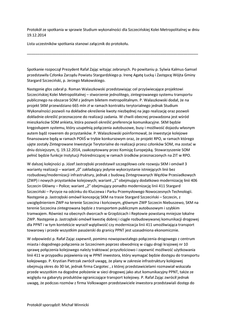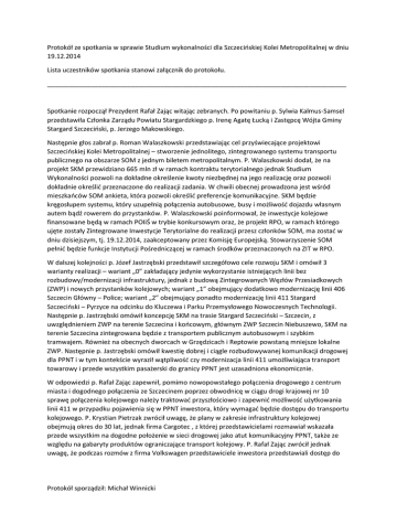 Protokół ze spotkania w sprawie Studium wykonalności dla Szczecińskiej Kolei Metropolitalnej w dniu 19.12.2014 Lista uczestników spotkania stanowi załącznik do protokołu. __________________________________________________________________________________ Spotkanie rozpoczął Prezydent Rafał Zając witając zebranych. Po powitaniu p. Sylwia Kalmus-Samsel przedstawiła Członka Zarządu Powiatu Stargardzkiego p. Irenę Agatę Łucką i Zastępcę Wójta Gminy Stargard Szczeciński, p. Jerzego Makowskiego. Następnie głos zabrał p. Roman Walaszkowski przedstawiając cel przyświecające projektowi Szczecińskiej Kolei Metropolitalnej – stworzenie jednolitego, zintegrowanego systemu transportu publicznego na obszarze SOM z jednym biletem metropolitalnym. P. Walaszkowski dodał, że na projekt SKM przewidziano 665 mln zł w ramach kontraktu terytorialnego jednak Studium Wykonalności pozwoli na dokładne określenie kwoty niezbędnej na jego realizację oraz pozwoli dokładnie określić przeznaczone do realizacji zadania. W chwili obecnej prowadzona jest wśród mieszkańców SOM ankieta, która pozwoli określić preferencje komunikacyjne. SKM będzie kręgosłupem systemu, który uzupełnią połączenia autobusowe, busy i możliwość dojazdu własnym autem bądź rowerem do przystanków. P. Walaszkowski poinformował, że inwestycje kolejowe finansowane będą w ramach POIiŚ w trybie konkursowym oraz, że projekt RPO, w ramach którego ujęte zostały Zintegrowane Inwestycje Terytorialne do realizacji przesz członków SOM, ma zostać w dniu dzisiejszym, tj. 19.12.2014, zaakceptowany przez Komisję Europejską. Stowarzyszenie SOM pełnić będzie funkcje Instytucji Pośredniczącej w ramach środków przeznaczonych na ZIT w RPO. W dalszej kolejności p. Józef Jastrzębski przedstawił szczegółowo cele rozwoju SKM i omówił 3 warianty realizacji – wariant „0” zakładający jedynie wykorzystanie istniejących linii bez rozbudowy/modernizacji infrastruktury, jednak z budową Zintegrowanych Węzłów Przesiadkowych (ZWP) i nowych przystanków kolejowych; wariant „1” obejmujący dodatkowo modernizację linii 406 Szczecin Główny – Police; wariant „2” obejmujący ponadto modernizację linii 411 Stargard Szczeciński – Pyrzyce na odcinku do Kluczewa i Parku Przemysłowego Nowoczesnych Technologii. Następnie p. Jastrzębski omówił koncepcję SKM na trasie Stargard Szczeciński – Szczecin, z uwzględnieniem ZWP na terenie Szczecina i końcowym, głównym ZWP Szczecin Niebuszewo, SKM na terenie Szczecina zintegrowana będzie z transportem publicznym autobusowym i szybkim tramwajem. Również na obecnych dworcach w Grzędzicach i Reptowie powstaną mniejsze lokalne ZWP. Następnie p. Jastrzębski omówił kwestię dobrej i ciągle rozbudowywanej komunikacji drogowej dla PPNT i w tym kontekście wyraził wątpliwość czy modernizacja linii 411 umożliwiająca transport towarowy i przede wszystkim pasażerski do granicy PPNT jest uzasadniona ekonomicznie. W odpowiedzi p. Rafał Zając zapewnił, pomimo nowopowstałego połączenia drogowego z centrum miasta i dogodnego połączenia ze Szczecinem poprzez obwodnicę w ciągu drogi krajowej nr 10 sprawę połączenia kolejowego należy traktować przyszłościowo i zapewnić możliwość użytkowania linii 411 w przypadku pojawienia się w PPNT inwestora, który wymagać będzie dostępu do transportu kolejowego. P. Krystian Pietrzak zwrócił uwagę, że plany w zakresie infrastruktury kolejowej obejmują okres do 30 lat, jednak firma Cargotec , z której przedstawicielami rozmawiał wskazała przede wszystkim na dogodne położenie w sieci drogowej jako atut komunikacyjny PPNT, także ze względu na gabaryty produktów ograniczające transport kolejowy. P. Rafał Zając zwrócił jednak uwagę, że podczas rozmów z firma Volkswagen przedstawiciele inwestora przedstawiali dostęp do Protokół sporządził: Michał Winnicki infrastruktury kolejowej jako jeden z elementów kluczowych dla powodzenia ich projektu inwestycyjnego i w związku z tym należy planować możliwość wykorzystania linii 411 w przyszłości. P. Jastrzębski stwierdzając, że możliwość transportu kolejowego niewątpliwie zwiększy atrakcyjność oferty PPNT zapytał czy konieczna jest budowa bocznicy do PPNT. Na co p. Elżbieta Bałaban odpowiedziała, że konieczna będzie jedynie modernizacja linii z możliwością przyszłej budowy bocznicy zależnie od oczekiwań przyszłych inwestorów. P. Bałaban zwróciła również uwagę na konieczność przebudowy wiaduktu na ul. Różanej i zapytała o przesłanki do lokalizacji przystanku na ul. Broniewskiego przy ul. Iwaszkiewicza. P. Jastrzębski stwierdził, że lokalizacja przystanku jest jedynie propozycją i miasto ustali dokładną lokalizację we własnym zakresie. P. Stanisław Kazimierski omówił konkursową koncepcję zagospodarowania os. Giżynek, która dokładnie określa lokalizację przystanku kolejowego. P. Rafał Zając poinformował wykonawców Studium, że w Urzędzie Miejskim funkcjonuje zespół ds. konsultacji projektu SKM, którego koordynatorem jest p. Kalmus-Samsel. Następnie p. Bałaban omówiła koncepcję ZWP w Stargardzie, która obejmuje stworzenie centrum integrującego transport publiczny na terenach przy ul. Towarowej, natomiast parkingi Park&Ride dla samochodów indywidualnych na terenach uprzednio użytkowanych jako torowisko postojowe przy ul. Barnima i zaproponowała ujęcie powyższej koncepcji w Studium wykonalności SKM. P. Walaszkowski zapewnił, że wariantowe zapisy o modernizacji linii 411 oraz o koncepcji rozdzielenia ZWP i parkingów Park&Ride zostaną ujęte w Studium jednak zwiększą wartość całego projektu SKM. Następnie p. Grzegorz Zasadzki przedstawił stan zaawansowania prac na linii Szczecin – Poznań. Studium wykonalności zakłada dostosowanie linii do prędkości 160 km/h poza obszarami Natura 2000 gdzie dostosowanie do wy