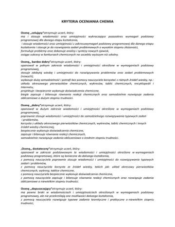 KRYTERIA OCENIANIA CHEMIA Ocenę ,,celujący”otrzymuje uczeń, który: ma i stosuje wiadomości oraz umiejętności wykraczające pozazakres wymagań podstawy programowej dla danego etapu kształcenia, i stosuje wiadomości oraz umiejętności z zakresuwymagań podstawy programowej dla danego etapu kształcenia i stosuje je do rozwiązania zadań problemowych o wysokim stopniu złożoności, formułuje problemy oraz dokonuje analizy i syntezy nowych zjawisk, osiąga sukcesy w konkursach chemicznych na szczeblu wyższym niż szkolny. Ocenę,, bardzo dobry”otrzymuje uczeń, który: opanował w pełnym zakresie wiadomości i umiejętności określone w wymaganiach podstawy programowej, stosuje zdobytą wiedzę i umiejętności do rozwiązywania problemów oraz zadań problemowych (nowych), wykazuje dużą samodzielność i potrafi bez pomocy nauczyciela korzystać z różnych źródeł wiedzy, np.: układu okresowego pierwiastków chemicznych, wykresów, tablic chemicznych, encyklopedii i Internetu, projektuje i bezpiecznie wykonuje doświadczenia chemiczne, biegle zapisuje i bilansuje równania reakcji chemicznych oraz samodzielnie rozwiązuje zadania obliczeniowe o dużym stopniu trudności. Ocenę ,,dobry”otrzymuje uczeń, który: opanował w dużym zakresie wiadomości i umiejętności określone w wymaganiach podstawy programowej, poprawnie stosuje wiadomości i umiejętności do samodzielnego rozwiązywania typowych zadań i problemów, korzysta z układu okresowego pierwiastków chemicznych, wykresów, tablic chemicznych i innych źródeł wiedzy chemicznej, bezpiecznie wykonuje doświadczenia chemiczne, zapisuje i bilansuje równania reakcji chemicznych, samodzielnie rozwiązuje zadania obliczeniowe o średnim stopniu trudności. ,Ocenę,, dostateczny”otrzymuje uczeń, który: opanował w zakresie podstawowym te wiadomości i umiejętności określone w wymaganiach podstawy programowej, które są konieczne do dalszego kształcenia, z pomocą nauczyciela poprawnie stosuje wiadomości i umiejętności do rozwiązywania typowych zadań i problemów, z pomocą nauczyciela korzysta ze źródeł wiedzy, takich jak: układ okresowy pierwiastków chemicznych, wykresy, tablice chemiczne, z pomocą nauczyciela bezpiecznie wykonuje doświadczenia chemiczne, z pomocą nauczyciela zapisuje i bilansuje równania reakcji chemicznych oraz rozwiązuje zadania obliczeniowe o niewielkim stopniu trudności. Ocenę ,,dopuszczający”otrzymuje uczeń, który: ma pewne braki w wiadomościach i umiejętnościach określonych w wymaganiach podstawy programowej, ale nie przekreślają one możliwości dalszego kształcenia, z pomocą nauczyciela rozwiązuje typowe zadania teoretyczne i praktyczne o niewielkim stopniu trudności, z pomocą nauczyciela bezpiecznie wykonuje proste doświadczenia chemiczne, zapisuje proste wzory i równania reakcji chemicznych. Ocenę „niedostateczny”otrzymuje uczeń, który: Ocenę tę otrzymuje uczeń, który nie opanował podstawowych wiadomości i umiejętności wynikających z programu nauczania oraz: popełnia rażące błędy w rachunkach,nie potrafi (nawet przy pomocy nauczyciela, który między innymi zadaje pytania pomocnicze) wykonać najprostszych ćwiczeń i zadań,nie wykazuje najmniejszych chęci współpracy w celu uzupełnienia braków i nabycia podstawowej wiedzy i umiejętności. Kryteria ocen wypowiedzi ustnych: Ocena „celujący” - odpowiedź wskazuje na szczególne zainteresowanie przedmiotem, spełniając kryteria oceny bardzo dobrej, wykracza poza obowiązujący program nauczania, zawiera treści poza programowe, własne przemyślenia i oceny. Ocena „bardzo dobry” - odpowiedź wyczerpująca, zgodna z programem, swobodne operowanie faktami i dostrzeganie związków między nimi. Ocena „dobry” - odpowiedź zasadniczo samodzielna, zawiera większość wymaganych treści, poprawna pod względem języka, nieliczne błędy, nie wyczerpuje zagadnienia. Ocena „dostateczny” - uczeń zna najważniejsze fakty, umie je zinterpretować, odpowiedź odbywa się przy niewielkiej pomocy nauczyciela, występują nieliczne błędy rzeczowe. Ocena „dopuszczający” - podczas odpowiedzi możliwe są liczne błędy, zarówno w zakresie wiedzy merytorycznej jak i w sposobie jej prezentowania, uczeń zna podstawowe fakty i przy pomocy nauczyciela udziela odpowiedzi. Ocena „niedostateczny” - odpowiedź nie spełnia wymagań podanych powyżej kryteriów ocen pozytywnych (brak elementarnych wiadomości, rezygnacja z odpowiedzi). Kryteria oceny wypowiedzi pisemnych (zadania domowe, prace kontrolne, kartkówki, sprawdziany, prace klasowe). Ocena „bardzo dobry” – Uzyskanie co najmniej 90% możliwych do uzyskania punktów. Ocena „dobry” – Uzyskanie 75-89% możliwych do uzyskania punktów. Ocena „dostateczny” – Uzyskanie 50 -74% możliwych do uzyskania punktów. Ocena „dopuszczający” – Uzyskanie 30 -49% możliwych do uzyskania punktów. Ocena „niedostateczny” – Uzyskanie 0-29% możliwych do uzyskania punktów. Zasady przeprowadzania prac pisemnych: • kartkówka obejmująca materiał ostatniej lekcji lub zadanie domowe nie musi być zapowiedziana, kartkówka trwa około 10 minut, • sprawdzian obejmujący materiał 3-5 ostatnich lekcji powinien być zapowiedziany z wyprzedzeniem przynajmniej jednej lekcji, sprawdzian trwa od 15-20 minut, • zadanie klasowe obejmujące materiał całego działu musi być zapowiedziane z przynajmniej tygodniowym wyprzedzeniem, poprzedzone powtórzeniem wiadomości i jego termin uzgodniony z klasą, aby nie pokrywał się z terminem już zapowiedzianej pracy pisemnej, zadanie klasowe uczniowie piszą przez całą lekcję. Zasady poprawiania prac pisemnych: • na lekcji powtórzeniowej uczeń może poprawić kartkówki lub sprawdziany dotyczące aktualnie powtarzanego materiału • jeśli uczeń nie pisał kartkówki lub sprawdzianu ma obowiązek je zaliczyć w terminie uzgodnionym z na