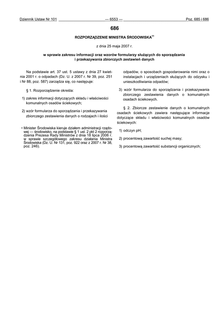 Dziennik Ustaw Nr 101 _______________________— 6553 — _______________________________Poz. 685 i 686 686 11 ROZPORZĄDZENIE MINISTRA ŚRODOWISKA z dnia 25 maja 2007 r. w sprawie zakresu informacji oraz wzorów formularzy słuŜących do sporządzania i przekazywania zbiorczych zestawień danych Na podstawie art. 37 ust. 5 ustawy z dnia 27 kwietnia 2001 r. o odpadach (Dz. U. z 2007 r. Nr 39, poz. 251 i Nr 88, poz. 587) zarządza się, co następuje: § 1. Rozporządzenie określa: 1) zakres informacji dotyczących składu i właściwości komunalnych osadów ściekowych; 2) wzór formularza do sporządzania i przekazywania zbiorczego zestawienia danych o rodzajach i ilości • Minister Środowiska kieruje działem administracji rządowej — środowisko, na podstawie § 1 ust. 2 pkt 2 rozporządzenia Prezesa Rady Ministrów z dnia 18 lipca 2006 r. w sprawie szczegółowego zakresu działania Ministra Środowiska (Dz. U. Nr 131, poz. 922 oraz z 2007 r. Nr 38, poz. 246). odpadów, o sposobach gospodarowania nimi oraz o instalacjach i urządzeniach słuŜących do odzysku i unieszkodliwiania odpadów; 3) wzór formularza do sporządzania i przekazywania zbiorczego zestawienia danych o komunalnych osadach ściekowych. § 2. Zbiorcze zestawienie danych o komunalnych osadach ściekowych zawiera następujące informacje dotyczące składu i właściwości komunalnych osadów ściekowych: 1) odczyn pH; 2) procentową zawartość suchej masy; 3) procentową zawartość substancji organicznych; Dziennik Ustaw Nr 101 — 6554 — 4) procentową zawartość azotu ogólnego, w tym azotu amonowego, w suchej masie; 5) procentową zawartość fosforu ogólnego w suchej masie; Poz. 686 § 3. 1. Wzór formularza do sporządzania i przekazywania zbiorczego zestawienia danych o rodzajach i ilości odpadów, o sposobach gospodarowania nimi oraz o instalacjach i urządzeniach słuŜących do odzysku i unieszkodliwiania odpadów jest określony w załączniku nr 1 do rozporządzenia. 6) procentową zawartość wapnia w suchej masie; 7) procentową zawartość magnezu w suchej masie; 8) liczbę Ŝywych jaj pasoŜytów jelitowych Ascaris sp., Trichuńs sp., Toxocera sp. w suchej masie; 9) zawartość metali cięŜkich: ołowiu, kadmu, chromu, miedzi, niklu, rtęci i cynku w mg/kg suchej masy; 10) postać komunalnych osadów ściekowych; 11) masę wytworzonych osadów; 2. Wzór formularza do sporządzania i przekazywania zbiorczego zestawienia danych o komunalnych osadach ściekowych jest określony w załączniku nr 2 do rozporządzenia. § 4. Traci moc rozporządzenie Ministra Środowiska z dnia 11 grudnia 2001 r. w sprawie zakresu informacji oraz wzorów formularzy słuŜących do sporządzania i przekazywania zbiorczych zestawień danych (Dz. U. Nr 152, poz. 1737). § 5. Rozporządzenie wchodzi w Ŝycie z dniem 1 stycznia 2008 r. 12) suchą masę wytworzonych osadów. Minister Środowiska: J. Szyszko — 6555 — Dziennik Ustaw Nr 101 Poz. 686 Załączniki do rozporządzenia Ministra Środowiska z dnia 25 maja 2007 r. (poz. 686) Załącznik nr 1 WZÓR FORMULARZA DO SPORZĄDZANIA I PRZEKAZYWANIA ZBIORCZEGO ZESTAWIENIA DANYCH O RODZAJACH I ILOŚCI ODPADÓW, O SPOSOBACH GOSPODAROWANIA NIMI ORAZ O INSTALACJACH I URZĄDZENIACH SŁUśĄCYCH DO ODZYSKU I UNIESZKODLIWIANIA ODPADÓW Dział 1. Dane o posiadaczu odpadów Rok sprawozdawczy Dane o posiadaczu odpadów Posiadacz odpadów1) Telefon/faks REGON3) NIP3) Decyzja w zakresie gospodarki odpadami Adres2) Znak decyzji Data wydania Termin waŜności Organ wydający Wytwarzanie odpadów Zbieranie odpadów Odzysk Unieszkodliwianie odpadów Miejsce prowadzenia działalności Adres4) Gmina5) Data rozpoczęcia prowadzenia działalności Data zakończenia prowadzenia działalności (jeśli dotyczy) Rodzaj prowadzonej działalności6) W Zb Od Un Rodzaj prowadzonej działalności według klasyfikacji PKD 7) Dane o posiadaczu odpadów prowadzącym zakład przetwarzania Nr rejestrowy8) Numer i nazwa grupy sprzętu9) Numer i nazwa rodzaju sprzętu 9) Dział 2. Zbiorcze zestawienie danych o rodzajach i ilościach wytworzonych odpadów10) Lp. Kod odpadów Rodzaj odpadów Masa wytworzonych odpadów [Mg]12) masa odpadów sucha masa odpadów Dziennik Ustaw Nr 101 — 6556 — Poz. 686 Dział 3. Zbiorcze zestawienie danych o rodzajach i ilościach odebranych odpadów komunalnych11) Lp. Kod odpadów Rodzaj odpadów Masa odebranych odpadów [Mg]l2) ogółem masa odpadów sucha masa odpadów z gospodarstw domowych masa sucha masa odpadów odpadów Liczba obsługiwanych właścicieli nieruchomości13) ogółem w tym gospodarstw domowych Dział 4. Zbiorcze zestawienie danych o rodzajach i ilościach zebranych odpadów Lp. Kod Rodzaj odpadów Masa odpadów [Mg]12) odpadów masa odpadów sucha masa odpadów Dział 5. Zbiorcze zestawienie danych o rodzajach i ilościach odpadów poddanych odzyskowi a) Zbiorcze zestawienie danych o rodzajach i ilościach odpadów poddanych odzyskowi w instalacjach lub urządzeniach Lp. Kod odpadów Rodzaj odpadów Masa odpadów [Mg]12) masa odpadów Proces odzysku R14) sucha masa odpadów b) Zbiorcze zestawienie danych o rodzajach i ilościach odpadów poddanych odzyskowi poza instalacjami i urządzeniami Lp. Kod odpadów Rodzaj odpadów Masa odpadów [Mg]12) masa odpadów sucha masa odpadów Proces odzysku R14) Lp.15) R14) c) Zbiorcze zestawienie danych o rodzajach i ilościach odpadów przekazanych w celu ich wykorzystania osobom fizycznym lub jednostkom organizacyjnym, niebędącym przedsiębiorcami, na ich własne potrzeby Lp. Kod odpadów Rodzaj odpadów Masa odpadów [Mg]12) masa odpadów sucha masa odpadów Proces odzysku Lp.16) R14) Dział 6. Zbiorcze zestawienie danych o rodzajach i ilościach unieszkodliwionych odpadów a) Zbiorcze zestawienie danych o rodzajach i ilościach unieszkodliwionych odpadów w instalacjach lub urządzeniach Lp. Kod odpadów Rodzaj odpadów Masa odpadów [Mg]12) masa odpadów sucha masa odpadów Proces unieszkodliwiania 