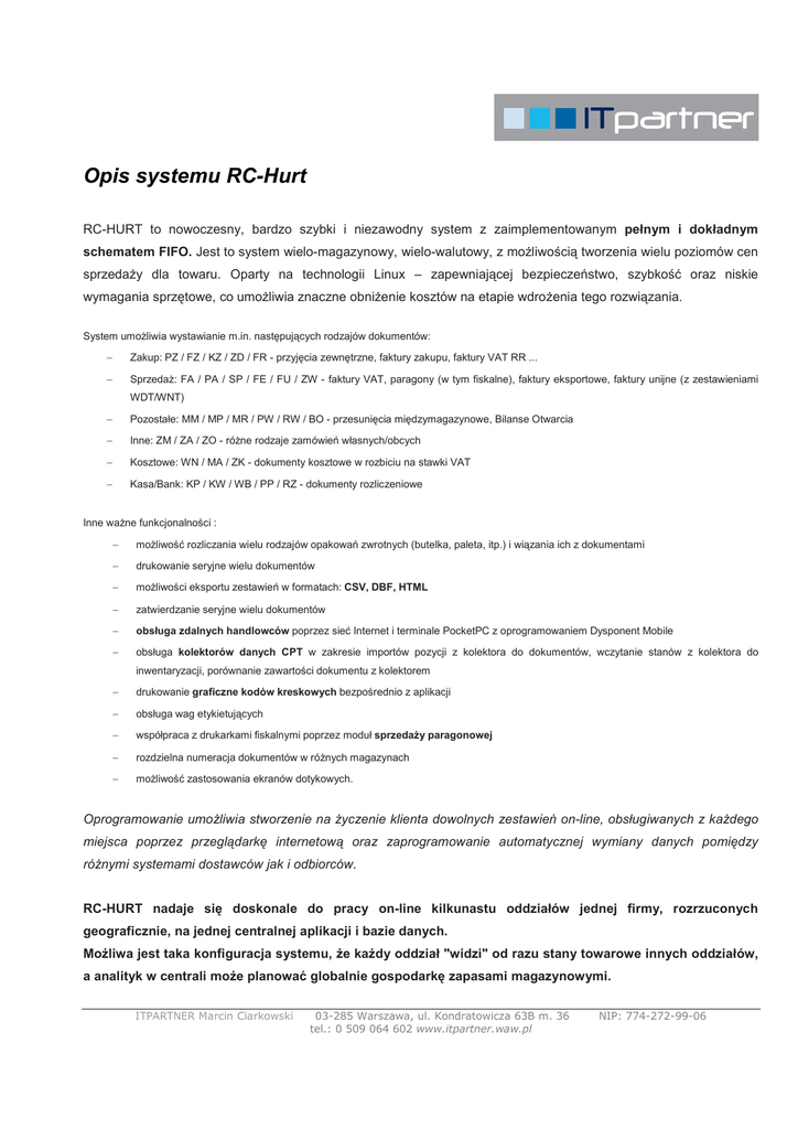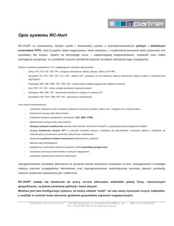 Opis systemu RC-Hurt RC-HURT to nowoczesny, bardzo szybki i niezawodny system z zaimplementowanym pełnym i dokładnym schematem FIFO. Jest to system wielo-magazynowy, wielo-walutowy, z moŜliwością tworzenia wielu poziomów cen sprzedaŜy dla towaru. Oparty na technologii Linux – zapewniającej bezpieczeństwo, szybkość oraz niskie wymagania sprzętowe, co umoŜliwia znaczne obniŜenie kosztów na etapie wdroŜenia tego rozwiązania. System umoŜliwia wystawianie m.in. następujących rodzajów dokumentów: − Zakup: PZ / FZ / KZ / ZD / FR - przyjęcia zewnętrzne, faktury zakupu, faktury VAT RR ... − SprzedaŜ: FA / PA / SP / FE / FU / ZW - faktury VAT, paragony (w tym fiskalne), faktury eksportowe, faktury unijne (z zestawieniami WDT/WNT) − Pozostałe: MM / MP / MR / PW / RW / BO - przesunięcia międzymagazynowe, Bilanse Otwarcia − Inne: ZM / ZA / ZO - róŜne rodzaje zamówień własnych/obcych − Kosztowe: WN / MA / ZK - dokumenty kosztowe w rozbiciu na stawki VAT − Kasa/Bank: KP / KW / WB / PP / RZ - dokumenty rozliczeniowe Inne waŜne funkcjonalności : − moŜliwość rozliczania wielu rodzajów opakowań zwrotnych (butelka, paleta, itp.) i wiązania ich z dokumentami − drukowanie seryjne wielu dokumentów − moŜliwości eksportu zestawień w formatach: CSV, DBF, HTML − zatwierdzanie seryjne wielu dokumentów − obsługa zdalnych handlowców poprzez sieć Internet i terminale PocketPC z oprogramowaniem Dysponent Mobile − obsługa kolektorów danych CPT w zakresie importów pozycji z kolektora do dokumentów, wczytanie stanów z kolektora do inwentaryzacji, porównanie zawartości dokumentu z kolektorem − drukowanie graficzne kodów kreskowych bezpośrednio z aplikacji − obsługa wag etykietujących − współpraca z drukarkami fiskalnymi poprzez moduł sprzedaŜy paragonowej − rozdzielna numeracja dokumentów w róŜnych magazynach − moŜliwość zastosowania ekranów dotykowych. Oprogramowanie umoŜliwia stworzenie na Ŝyczenie klienta dowolnych zestawień on-line, obsługiwanych z kaŜdego miejsca poprzez przeglądarkę internetową oraz zaprogramowanie automatycznej wymiany danych pomiędzy róŜnymi systemami dostawców jak i odbiorców. RC-HURT nadaje się doskonale do pracy on-line kilkunastu oddziałów jednej firmy, rozrzuconych geograficznie, na jednej centralnej aplikacji i bazie danych. MoŜliwa jest taka konfiguracja systemu, Ŝe kaŜdy oddział "widzi" od razu stany towarowe innych oddziałów, a analityk w centrali moŜe planować globalnie gospodarkę zapasami magazynowymi. ITPARTNER Marcin Ciarkowski 03-285 Warszawa, ul. Kondratowicza 63B m. 36 tel.: 0 509 064 602 www.itpartner.waw.pl NIP: 774-272-99-06