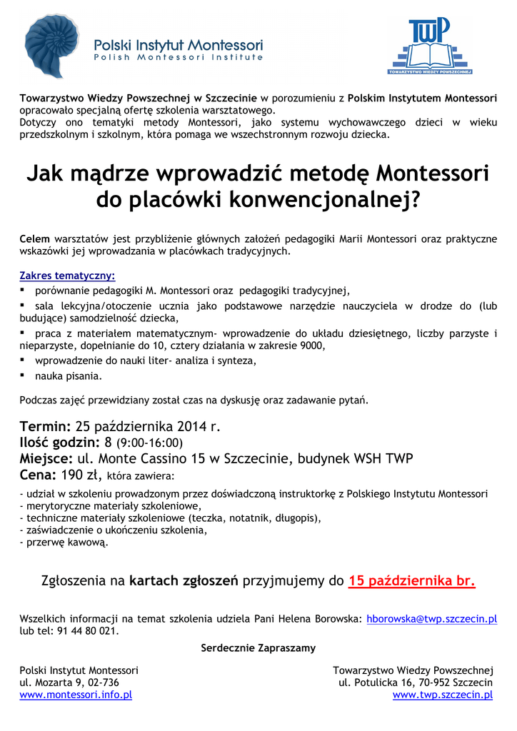 Towarzystwo Wiedzy Powszechnej w Szczecinie w porozumieniu z Polskim Instytutem Montessori opracowało specjalną ofertę szkolenia warsztatowego. Dotyczy ono tematyki metody Montessori, jako systemu wychowawczego dzieci w wieku przedszkolnym i szkolnym, która pomaga we wszechstronnym rozwoju dziecka. Jak mądrze wprowadzić metodę Montessori do placówki konwencjonalnej? Celem warsztatów jest przybliżenie głównych założeń pedagogiki Marii Montessori oraz praktyczne wskazówki jej wprowadzania w placówkach tradycyjnych. Zakres tematyczny: ▪ porównanie pedagogiki M. Montessori oraz pedagogiki tradycyjnej, ▪ sala lekcyjna/otoczenie ucznia jako podstawowe narzędzie nauczyciela w drodze do (lub budujące) samodzielność dziecka, ▪ praca z materiałem matematycznym- wprowadzenie do układu dziesiętnego, liczby parzyste i nieparzyste, dopełnianie do 10, cztery działania w zakresie 9000, ▪ wprowadzenie do nauki liter- analiza i synteza, ▪ nauka pisania. Podczas zajęć przewidziany został czas na dyskusję oraz zadawanie pytań. Termin: 25 października 2014 r. Ilość godzin: 8 (9:00-16:00) Miejsce: ul. Monte Cassino 15 w Szczecinie, budynek WSH TWP Cena: 190 zł, która zawiera: - udział w szkoleniu prowadzonym przez doświadczoną instruktorkę z Polskiego Instytutu Montessori merytoryczne materiały szkoleniowe, techniczne materiały szkoleniowe (teczka, notatnik, długopis), zaświadczenie o ukończeniu szkolenia, przerwę kawową. Zgłoszenia na kartach zgłoszeń przyjmujemy do 15 października br. Wszelkich informacji na temat szkolenia udziela Pani Helena Borowska: [email protected] lub tel: 91 44 80 021. Serdecznie Zapraszamy Polski Instytut Montessori ul. Mozarta 9, 02-736 www.montessori.info.pl Towarzystwo Wiedzy Powszechnej ul. Potulicka 16, 70-952 Szczecin www.twp.szczecin.pl
