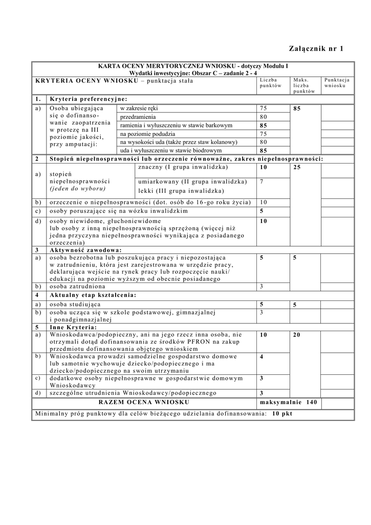 Załącznik nr 1 KARTA OCENY MERYTORYCZNEJ WNIOSKU - dotyczy Modułu I Wydatki inwestycyjne: Obszar C – zadanie 2 - 4 Lic zba Maks. K RY T E RI A O C EN Y W NIO SK U – p u n k tacj a s t ała punktów 1. K ry ter ia pref ere ncy j ne : a) Oso b a ub i e gaj ąca si ę o d o fi na n so wa n i e z ao p at r ze n ia w p ro t ezę n a I I I p o zio mi e j a ko ści , p rz y a mp u tacj i : 2 a) w zakresie ręki przedramienia ramienia i wyłuszczeniu w stawie barkowym na poziomie podudzia na wysokości uda (także przez staw kolanowy) uda i wyłuszczeniu w stawie biodrowym Sto p ie ń ni ep eł no sp ra w no ś ci l ub o rze cze n ie ró w no w a żne, za kre s zn acz n y (I gr up a i n wa l i d zk a) sto p ie ń ni ep e ł no sp r a wn o śc i u mi ar ko wa n y (II gr up a i n wal id z ka ) (jed en d o w yb o r u ) le k ki ( III gr up a i n wal id zk a) 75 85 80 85 75 80 85 nie p ełn o s pra w no ś ci: 10 25 7 b) c) o rzecz e ni e o ni ep e ł no sp r a wn o śc i ( d o t. o só b d o 1 6 - go ro k u ż yc ia) o so b y p o r u szaj ą ce si ę n a wó z k u i n wal id z k i m 10 5 d) o so b y ni e wi d o me, gł uc h o ni e wi d o me lub o so b y z i n ną n iep e ł n o sp r a wn o ś ci ą sp rzę żo ną ( wię cej ni ż j ed na p r z ycz yn a ni ep e ł n o sp r a wn o ś ci wyn i k aj ąca z p o s iad a ne go o rzecz e ni a) A kty w n o ś ć za w o do w a : o so b a b ezr o b o t na l u b p o sz u k uj ąc a p rac y i n iep o z o st aj ąca w za tr ud ni e ni u, któ r a j est zar ej e s tr o wa n a w urzę d zie p r ac y, d ek lar uj ąc a wej śc ie n a r yn e k p r ac y l ub ro z p o czę cie n a u ki / ed u k acj i na p o zio mie wyż sz y m o d o b e c nie p o s i ad a ne go o so b a zatr u d nio na A kt ua l ny et a p kszt a łc e nia : o so b a s t ud i uj ąca o so b a u czą ca si ę w s z ko le p o d st a wo wej , gi mn a zj al nej i p o nad gi mn azj a l nej In ne K ry t eria : W nio s ko d a wc a/p o d o p iec zn y, a ni na j e go r zec z i n na o so b a, ni e o trz y ma li d o tąd d o fi na n so wa n ia ze śro d kó w P F RO N na za k up p rzed mio t u d o f i na n so wa ni a o b j ęt e go wn i o s kie m W nio s ko d a wc a p r o wad z i sa mo d zi el ne go sp o d ar st wo d o mo we lub s a mo t n ie wyc ho wuj e d zie c ko /p o d o p iec z ne go i ma d ziec ko /p o d o p i ecz n e go na s wo i m u tr z y ma ni u d o d at ko we o so b y ni ep eł no sp r a wn e w go sp o d ar st wi e d o mo wy m W nio s ko d a wc y szc ze gó l ne u tr ud nie n ia W nio s ko d a wc y/ p o d o p i ec zn e go RA ZEM O C EN A WN I O SK U 10 3 a) b) 4 a) b) 5 a) b) c) d) liczba punktów 5 5 3 5 3 5 10 20 4 3 3 ma ks y ma l n ie 1 4 0 Mi ni mal n y p ró g p u n kto wy d l a ce ló w b ie żąc e go ud z ie la ni a d o fi na n so wa n ia: 1 0 p kt Punktacja wn i o s k u Załącznik nr 2 K AR T A O C E NY M ER YT O R YC ZN E J W N IO S K U - do ty c zy M o du łu I Wydatki bieżące: Obszar A – zadanie 2, Obszar B – zadanie 2, Obszar D Lic zba Maks. K RY T E RI A O C EN Y W NIO SK U – p u n k tacj a s t ała punktów liczba punktów a) Sto p ie ń ni ep eł no sp ra w no ś ci l ub o rze cze n ie ró w no w a żne, za kre s nie p ełn o s pra w no ś ci: zn acz n y (I gr up a i n wa l i d zk a) 10 35 sto p ie ń ni ep e ł no sp r a wn o śc i u mi ar ko wa n y (II gr up a i n wal id z ka ) 7 (jed en d o w yb o ru ) b) o rzecz e ni e o ni ep e ł no sp r a wn o śc i ( d o t. o só b d o 1 6 - go ro k u ż yc ia) 10 c) o so b a z d ys f u n k cj ą nar z ąd u r uc h u ( 0 5 - R) lub (1 0 -N) i ( 1 2 - C) p o t wi er d zo ne za ś wi ad c ze ni e m le k arz a sp ecj a li st y, i ż na st ęp s t we m s c ho r ze ń s ta no wi ąc y ch p o d s ta wę wyd a ni a o r z ecz e nia j es t d ys f u n kcj a n arząd u r uc h u o so b y p o r u szaj ą ce si ę n a wó z k u i n wal id z k i m 10 o so b y ni e wi d o me, gł uc h o ni e wi d o me lub o so b y z i n ną n iep e ł n o sp r a wn o ś ci ą sp rzę żo ną ( wię cej ni ż j ed na p r z ycz yn a ni ep e ł n o sp r a wn o ś ci wyn i k aj ąca z p o s iad a ne go o rzecz e ni a) A kty w n o ś ć za w o do w a : o so b a b ezr o b o t na l u b p o sz u k uj ąc a p rac y i n iep o z o st aj ąca w za tr ud ni e ni u, któ r a j est zar ej e s tr o wa n a w urzę d zie p r ac y, d ek lar uj ąc a wej śc ie n a r yn e k p r ac y l ub ro z p o czę cie n a u ki / ed u k acj i na p o zio mie wyż sz y m o d o b e c nie p o s i ad a ne go o so b a zatr u d nio na 10 1 d) e) 2 a) b) 3 a) b) 4 a) b) c) d) A kt ua l ny et a p kszt a łc e nia : o so b a s t ud i uj ąca o so b a u czą ca si ę w s z ko le p o d st a wo wej , gi mn a zj al nej i p o nad gi mn azj a l nej In ne K ry t eria : W nio s ko d a wc a/p o d o p iec zn y, a ni na j e go r zec z i n na o so b a, ni e o trz y ma li d o tąd d o fi na n so wa n ia ze śro d kó w P F RO N na za k up p rzed mio t u d o f i na n so wa ni a o b j ęt e go wn i o s kie m W nio s ko d a wc a p r o wad z i sa mo d zi el ne go sp o d ar st wo d o mo we l ub sa mo t ni e wyc h o wu j e d z i ec ko /p o d o p iec z ne go i m a d ziec ko /p o d o p i ecz n e go na s w o i m u tr z y ma ni u d o d at ko we o so b y ni ep eł no sp r a wn e w go sp o d ar st wi e d o mo wy m W nio s ko d a wc y szc ze gó l ne u tr ud nie n ia W nio s ko d a wc y/ p o d o p i ec zn e go RA ZEM O C EN A WN I O SK U 5 5 5 3 5 3 5 10 20 4 3 3 ma ks y ma l n ie 6 5 Mi ni mal n y p ró g p u n kto wy d l a ce ló w b ie żąc e go ud z ie la ni a d o fi na n so wa n ia: 1 0 p kt Punktacja wn i o s k u