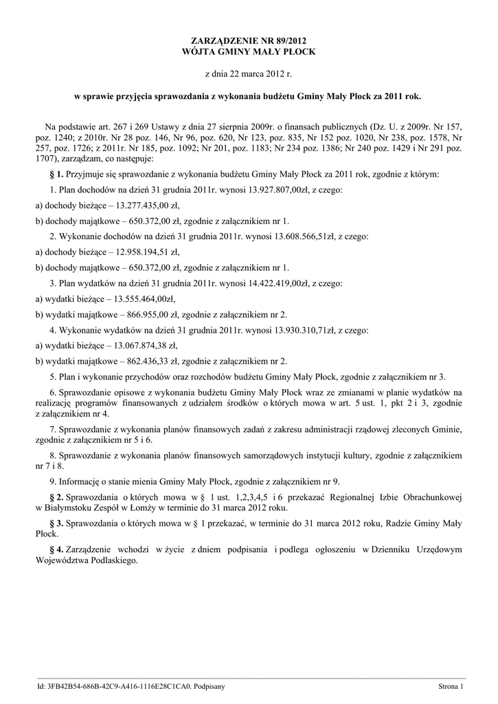 ZARZĄDZENIE NR 89/2012 WÓJTA GMINY MAŁY PŁOCK z dnia 22 marca 2012 r. w sprawie przyjęcia sprawozdania z wykonania budżetu Gminy Mały Płock za 2011 rok. Na podstawie art. 267 i 269 Ustawy z dnia 27 sierpnia 2009r. o finansach publicznych (Dz. U. z 2009r. Nr 157, poz. 1240; z 2010r. Nr 28 poz. 146, Nr 96, poz. 620, Nr 123, poz. 835, Nr 152 poz. 1020, Nr 238, poz. 1578, Nr 257, poz. 1726; z 2011r. Nr 185, poz. 1092; Nr 201, poz. 1183; Nr 234 poz. 1386; Nr 240 poz. 1429 i Nr 291 poz. 1707), zarządzam, co następuje: § 1. Przyjmuje się sprawozdanie z wykonania budżetu Gminy Mały Płock za 2011 rok, zgodnie z którym: 1. Plan dochodów na dzień 31 grudnia 2011r. wynosi 13.927.807,00zł, z czego: a) dochody bieżące – 13.277.435,00 zł, b) dochody majątkowe – 650.372,00 zł, zgodnie z załącznikiem nr 1. 2. Wykonanie dochodów na dzień 31 grudnia 2011r. wynosi 13.608.566,51zł, z czego: a) dochody bieżące – 12.958.194,51 zł, b) dochody majątkowe – 650.372,00 zł, zgodnie z załącznikiem nr 1. 3. Plan wydatków na dzień 31 grudnia 2011r. wynosi 14.422.419,00zł, z czego: a) wydatki bieżące – 13.555.464,00zł, b) wydatki majątkowe – 866.955,00 zł, zgodnie z załącznikiem nr 2. 4. Wykonanie wydatków na dzień 31 grudnia 2011r. wynosi 13.930.310,71zł, z czego: a) wydatki bieżące – 13.067.874,38 zł, b) wydatki majątkowe – 862.436,33 zł, zgodnie z załącznikiem nr 2. 5. Plan i wykonanie przychodów oraz rozchodów budżetu Gminy Mały Płock, zgodnie z załącznikiem nr 3. 6. Sprawozdanie opisowe z wykonania budżetu Gminy Mały Płock wraz ze zmianami w planie wydatków na realizację programów finansowanych z udziałem środków o których mowa w art. 5 ust. 1, pkt 2 i 3, zgodnie z załącznikiem nr 4. 7. Sprawozdanie z wykonania planów finansowych zadań z zakresu administracji rządowej zleconych Gminie, zgodnie z załącznikiem nr 5 i 6. 8. Sprawozdanie z wykonania planów finansowych samorządowych instytucji kultury, zgodnie z załącznikiem nr 7 i 8. 9. Informację o stanie mienia Gminy Mały Płock, zgodnie z załącznikiem nr 9. § 2. Sprawozdania o których mowa w § 1 ust. 1,2,3,4,5 i 6 przekazać Regionalnej Izbie Obrachunkowej w Białymstoku Zespół w Łomży w terminie do 31 marca 2012 roku. § 3. Sprawozdania o których mowa w § 1 przekazać, w terminie do 31 marca 2012 roku, Radzie Gminy Mały Płock. § 4. Zarządzenie wchodzi w życie z dniem podpisania i podlega ogłoszeniu w Dzienniku Urzędowym Województwa Podlaskiego. ————————————————————————————————————————————————————————— Id: 3FB42B54-686B-42C9-A416-1116E28C1CA0. Podpisany Strona 1 Wójt Gminy Mały Płock Józef Dymerski ————————————————————————————————————————————————————————— Id: 3FB42B54-686B-42C9-A416-1116E28C1CA0. Podpisany Strona 2 Załącznik Nr 1 do Zarządzenia Nr 89/2012 Wójta Gminy Mały Płock z dnia 22 marca 2012 r. Plan i wykonanie dochodów na dzień 31 grudnia 2011 roku. Dział Rozdział § 010 Nazwa Rolnictwo i łowiectwo 01010 98,93 12 491,00 900,00 7,21 491,00 0,00 0,00 12 000,00 900,00 7,50 Program rozwoju Obszarów Wiejskich 2007-2013 633 147,00 633 147,00 100,00 Środki na dofinansowanie własnych inwestycji gmin (związków gmin), powiatów (związków powiatów), samorządów województw, pozyskane z innych źródeł 633 147,00 633 147,00 100,00 Pozostała działalność 437 619,00 437 618,16 100,00 Dotacje celowe otrzymane z budżetu państwa na realizację zadań bieżących z zakresu administracji rządowej oraz innych zadań zleconych gminie (związkom gmin) ustawami 437 619,00 437 618,16 100,00 Leśnictwo 1 876,00 1 875,29 99,96 Gospodarka leśna 1 876,00 1 875,29 99,96 Dochody z najmu i dzierżawy składników majątkowych Skarbu Państwa, jednostek samorządu terytorialnego lub innych jednostek zaliczanych do sektora finansów publicznych oraz innych umów o podobnym charakterze 1 876,00 1 875,29 99,96 Transport i łączność 500,00 0,00 0,00 Drogi publiczne gminne 500,00 0,00 0,00 Wpływy z różnych dochodów 500,00 0,00 0,00 Gospodarka mieszkaniowa 80 277,00 74 125,67 92,34 Gospodarka gruntami i nieruchomościami 80 277,00 74 125,67 92,34 1 700,00 1 404,21 82,60 Pozostałe odsetki 0970 Wpływy z różnych dochodów 01095 2010 020 02001 0750 600 60016 0970 700 70005 % wykonania 1 071 665,16 0920 6297 Wykonanie na 31.12.2011 r. 1 083 257,00 Infrastruktura wodociągowa i sanitacyjna wsi 01041 Plan dochodów na 31.12.2011 r. 0470 Wpływy z opłat za zarząd, użytkowanie i użytkowanie wieczyste nieruchomości 0750 Dochody z najmu i dzierżawy składników majątkowych Skarbu Państwa, jednostek samorządu terytorialnego lub innych jednostek zaliczanych do sektora finansów publicznych oraz innych umów o podobnym charakterze 61 352,00 55 496,46 90,46 0760 Wpływy z tytułu przekształcenia prawa użytkowania wieczystego przysługującego osobom fizycznym w prawo własności 17 225,00 17 225,00 100,00 107 024,00 102 141,00 95,44 Urzędy wojewódzkie 73 400,00 73 010,85 99,47 2010 Dotacje celowe otrzymane z budżetu państwa na realizację zadań bieżących z zakresu administracji rządowej oraz innych zadań zleconych gminie (związkom gmin) ustawami 73 000,00 73 000,00 100,00 2030 Dotacje celowe otrzymane z budżetu państwa na realizację własnych zadań bieżących gmin (związków gmin) 400,00 0,00 0,00 750 Administracja publiczna 75011 ————————————————————————————————————————————————————————— Id: 3FB42B54-686B-42C9-A416-1116E28C1CA0. Podpisany Strona 1 2360 Dochody jednostek samorządu terytorialnego związane z realizacją zadań z zakresu administracji rządowej oraz innych zadań zleconych