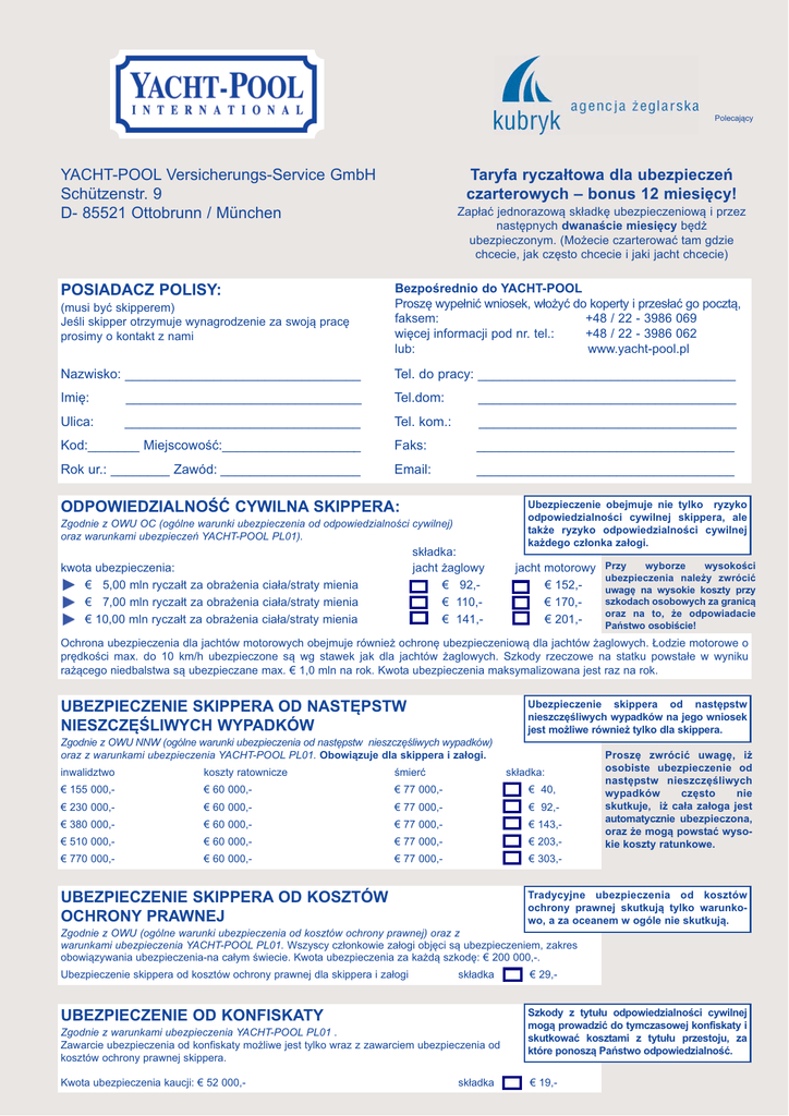 Polecający Taryfa ryczałtowa dla ubezpieczeń czarterowych – bonus 12 miesięcy! YACHT-POOL Versicherungs-Service GmbH Schützenstr. 9 D- 85521 Ottobrunn / München Zapłać jednorazową składkę ubezpieczeniową i przez następnych dwanaście miesięcy będż ubezpieczonym. (Możecie czarterować tam gdzie chcecie, jak często chcecie i jaki jacht chcecie) (musi być skipperem) Jeśli skipper otrzymuje wynagrodzenie za swoją pracę prosimy o kontakt z nami Bezpośrednio do YACHT-POOL Proszę wypełnić wniosek, włożyć do koperty i przesłać go pocztą, faksem: +48 / 22 - 3986 069 więcej informacji pod nr. tel.: +48 / 22 - 3986 062 lub: www.yacht-pool.pl Nazwisko: ________________________________ Tel. do pracy: ___________________________________ Imię: ________________________________ Tel.dom: ___________________________________ Ulica: ________________________________ Tel. kom.: ___________________________________ Kod:_______ Miejscowość:___________________ Faks: ___________________________________ Rok ur.: ________ Zawód: ___________________ Email: ___________________________________ POSIADACZ POLISY: ODPOWIEDZIALNOŚĆ CYWILNA SKIPPERA: Zgodnie z OWU OC (ogólne warunki ubezpieczenia od odpowiedzialności cywilnej) oraz warunkami ubezpieczeń YACHT-POOL PL01). kwota € € € składka: jacht żaglowy € 92,€ 110,€ 141,- ubezpieczenia: 5,00 mln ryczałt za obrażenia ciała/straty mienia 7,00 mln ryczałt za obrażenia ciała/straty mienia 10,00 mln ryczałt za obrażenia ciała/straty mienia Ubezpieczenie obejmuje nie tylko ryzyko odpowiedzialności cywilnej skippera, ale także ryzyko odpowiedzialności cywilnej każdego członka załogi. jacht motorowy € 152,€ 170,€ 201,- Przy wyborze wysokości ubezpieczenia należy zwrócić uwagę na wysokie koszty przy szkodach osobowych za granicą oraz na to, że odpowiadacie Państwo osobiście! Ochrona ubezpieczenia dla jachtów motorowych obejmuje również ochronę ubezpieczeniową dla jachtów żaglowych. Łodzie motorowe o prędkości max. do 10 km/h ubezpieczone są wg stawek jak dla jachtów żaglowych. Szkody rzeczowe na statku powstałe w wyniku rażącego niedbalstwa są ubezpieczane max. € 1,0 mln na rok. Kwota ubezpieczenia maksymalizowana jest raz na rok. Ubezpieczenie skippera od następstw nieszczęśliwych wypadków na jego wniosek jest możliwe również tylko dla skippera. UBEZPIECZENIE SKIPPERA OD NASTĘPSTW NIESZCZĘŚLIWYCH WYPADKÓW Zgodnie z OWU NNW (ogólne warunki ubezpieczenia od następstw nieszczęśliwych wypadków) oraz z warunkami ubezpieczenia YACHT-POOL PL01. Obowiązuje dla skippera i załogi. inwalidztwo koszty ratownicze śmierć składka: € 155 000,- € 60 000,- € 77 000,- € 40, € 230 000,- € 60 000,- € 77 000,- € 92,- € 380 000,- € 60 000,- € 77 000,- € 143,- € 510 000,- € 60 000,- € 77 000,- € 203,- € 770 000,- € 60 000,- € 77 000,- € 303,- Proszę zwrócić uwagę, iż osobiste ubezpieczenie od następstw nieszczęśliwych wypadków często nie skutkuje, iż cała załoga jest automatycznie ubezpieczona, oraz że mogą powstać wysokie koszty ratunkowe. Tradycyjne ubezpieczenia od kosztów ochrony prawnej skutkują tylko warunkowo, a za oceanem w ogóle nie skutkują. UBEZPIECZENIE SKIPPERA OD KOSZTÓW OCHRONY PRAWNEJ Zgodnie z OWU (ogólne warunki ubezpieczenia od kosztów ochrony prawnej) oraz z warunkami ubezpieczenia YACHT-POOL PL01. Wszyscy członkowie załogi objęci są ubezpieczeniem, zakres obowiązywania ubezpieczenia-na całym świecie. Kwota ubezpieczenia za każdą szkodę: € 200 000,-. Ubezpieczenie skippera od kosztów ochrony prawnej dla skippera i załogi składka UBEZPIECZENIE OD KONFISKATY Zgodnie z warunkami ubezpieczenia YACHT-POOL PL01 . Zawarcie ubezpieczenia od konfiskaty możliwe jest tylko wraz z zawarciem ubezpieczenia od kosztów ochrony prawnej skippera. Kwota ubezpieczenia kaucji: € 52 000,- składka € 29,- Szkody z tytułu odpowiedzialności cywilnej mogą prowadzić do tymczasowej konfiskaty i skutkować kosztami z tytułu przestoju, za które ponoszą Państwo odpowiedzialność. € 19,- UBEZPIECZENIE KAUCJI ZA CZARTER Zgodnie z warunkami ubezpieczeń YACHT-POOL PL01 kaucji za czarter. Ochrona ubezpieczeniowa obejmuje skippera oraz załogę na kwotę powstałej szkody casco, w wybranej poniżej maksymalnej wysokości. Udział własny wynosi 5% kaucji lub małej szkody, jednak nie mniej niż € 50,- za zdarzenie. Zaznaczona kwota kaucji nie może być niższa niż ustalona w umowie czarteru. kwota kaucji do €: 511,1025,1550,2050,2600,3050,składka € 61,120,154,195,243,292,_________________ Jeśli chcą Państwo ubezpieczyć kwotę kaucji wyższą niż € 3050,-, proszę wpisać żądaną kwotę w puste miejsce po prawej stronie i przesłać formularz faksem. Otrzymacie Państwo niezwłocznie naszą propozycję składki. Ryzyko regat jest wyłączone z ubezpieczenia kaucji za czarter, ale na wniosek może zostać dodane. Ubezpieczenie kaucji nie zwalnia od zdeponowania kaucji w bazie. UBEZPIECZENIE OD NASTĘPSTW USZKODZEŃ W CZARTERZE Zgodnie z warunkami ubezpieczeń YACHT-POOL PL01 od następstw uszkodzeń w czarterze. Ochrona ubezpieczeniowa obejmuje skippera oraz załogę dla jachtów o ustalonych jak poniżej parametrach: długość do 33′ składka za jacht żaglowy do 36′ € 84,- do 43′ € 99,- do 52′ € 119,- do 63′ € 151,- € 189,- składka za jacht motorowy € 109,€ 120,€ 149,€ 239,€ 299,Ochrona ubezpieczeniowa dla jachtów motorowych obejmuje również ochronę ubezpieczeniową dla jachtów żaglowych. Ryzyko regat jest wyłączone z ubezpieczenia od następstw uszkodzeń w czarterze, ale na wniosek może zostać dodane. UBEZPIECZENIE OD ANULOWANIA CZARTERU Zgodnie z warunkami ubezpieczenia YACHT-POOL PL01 od anulowania czarteru. Skipper i wszyscy członkowie załogi są objęci tym rodzajem ubezpieczenia. W odróżnieniu od początku obowiązywania pozostały