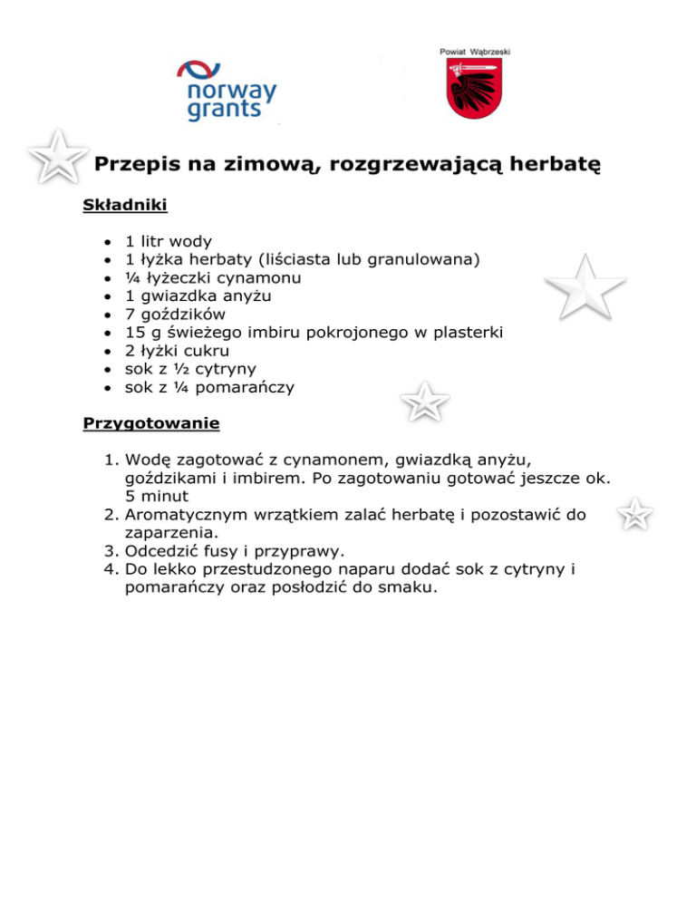 Przepis na zimową, rozgrzewającą herbatę Składniki 1 litr wody 1 łyżka herbaty (liściasta lub granulowana) ¼ łyżeczki cynamonu 1 gwiazdka anyżu 7 goździków 15 g świeżego imbiru pokrojonego w plasterki 2 łyżki cukru sok z ½ cytryny sok z ¼ pomarańczy Przygotowanie 1. Wodę zagotować z cynamonem, gwiazdką anyżu, goździkami i imbirem. Po zagotowaniu gotować jeszcze ok. 5 minut 2. Aromatycznym wrzątkiem zalać herbatę i pozostawić do zaparzenia. 3. Odcedzić fusy i przyprawy. 4. Do lekko przestudzonego naparu dodać sok z cytryny i pomarańczy oraz posłodzić do smaku.