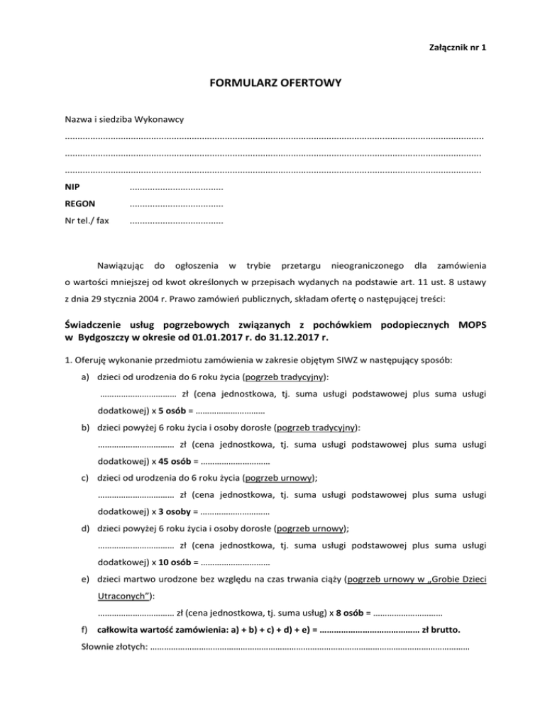 Załącznik nr 1 FORMULARZ OFERTOWY Nazwa i siedziba Wykonawcy ..................................................................................................................................................................... .................................................................................................................................................................... .................................................................................................................................................................... NIP ..................................... REGON ..................................... Nr tel./ fax ..................................... Nawiązując do ogłoszenia w trybie przetargu nieograniczonego dla zamówienia o wartości mniejszej od kwot określonych w przepisach wydanych na podstawie art. 11 ust. 8 ustawy z dnia 29 stycznia 2004 r. Prawo zamówień publicznych, składam ofertę o następującej treści: Świadczenie usług pogrzebowych związanych z pochówkiem podopiecznych MOPS w Bydgoszczy w okresie od 01.01.2017 r. do 31.12.2017 r. 1. Oferuję wykonanie przedmiotu zamówienia w zakresie objętym SIWZ w następujący sposób: a) dzieci od urodzenia do 6 roku życia (pogrzeb tradycyjny): …………………………… zł (cena jednostkowa, tj. suma usługi podstawowej plus suma usługi dodatkowej) x 5 osób = ………………………… b) dzieci powyżej 6 roku życia i osoby dorosłe (pogrzeb tradycyjny): …………………………… zł (cena jednostkowa, tj. suma usługi podstawowej plus suma usługi dodatkowej) x 45 osób = ………………………… c) dzieci od urodzenia do 6 roku życia (pogrzeb urnowy); …………………………… zł (cena jednostkowa, tj. suma usługi podstawowej plus suma usługi dodatkowej) x 3 osoby = ………………………… d) dzieci powyżej 6 roku życia i osoby dorosłe (pogrzeb urnowy); …………………………… zł (cena jednostkowa, tj. suma usługi podstawowej plus suma usługi dodatkowej) x 10 osób = ………………………… e) dzieci martwo urodzone bez względu na czas trwania ciąży (pogrzeb urnowy w „Grobie Dzieci Utraconych”): …………………………… zł (cena jednostkowa, tj. suma usług) x 8 osób = ………………………… f) całkowita wartość zamówienia: a) + b) + c) + d) + e) = …………………………………… zł brutto. Słownie złotych: ………………………………………………………………………………………………………………………… 2. Stawka podatku VAT……..% 3. Oświadczam, że przedmiot oferty jest zgodny z przedmiotem zamówienia. 4. Przedmiot zamówienia zrealizuję w terminie określonym w specyfikacji istotnych warunków zamówienia. 5. Termin płatności: ……………… dni. (termin płatności nie może być krótszy niż 21 dni i nie może być dłuższy niż 30 dni). 6. Oświadczam, że zapoznałem się ze Specyfikacją Istotnych Warunków Zamówienia, nie wnoszę do jej treści zastrzeżeń oraz uzyskałem informacje niezbędne do przygotowania oferty. 7. Oświadczam, że uważam się za związanego niniejszą ofertą przez czas wskazany w SIWZ. 8. Oświadczam, że akceptuję wzór umowy stanowiący załącznik do SIWZ i zawarte w SIWZ postanowienia, które zostaną wprowadzone do treści zawieranej umowy. 9. Stosownie do art. 22 ust. 1 ustawy Pzp oświadczam, że spełniam warunki udziału w postępowaniu o udzielenie zamówienia publicznego. 10. Oferta została złożona na ………… stronach, podpisanych i kolejno ponumerowanych od nr ………… do nr……… . 11. W przypadku wyboru mojej oferty wyrażam zgodę, aby istotne postanowienia wzoru umowy stanowiącego załącznik do SIWZ - zostały wprowadzone do umowy. 12. Umowa z mojej strony będzie podpisywana zgodnie z reprezentacją przez: (podać imiona, nazwiska i stanowiska): ............................................................................................................................................. ............................................................................................................................................. 13. Upoważnionym do kontaktów z Zamawiającym w zakresie sporządzonej oferty będzie ........................................................................................, tel.: ………………………………………… 14. Oficjalne dane do kontaktu z Zamawiającym (podać dokładnie): Adres (miejscowość, ulica i kod) ........................................................................................................................................... ........................................................................................................................................... telefon .................................., fax ................................ 15. Oświadczam, że zamierzam powierzyć część zamówienia podwykonawcy/om: TAK/NIE, (zakreślić właściwe: tak lub nie) w następującym zakresie: ............................................................................................................................................ Podwykonawcą/cami realizującym/i część zamówienia będą: ............................................................................................................................................ ............................................................................................................................................ ............................................................................................................................................ ............................................................................................................................................ 16. Oświadczam, że zatrudniamy/zatrudnimy na podstawie umowy o pracę …………… osób wykonujących czynności administracyjne