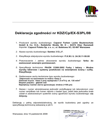 Deklaracja zgodności nr KDZ/Cp/EX-S3PL/08 1. Producent wyrobu budowlanego: Caparol Farben Lacke Bautenschutz GmbH & Co. K.G.; Roßdörfer Straße 50, D – 64372 Ober Ramstadt Importer: Caparol Polska Sp. z o. o.; ul. Baletowa 5C; 02-867 Warszawa 2. Nazwa wyrobu budowlanego: Samtex 3 E.L.F. 3. Klasyfikacja statystyczna wyrobu budowlanego: P.K.W.i U. 24.30.11-50.00 4. Przeznaczenie i zakres stosowania zastosowań wewnątrz pomieszczeń. wyrobu budowlanego: farba do 5. Specyfikacja techniczna: PN-EN 13300:2002 Farby i lakiery – Wodne wyroby lakierowe i systemy powłokowe na wewnętrzne ściany i sufity. Klasyfikacja. 6. Deklarowane cechy techniczne typu wyrobu budowlanego: Odporność na szorowanie na mokro: klasa 2 Zdolność krycia: klasa 3 przy wydajności 7,5 m2/l tj. ok. 135 ml/m2 Stopień połysku: głęboki mat Największy rozmiar ziarna (granulacja): drobna (<100 µm) 7. Nazwa i numer akredytowanej jednostki certyfikującej lub laboratorium oraz numer certyfikatu lub numer raportu z badań typu, jeżeli taka jednostka brała udział w zastosowanym systemie oceny zgodności wyrobu budowlanego: nie dotyczy. Deklaruję z pełną odpowiedzialnością, że wyrób budowlany jest zgodny ze specyfikacją techniczną wskazaną w pkt 5. Warszawa; dnia 10 październik 2008 ..................................