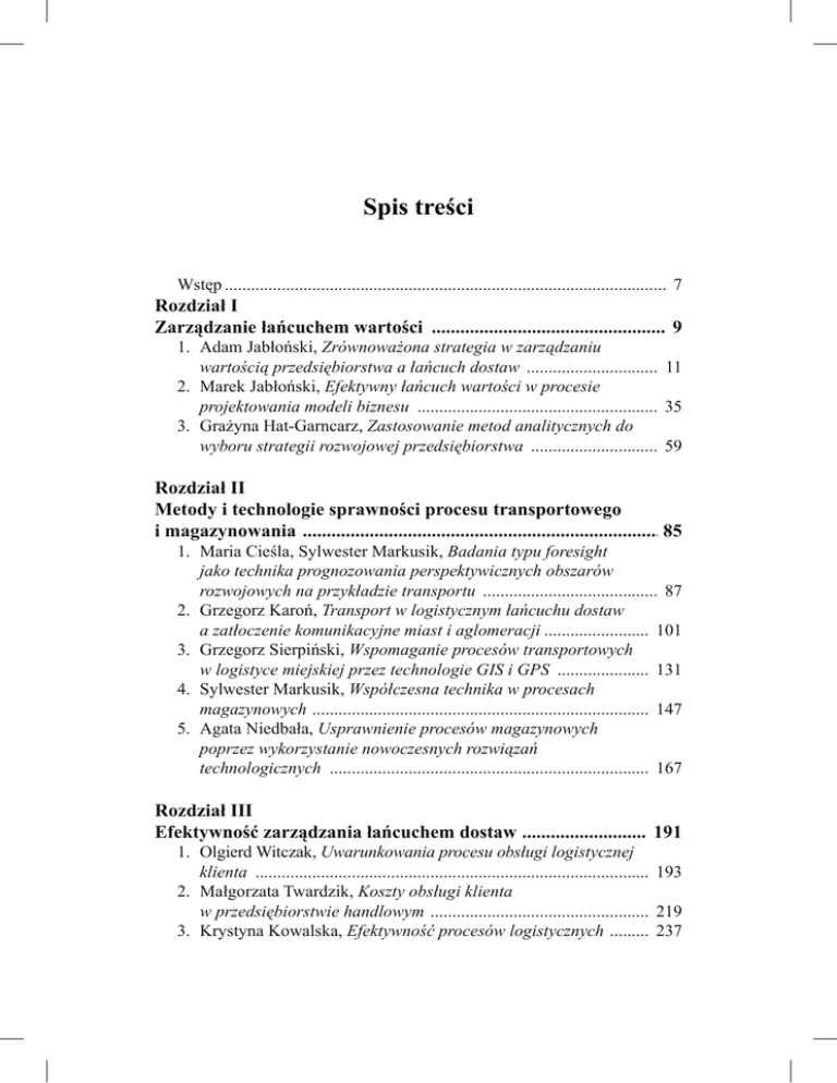 Spis treści Wstęp ...................................................................................................... 7 Rozdział I Zarządzanie łańcuchem wartości .................................................. 9 1. Adam Jabłoński, Zrównoważona strategia w zarządzaniu wartością przedsiębiorstwa a łańcuch dostaw ............................... 11 2. Marek Jabłoński, Efektywny łańcuch wartości w procesie projektowania modeli biznesu ........................................................ 35 3. Grażyna Hat-Garncarz, Zastosowanie metod analitycznych do wyboru strategii rozwojowej przedsiębiorstwa .............................. 59 Rozdział II Metody i technologie sprawności procesu transportowego i magazynowania ........................................................................... 85 1. Maria Cieśla, Sylwester Markusik, Badania typu foresight jako technika prognozowania perspektywicznych obszarów rozwojowych na przykładzie transportu ......................................... 87 2. Grzegorz Karoń, Transport w logistycznym łańcuchu dostaw a zatłoczenie komunikacyjne miast i aglomeracji ......................... 101 3. Grzegorz Sierpiński, Wspomaganie procesów transportowych w logistyce miejskiej przez technologie GIS i GPS ...................... 131 4. Sylwester Markusik, Współczesna technika w procesach magazynowych .............................................................................. 147 5. Agata Niedbała, Usprawnienie procesów magazynowych poprzez wykorzystanie nowoczesnych rozwiązań technologicznych .......................................................................... 167 Rozdział III Efektywność zarządzania łańcuchem dostaw ........................... 191 1. Olgierd Witczak, Uwarunkowania procesu obsługi logistycznej klienta ........................................................................................... 193 2. Małgorzata Twardzik, Koszty obsługi klienta w przedsiębiorstwie handlowym ................................................... 219 3. Krystyna Kowalska, Efektywność procesów logistycznych .......... 237
