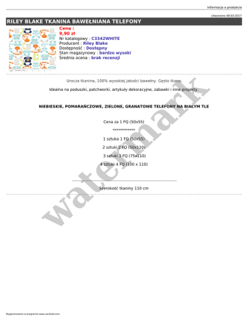 Informacje o produkcie Utworzono 08-03-2017 RILEY BLAKE TKANINA BAWEŁNIANA TELEFONY Cena : 9,90 zł Nr katalogowy : C3342WHITE Producent : Riley Blake Dostępność : Dostępny Stan magazynowy : bardzo wysoki Średnia ocena : brak recenzji Urocza tkanina, 100% wysokiej jakości bawełny. Gęsto tkana. er m ar k Idealna na poduszki, patchworki, artykuły dekoracyjne, zabawki i inne projekty. NIEBIESKIE, POMARAŃCZOWE, ZIELONE, GRANATOWE TELEFONY NA BIAŁYM TLE Cena za 1 FQ (50x55) ************ 1 sztuka 1 FQ (50x55) 2 sztuki 2 FQ (50x110) 3 sztuki 3 FQ (75x110) 4 sztuki 4 FQ (100 x 110) at ........................................................................................ w Szerokość tkaniny 110 cm Wygenerowano w programie www.oscGold.com