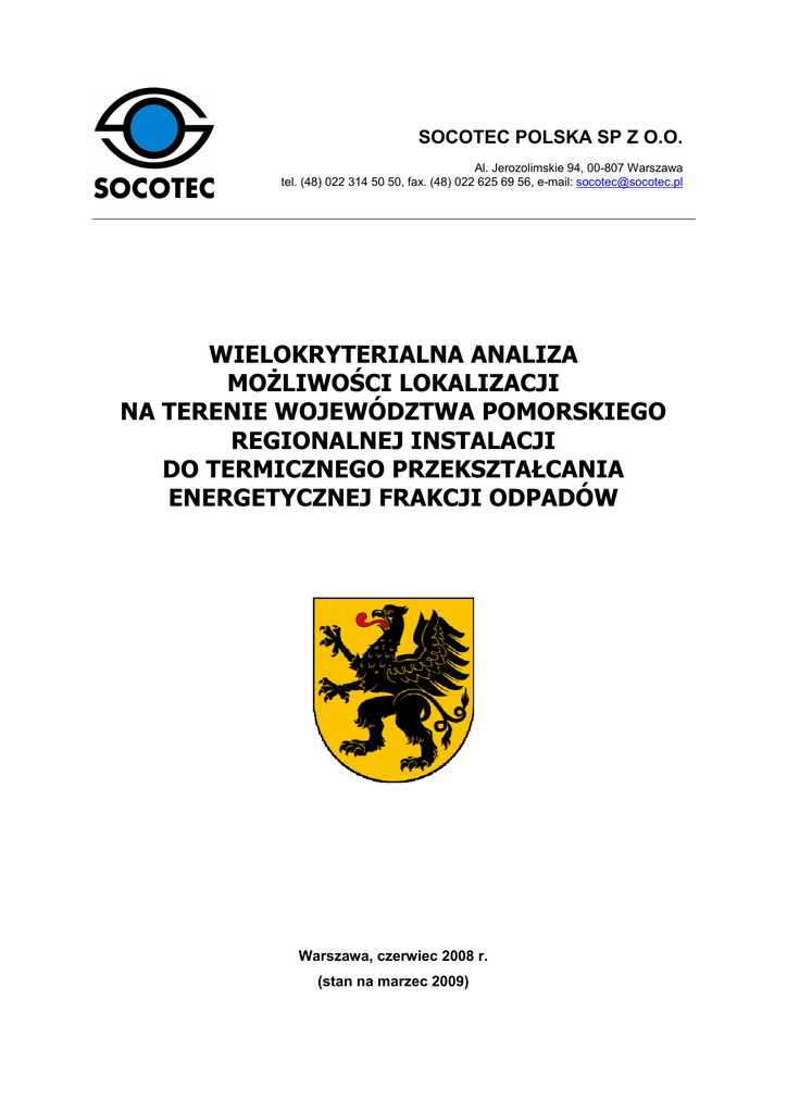 SOCOTEC POLSKA SP Z O.O. Al. Jerozolimskie 94, 00-807 Warszawa tel. (48) 022 314 50 50, fax. (48) 022 625 69 56, e-mail: [email protected] WIELOKRYTERIALNA ANALIZA MOśLIWOŚCI LOKALIZACJI NA TERENIE WOJEWÓDZTWA POMORSKIEGO REGIONALNEJ INSTALACJI DO TERMICZNEGO PRZEKSZTAŁCANIA ENERGETYCZNEJ FRAKCJI ODPADÓW Warszawa, czerwiec 2008 r. (stan na marzec 2009) Wielokryterialna analiza moŜliwości lokalizacji na terenie województwa pomorskiego regionalnej instalacji do termicznego przekształcania energetycznej frakcji odpadów Spis treści 1. WPROWADZENIE......................................................................................................................................... 5 1.1. POLITYKA POLSKI I UE W ZAKRESIE OCHRONY ŚRODOWISKA ........................................................ 5 1.1.1. Uwarunkowania prawne w UE ........................................................................................................... 5 1.1.2. Prawo polskie i unijne w zakresie energetyki..................................................................................... 9 1.2. CELE I ZAŁOśENIA GOSPODARKI ODPADAMI DLA WOJEWÓDZTWA POMORSKIEGO.................. 10 1.2.1. Krajowy Plan Gospodarki Odpadami 2010 ...................................................................................... 10 1.2.2. Wojewódzki Plan Gospodarki Odpadami dla Województwa Pomorskiego 2010 ............................. 11 1.2.3. Program Operacyjny Infrastruktura i Środowisko na lata 2007-2013 - Oś II „Gospodarka odpadami i ochrony powierzchni ziemi”.............................................................................................................. 12 1.3. WYBÓR LOKALIZACJI DO ANALIZY WIELOKRYTERIALNEJ............................................................... 13 2. ANALIZA WIELOKRYTERIALNA LOKALIZACJI ...................................................................................... 15 2.1. WYKORZYSTANE DOKUMENTY I MATERIAŁY.................................................................................... 15 3. PRODUCENCI FRAKCJI ENERGETYCZNEJ............................................................................................ 18 3.1. WSTĘP.................................................................................................................................................... 18 3.2. CHARAKTERYSTYKA ZZO .................................................................................................................... 19 3.2.1. Zakład Utylizacyjny Szadółki............................................................................................................ 20 3.2.2. Eko Dolina........................................................................................................................................ 23 3.2.3. Zakład Unieszkodliwiania Odpadów Komunalnych „Stary Las” Sp. z o.o. ....................................... 27 3.2.4. Zakład Utylizacji Odpadów Stałych Tczew....................................................................................... 29 3.3. PODSUMOWANIE .................................................................................................................................. 32 4. ANALIZA TECHNOLOGICZNA DLA INSTALACJI .................................................................................... 34 4.1. PRZEGLĄD TECHNOLOGII DO TERMICZNEGO PRZEKSZTAŁCANIA ODPADÓW............................ 34 4.1.1. Termiczne przekształcanie odpadów w piecach rusztowych ........................................................... 35 4.1.2. Termiczne przekształcanie odpadów w kotłach fluidalnych ............................................................. 37 4.1.3. Termiczne przekształcanie odpadów z wykorzystaniem procesu pirolizy ........................................ 39 4.1.4. Termiczne przekształcanie odpadów z wykorzystaniem procesu zgazowania ................................ 41 4.2. POZOSTAŁOŚCI POPROCESOWE W RÓśNYCH PROCESACH TERMICZNEGO PRZEKSZTAŁCANIA ODPADÓW - PODSUMOWANIE ............................................................................................................ 44 4.3. SYSTEMY I URZĄDZENIA DO OCZYSZCZANIA SPALIN...................................................................... 45 4.3.1. Techniki redukcji tlenków azotu ....................................................................................................... 45 4.3.2. Systemy redukcji metali cięŜkich oraz dioksan i furanów................................................................. 47 4.3.3. Odpylanie spalin............................................................................................................................... 47 4.3.4. Usuwanie kwaśnych zanieczyszczeń............................................................................................... 47 4.3.5. Sposoby zagospodarowywania pozostałości po procesie oczyszczania spalin............................... 51 4.4. PODSUMOWANIE .................................................................................................................................. 53 5. ANALIZA ODZIAŁYWANIA NA ŚRODOWISKO ........................................................................................ 55 5.1. WSTĘP.................................................................................................................................................... 55 5.2. ETAP REALIZACJI INWESTYCJI ........................................................................................................... 56 5.3. ETAP EKSPLOATACJI............................................................................................................................ 56 5.3.1. Spalanie w piecu rusztowym............................................................................................................ 58 5.3.2. Spalanie w kotle fluidalnym.....................................................................................................
