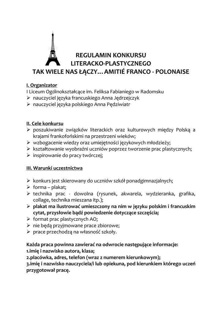 REGULAMIN KONKURSU LITERACKO-PLASTYCZNEGO TAK WIELE NAS ŁĄCZY…AMITIÉ FRANCO - POLONAISE I. Organizator I Liceum Ogólnokształcące im. Feliksa Fabianiego w Radomsku nauczyciel języka francuskiego Anna Jędrzejczyk nauczyciel języka polskiego Anna Pędziwiatr II. Cele konkursu poszukiwanie związków literackich oraz kulturowych między Polską a krajami frankofońskimi na przestrzeni wieków; wzbogacenie wiedzy oraz umiejętności językowych młodzieży; kształtowanie wyobraźni uczniów poprzez tworzenie prac plastycznych; inspirowanie do pracy twórczej; III. Warunki uczestnictwa konkurs jest skierowany do uczniów szkół ponadgimnazjalnych; forma – plakat; technika prac - dowolna (rysunek, akwarela, wydzieranka, grafika, collage, technika mieszana itp.); plakat ma ilustrować umieszczony na nim w języku polskim i francuskim cytat, przysłowie bądź powiedzenie dotyczące szczęścia; format prac plastycznych AO; nie będą przyjmowane prace zbiorowe; prace przechodzą na własność szkoły. Każda praca powinna zawierać na odwrocie następujące informacje: 1.imię i nazwisko autora, klasa; 2.placówka, adres, telefon (wraz z numerem kierunkowym); 3.imię i nazwisko nauczyciela/i lub opiekuna, pod kierunkiem którego uczeń przygotował pracę. IV Kontakt: I Liceum Ogólnokształcące im. Feliksa Fabianiego w Radomsku Tel. 44 683 09 41 V. Termin i miejsce nadsyłania prac: do 20 czerwca 2013 roku, na adres: I Liceum Ogólnokształcące im. Feliksa Fabianiego w Radomsku ul. Armii Krajowej 30 97 – 500 Radomsko można też dostarczyć osobiście do sekretariatu szkoły VI. Rozstrzygnięcie konkursu: o wyłonieniu zwycięzców zdecyduje Komisja Konkursowa; prace niespełniające warunków uczestnictwa nie będą oceniane; spośród zgłoszonych do konkursu prac Komisja wybierze trzy najlepsze; rozstrzygnięcie jury jest ostateczne i nie przysługuje od niego odwołanie; na zwycięzców Czekaja atrakcyjne nagrody; zwycięzcy zostaną odpowiednio wcześniej poinformowani o wygranej i dniu wręczenia nagród. ZAPRASZAMY DO UDZIAŁU!
