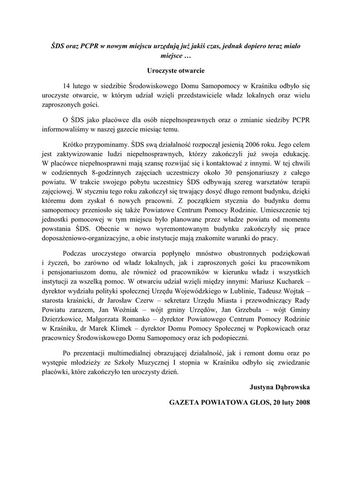 ŚDS oraz PCPR w nowym miejscu urzędują już jakiś czas, jednak dopiero teraz miało miejsce … Uroczyste otwarcie 14 lutego w siedzibie Środowiskowego Domu Samopomocy w Kraśniku odbyło się uroczyste otwarcie, w którym udział wzięli przedstawiciele władz lokalnych oraz wielu zaproszonych gości. O ŚDS jako placówce dla osób niepełnosprawnych oraz o zmianie siedziby PCPR informowaliśmy w naszej gazecie miesiąc temu. Krótko przypominamy. ŚDS swą działalność rozpoczął jesienią 2006 roku. Jego celem jest zaktywizowanie ludzi niepełnosprawnych, którzy zakończyli już swoja edukację. W placówce niepełnosprawni mają szansę rozwijać się i kontaktować z innymi. W tej chwili w codziennych 8-godzinnych zajęciach uczestniczy około 30 pensjonariuszy z całego powiatu. W trakcie swojego pobytu uczestnicy ŚDS odbywają szereg warsztatów terapii zajęciowej. W styczniu tego roku zakończył się trwający dosyć długo remont budynku, dzięki któremu dom zyskał 6 nowych pracowni. Z początkiem stycznia do budynku domu samopomocy przeniosło się także Powiatowe Centrum Pomocy Rodzinie. Umieszczenie tej jednostki pomocowej w tym miejscu było planowane przez władze powiatu od momentu powstania ŚDS. Obecnie w nowo wyremontowanym budynku zakończyły się prace doposażeniowo-organizacyjne, a obie instytucje mają znakomite warunki do pracy. Podczas uroczystego otwarcia popłynęło mnóstwo obustronnych podziękowań i życzeń, bo zarówno od władz lokalnych, jak i zaproszonych gości ku pracownikom i pensjonariuszom domu, ale również od pracowników w kierunku władz i wszystkich instytucji za wszelką pomoc. W otwarciu udział wzięli między innymi: Mariusz Kucharek – dyrektor wydziału polityki społecznej Urzędu Wojewódzkiego w Lublinie, Tadeusz Wojtak – starosta kraśnicki, dr Jarosław Czerw – sekretarz Urzędu Miasta i przewodniczący Rady Powiatu zarazem, Jan Woźniak – wójt gminy Urzędów, Jan Grzebuła – wójt Gminy Dzierzkowice, Małgorzata Romanko – dyrektor Powiatowego Centrum Pomocy Rodzinie w Kraśniku, dr Marek Klimek – dyrektor Domu Pomocy Społecznej w Popkowicach oraz pracownicy Środowiskowego Domu Samopomocy oraz ich podopieczni. Po prezentacji multimedialnej obrazującej działalność, jak i remont domu oraz po występie młodzieży ze Szkoły Muzycznej I stopnia w Kraśniku odbyło się zwiedzanie placówki, które zakończyło ten uroczysty dzień. Justyna Dąbrowska GAZETA POWIATOWA GŁOS, 20 luty 2008