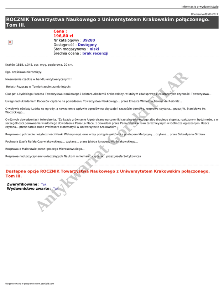 Informacje o wydawnictwie Utworzono 08-03-2017 ROCZNIK Towarzystwa Naukowego z Uniwersytetem Krakowskim połączonego. Tom III. Cena : 196,80 zł Nr katalogowy : 39280 Dostępność : Dostępny Stan magazynowy : niski Średnia ocena : brak recenzji Kraków 1818. s.345. opr. oryg. papierowa. 20 cm. Egz. częściowo nierozcięty. R Niezmiernie rzadkie w handlu antykwarycznym!!! LA Rejestr Rozpraw w Tomie trzecim zamkniętych: FI Głos JW. Lityńskiego Prezesa Towarzystwa Naukowego i Rektora Akademii Krakowskiey, w którym zdał sprawę z całorocznych czynności Towarzystwa... Uwagi nad układaniem Kodexów czytane na posiedzeniu Towarzystwa Naukowego... przez Ernesta Wilhelma Barona de Reibnitz... sk i O wpływie oświaty Ludów na ogrody, a nawzaiem o wpływie ogrodów na obyczaje i szczęście domowe, rozprawa czytana... przez JW. Stanisława Hr. Wodzickiego... ór O różnych dowodzeniach twierdzenia, "Że każde zrównanie Algebraiczne na czynniki rzetelne pierwszego albo drugiego stopnia, rozłożonym bydź może, a w szczególności porównanie wiadomego dowodzenia Pana La Place, z dowodem przez Pana Gauss w roku teraźnieyszym w Götindze ogłoszonym. Rzecz czytana... przez Karola Hube Professora Matematyki w Uniwersytecie Krakowskim G Rozprawa o potrzebie i użyteczności Nauki Weterynaryi, oraz o tey postępie na równi z postepem Medycyny... czytana... przez Sebastyana Girtlera Pochwała Józefa Rafałą Czerwiakowskiego... czytana... przez Jakóba Ignacego Woźniakowskiego... ar ia t Rozprawa o Malarstwie przez Ignacego Mieroszewskiego... Rozprawa nad przyczynami uwłaczaiących Naukom mniemań... czytana... przez Józefa Sołtykowicza An ty k Zweryfikowane: Tak. Wydawnictwo zwarte: Tak. w Dostępne opcje ROCZNIK Towarzystwa Naukowego z Uniwersytetem Krakowskim połączonego. Tom III. Wygenerowano w programie www.oscGold.com