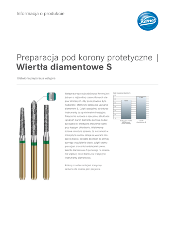Informacja o produkcie Preparacja pod korony protetyczne | Wiertła diamentowe S Ułatwiona preparacja wstępna Wstępna preparacja zębów pod korony jest jednym z najbardziej czasochłonnych etapów klinicznych. Aby postępowanie było najbardziej efektywne zaleca się używanie diamentów S. Dzięki specjalnej strukturze instrumenty te są minimalnie inwazyjne. Połączenie surowca o specjalnej strukturze i grubych ziaren diamentu pozwala na bardzo szybkie i efektywne znoszenie tkanki przy lepszym chłodzeniu. Wielokrawędziowa struktura sprawia, że instrument w mniejszym stopniu okleja się wiórami znoszonej tkanki, ponadto dochodzi do zmniejszonego wydzielania ciepła, dzięki czemu praca jest znacznie bardziej efektywna. Wiertła diamentowe S pozwalają na zniesienie większej ilości tkanki, niż tradycyjne instrumenty diamentowe. Krótszy czas leczenia jest korzystny zarówno dla lekarza jak i pacjenta. Ilość znoszonej tkanki w% 120 100 118 % 100 % 80 60 40 20 0 tradycyjne wiertła diamentowe (różne kształty) wiertło diamentowe S Wskazówki dot. stosowania: Przy (300.000 min-1 możliwe jest • Optymalna liczba obrotów (160.000 min-1 również użycie turbiny (z wyjątkiem Zaleca się używanie w czerwonej S6879.314.012, S6882.314.012 i kątnicy. S6882L.314.014). • Należy zwrócić uwagę na dostateczne chłodzenie sprayem wodnym co najmniej 50 ml/min. Instrumenty o długości roboczej 6 mm Cylinder z okrągłą krawędzią Cylinder okrągły • Instrumenty te charakteryzują się dużą Torpeda S6836KR.314.012 S6880.314.012 S6877.314.012 S6836KR.314.014 S6880.314.014 S6877.314.014 S6836KR.314.016 S6880.314.016 S6877.314.016 skutecznością w znoszeniu tkanek, dlatego też należy pracować z niewielkim naciskiem (<2N). Instrumenty o długości roboczej 8 mm Cylinder z okrągłą krawędzią Cylinder okrągły Torpeda S6837KR.314.012 S6881.314.012 S6878.314.012 S6856.314.012 S6837KR.314.014 S6881.314.014 S6878.314.014 S6837KR.314.016 S6881.314.016 S6878.314.016 Płomień S6862.314.012 new S6862.314.014 new S6862.314.016 new Stożek z okrągłą krawędzią Stożek okrągły Torpeda w kształcie stożka S6847KR.314.014 S6878K.314.012 S6856.314.014 S6847KR.314.016 S6878K.314.014 S6856.314.016 S6847KR.314.018 S6878K.314.016 new S6856.314.018 S6878K.314.018 S6856.314.021 S6878K.314.021 new Instrumenty o długości roboczej 9 mm Zmodyfikowany stopień zaokrąglony w kształcie stożka S6979K.314.018 S6886K.314.018 Instrumenty o długości roboczej 10 mm Cylinder okrągły Torpeda Stożek okrągły Torpeda w kształcie Stożek z okrągłą krawędzią stożka Płomień S6882.314.012 S6879.314.012 S6850.314.014 S6848KR.314.014 S6879K.314.014 S6863.314.012 new S6882.314.014 S6879.314.014 S6850.314.016 S6848KR.314.016 S6879K.314.016 S6863.314.014 new S6882.314.016 S6879.314.016 S6850.314.018 S6848KR.314.018 S6879K.314.018 S6863.314.016 new S6879K.314.021 Instrumenty o długości roboczej 12 mm Redukcja powierzchni zwarciowych/językowych Cylinder okrągły Jajowaty S6379.314.018 S6368.314.016 new S6379.314.023 S6368.314.023 new Patent niemiecki DE 199 08 507 Patent europejski EP 1031 325i Komet Dental · Gebr. Brasseler GmbH & Co. KG · Postfach 160 · 32631 Lemgo · Export: Telefon +49 (0) 5261 701-0 · Telefax +49 (0) 5261 701-329 · [email protected] · www.kometdental.pl © 0812 · 410511V0 S6882L.314.014 Pączek