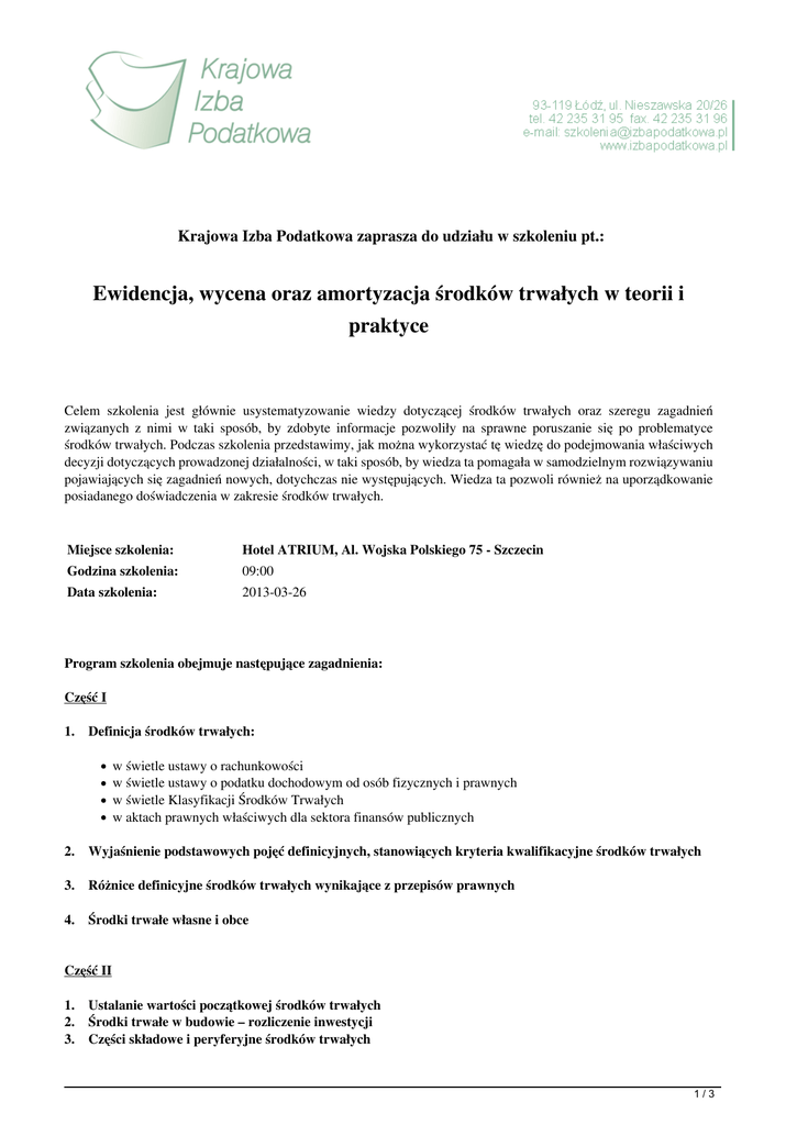 Krajowa Izba Podatkowa zaprasza do udziału w szkoleniu pt.: Ewidencja, wycena oraz amortyzacja środków trwałych w teorii i praktyce Celem szkolenia jest głównie usystematyzowanie wiedzy dotyczącej środków trwałych oraz szeregu zagadnień związanych z nimi w taki sposób, by zdobyte informacje pozwoliły na sprawne poruszanie się po problematyce środków trwałych. Podczas szkolenia przedstawimy, jak można wykorzystać tę wiedzę do podejmowania właściwych decyzji dotyczących prowadzonej działalności, w taki sposób, by wiedza ta pomagała w samodzielnym rozwiązywaniu pojawiających się zagadnień nowych, dotychczas nie występujących. Wiedza ta pozwoli również na uporządkowanie posiadanego doświadczenia w zakresie środków trwałych. Miejsce szkolenia: Hotel ATRIUM, Al. Wojska Polskiego 75 - Szczecin Godzina szkolenia: 09:00 Data szkolenia: 2013-03-26 Program szkolenia obejmuje następujące zagadnienia: Część I 1. Definicja środków trwałych: w świetle ustawy o rachunkowości w świetle ustawy o podatku dochodowym od osób fizycznych i prawnych w świetle Klasyfikacji Środków Trwałych w aktach prawnych właściwych dla sektora finansów publicznych 2. Wyjaśnienie podstawowych pojęć definicyjnych, stanowiących kryteria kwalifikacyjne środków trwałych 3. Różnice definicyjne środków trwałych wynikające z przepisów prawnych 4. Środki trwałe własne i obce Część II 1. 2. 3. Ustalanie wartości początkowej środków trwałych Środki trwałe w budowie – rozliczenie inwestycji Części składowe i peryferyjne środków trwałych 1/3 4. 5. 6. Ulepszanie i remont środka trwałego – skutki właściwego ujęcia Likwidacja środków trwałych i jej etapy – wycofanie z użytkowania i fizyczna likwidacja Wycenia środków trwałych – aktualizacja wyceny, odpisy z tytułu trwałej utraty wartości środków trwałych Część III 1. 2. 3. 4. 5. 6. 7. 8. Amortyzacja i umorzenie Najczęściej stosowane metody amortyzacyjne Amortyzacja w prawie bilansowym – ustalenie okresu, stawki i metody amortyzacji Amortyzacja liniowa jako podstawowa metoda amortyzacji podatkowej Amortyzacja degresywna (degresywno-liniowa) jako jedna z metod amortyzacji podatkowej Amortyzacja przyspieszona dla małych podatników oraz podatników rozpoczynających działalność Ustalenie podatkowej stawki amortyzacyjnej – stawki podwyższone i obniżone Indywidualne stawki amortyzacyjne dla środków trwałych używanych i ulepszonych Część IV 1. 2. 3. Klasyfikacja Środków Trwałych (KŚT) – zasady ogólne Struktura symboli KŚT Charakterystyka grup KŚT grunty budynki i lokale obiekty inżynierii lądowej i wodnej kotły i maszyny energetyczne maszyny, urządzenia i aparaty urządzenia techniczne środki transportu narzędzia, przyrządy, ruchomości i wyposażenie inwentarz żywy O prowadzącym: Anna Król-Błażejewska – doświadczony księgowy przedsiębiorstw i jednostek budżetowych. Wieloletni główny księgowy Wojewódzkiego Urzędu Pracy w Szczecinie. Wykładowca licznych szkoleń z zakresu rachunkowości i podatków. Blisko 2000 godzin szkoleń w latach 2006-2012. Autorka publikacji z zakresu rachunkowości przedsiębiorstw, jednostek administracji publicznej i organizacji pozarządowych. Publikuje m. in. w Rachunkowości Budżetowej - INFOR, Wydawnictwo Wiedza i Praktyka- Rachunkowość budżetowa i Rachunkowość Organizacji Pozarządowej w Polsce. Właścicielka biura rachunkowego od 1996 r. Cena szkolenia obejmuje: zajęcia dydaktyczne, materiały szkoleniowe przygotowane przez eksperta, dyplom ukończenia szkolenia, lunch, napoje, ciasteczka Rezerwacja wg kolejności zgłoszeń. Ilość miejsc ograniczona. W celu zgłoszenia udziału w szkoleniu należy wypełnić formularz zgłoszeniowy i przesłać go faksem na numer: (042) 235-31-96. Po otrzymaniu zgłoszenia odeślemy Państwu 2/3 potwierdzenie przyjęcia rezerwacji. Dodatkowe informacje można uzyskać pod numerem (042) 235-31-95. Serdecznie zapraszamy. Rozpoczęcie szkolenia: 2013-03-26 09:00 Ilość godzin: 5 Miejsce szkolenia: Hotel ATRIUM, Al. Wojska Polskiego 75 - Szczecin Koszt uczestnictwa jednej osoby netto: 490,00 zł Koszt uczestnictwa jednej osoby brutto: 602,70 zł Rezerwacja wg kolejności zgłoszeń. Ilość miejsc ograniczona. W celu zgłoszenia udziału w szkoleniu należy wypełnić formularz zgłoszeniowy i przesłać go faksem na numer: (042) 235 31 96 Po otrzymaniu zgłoszenia odeślemy Państwu potwierdzenie przyjęcia rezerwacji. Dodatkowe informacje można uzyskać pod numerem (042) 235 31 95. Serdecznie zapraszamy. 3/3 Powered by TCPDF (www.tcpdf.org)
