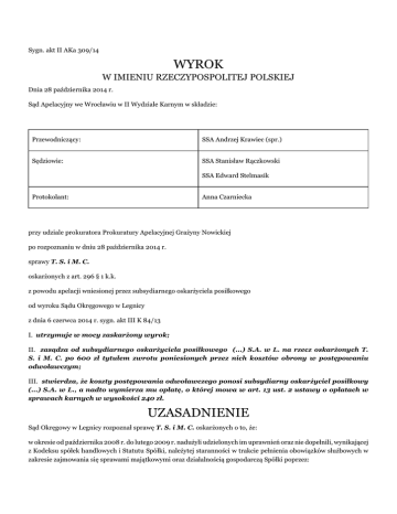 Sygn. akt II AKa 309/14 WYROK W IMIENIU RZECZYPOSPOLITEJ POLSKIEJ Dnia 28 października 2014 r. Sąd Apelacyjny we Wrocławiu w II Wydziale Karnym w składzie: Przewodniczący: SSA Andrzej Krawiec (spr.) Sędziowie: SSA Stanisław Rączkowski SSA Edward Stelmasik Protokolant: Anna Czarniecka przy udziale prokuratora Prokuratury Apelacyjnej Grażyny Nowickiej po rozpoznaniu w dniu 28 października 2014 r. sprawy T. S. i M. C. oskarżonych z art. 296 § 1 k.k. z powodu apelacji wniesionej przez subsydiarnego oskarżyciela posiłkowego od wyroku Sądu Okręgowego w Legnicy z dnia 6 czerwca 2014 r. sygn. akt III K 84/13 I. utrzymuje w mocy zaskarżony wyrok; II. zasądza od subsydiarnego oskarżyciela posiłkowego (...) S.A. w L. na rzecz oskarżonych T. S. i M. C. po 600 zł tytułem zwrotu poniesionych przez nich kosztów obrony w postępowaniu odwoławczym; III. stwierdza, że koszty postępowania odwoławczego ponosi subsydiarny oskarżyciel posiłkowy (...) S.A. w L., a nadto wymierza mu opłatę, o której mowa w art. 13 ust. 2 ustawy o opłatach w sprawach karnych w wysokości 240 zł. UZASADNIENIE Sąd Okręgowy w Legnicy rozpoznał sprawę T. S. i M. C. oskarżonych o to, że: w okresie od października 2008 r. do lutego 2009 r. nadużyli udzielonych im uprawnień oraz nie dopełnili, wynikającej z Kodeksu spółek handlowych i Statutu Spółki, należytej staranności w trakcie pełnienia obowiązków służbowych w zakresie zajmowania się sprawami majątkowymi oraz działalnością gospodarczą Spółki poprzez: - zawarcie w dniu 20 października 2008 r. ze spółką (...) Sp. z o.o. z siedziba we W. umowy najmu dwóch wagonów osobowych typu 102 zdekapitalizowanych, posiadających decyzje kasacyjne, nieprzydatnych w prowadzonej przez Spółkę działalności, ponadto - zawarcie umowy z (...) Sp. z o.o. na wynajem wagonów i nie zadbanie o sporządzenie protokołu przejęcia wagonów od (...) Sp. z o.o., w którym określony byłby ich stan techniczny, ponadto - zlecenie z naruszeniem sposobu reprezentacji Spółki, wykonania szeregu robót dodatkowych w wymienionych powyżej wagonach, nieprzydatnych w prowadzonej przez Spółkę działalności, ponadto - zlecenie, z naruszeniem sposobu reprezentacji Spółki oraz z naruszeniem (...) S.A. poprzez nieuzyskanie zgody Rady Nadzorczej na rozporządzenie przez Spółkę praw lub zaciągnięcie zobowiązań do świadczenia lub obciążania majątku Spółki o wartości powyżej 500.000 zł robót dodatkowych w w/w wagonach, ponadto - zlecenie napraw w zakresie robót dodatkowych w wagonach niebędących własnością Spółki (...) S.A. bez uzyskania zgody właściciela wagonów, ponadto - zlecenie napraw bez możliwości zabezpieczenia realizacji postanowień umowy z (...) S.A. poprzez niezawarcie umowy z P. Regionalnymi o użyczenie komisarza odbiorczego i deklaracji P. Regionalnych w zakresie przyjęcia wagonów do ilostanu, czynu nadania numerów i uzyskania niezbędnych dokumentów dopuszczających pojazd do ruchu, przez co narazili Spółkę (...) S.A. na znaczną szkodę majątkową w wysokości 1.027.908,39 zł z tytułu należności głównej, a także na koszty i odsetki; to jest o przestępstwo określone w art. 296 § 1 k.k. Po rozpoznaniu tej sprawy Sąd Okręgowy w Legnicy wyrokiem z dnia 6 czerwca 2014 r. uniewinnił obu oskarżonych od zarzucanego im czynu. P o n a d t o: - na podstawie art. 230 § 2 k.p.k. orzekł o dowodach rzeczowych; - orzekł o kosztach sądowych, obciążając nimi częściowo oskarżyciela posiłkowego – subsydiarnego; - zasądził od oskarżyciela posiłkowego-subsydiarnego na rzecz oskarżonych poniesione przez nich koszty obrony. Wyrok powyższy zaskarżył pełnomocnik oskarżyciela posiłkowego – subsydiarnego, to jest Spółka (...) S.A. w L., zarzucając (dosłowny cytat): „1. obrazę przepisów postępowania, które miało wpływ na treść rozstrzygnięcia tj. 410 k.p.k. w zw. z art. 424 § 1 k.p.k. poprzez zaniechanie wskazania w treści uzasadnienia wyroku jakie znaczenie dla rozstrzygnięcia miały dowody z dokumentów zawnioskowanych przez oskarżyciela subsydiarnego w fazie postępowania jurysdykcyjnego dopuszczone przez Sąd jako dowody co uniemożliwia zaskarżenie wyroku i jego kontrolę przez Sąd Apelacyjny, czego nie sanuje lakoniczne stwierdzenie przez Sąd I instancji, że „pozostałe dowody nie miały znaczenia dla rozstrzygnięcia sprawy” (strona 34 uzasadnienia wyroku). 2. obrazę przepisów postępowania, które miało wpływ na treść rozstrzygnięcia tj. 410 k.p.k. w zw. z art. 424 § 1 k.p.k. poprzez nie wskazanie w treści uzasadnienia z jakich powodów Sąd Okręgowy odmówił wiarygodności zeznaniom świadków G. Ł. i E. J. (jedno zdanie stanowiące jeden akapit na stronie 32 uzasadnienia). 3. obrazę przepisów postępowania, która miała wpływ na treść rozstrzygnięcia tj. art. 7 k.p.k. i 410 k.p.k. wyrażającej się na dokonaniu dowolnej, a nie swobodnej oceny zgromadzonego w sprawie materiału dowodowego, niezgodnej ze wskazaniami wiedzy i doświadczenia życiowego, wyrażającej się w bezkrytycznym daniu wiary wyjaśnieniom oskarżonych i zeznaniom niektórych świadków w zakresie stanu technicznego wynajętych wagonów kolejowych, a przy tym odmówienia wiarygodności zeznaniom świadków G. Ł. i E. J. przy jednoczesnym nieuwzględnieniu przy dokonywaniu ustaleń faktycznych w tym zakresie dokumentacji technicznej znajdującej się w aktach sprawy wskazującej na zły stan techniczny przedmiotowych wagonów. 4. błąd w ustaleniach faktycznych przyjętych za podstawę orzeczenia, mający wpływ na jego treść polegający na niezasadnym uznaniu przez Sąd Okręgowy, wbrew zasadom logicznego rozumowania i doświadczenia życiowego, iż zgromadzony w sprawie materiał dowodowy nie daje podstaw do uznania poniżej wskazanych zachowań oskarżonych: - samodzielnego podjęcia decyzji o zleceniu wykonania remontu wynajętych wagonów z narusze