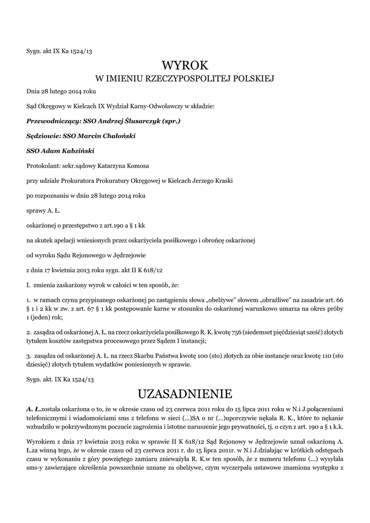 Sygn. akt IX Ka 1524/13 WYROK W IMIENIU RZECZYPOSPOLITEJ POLSKIEJ Dnia 28 lutego 2014 roku Sąd Okręgowy w Kielcach IX Wydział Karny-Odwoławczy w składzie: Przewodniczący: SSO Andrzej Ślusarczyk (spr.) Sędziowie: SSO Marcin Chałoński SSO Adam Kabziński Protokolant: sekr.sądowy Katarzyna Komosa przy udziale Prokuratora Prokuratury Okręgowej w Kielcach Jerzego Kraski po rozpoznaniu w dniu 28 lutego 2014 roku sprawy A. Ł. oskarżonej o przestępstwo z art.190 a § 1 kk na skutek apelacji wniesionych przez oskarżyciela posiłkowego i obrońcę oskarżonej od wyroku Sądu Rejonowego w Jędrzejowie z dnia 17 kwietnia 2013 roku sygn. akt II K 618/12 I. zmienia zaskarżony wyrok w całości w ten sposób, że: 1. w ramach czynu przypisanego oskarżonej po zastąpieniu słowa „obelżywe” słowem „obraźliwe” na zasadzie art. 66 § 1 i 2 kk w zw. z art. 67 § 1 kk postępowanie karne w stosunku do oskarżonej warunkowo umarza na okres próby 1 (jeden) rok; 2. zasądza od oskarżonej A. Ł. na rzecz oskarżyciela posiłkowego R. K. kwotę 756 (siedemset pięćdziesiąt sześć) złotych tytułem kosztów zastępstwa procesowego przez Sądem I instancji; 3. zasądza od oskarżonej A. Ł. na rzecz Skarbu Państwa kwotę 100 (sto) złotych za obie instancje oraz kwotę 110 (sto dziesięć) złotych tytułem wydatków poniesionych w sprawie. Sygn. akt. IX Ka 1524/13 UZASADNIENIE A. Ł.została oskarżona o to, że w okresie czasu od 23 czerwca 2011 roku do 15 lipca 2011 roku w N.i J.połączeniami telefonicznymi i wiadomościami sms z telefonu w sieci (...)SA o nr (...)uporczywie nękała R. K., które to nękanie wzbudziło w pokrzywdzonym poczucie zagrożenia i istotne naruszenie jego prywatności, tj. o czyn z art. 190 a § 1 k.k. Wyrokiem z dnia 17 kwietnia 2013 roku w sprawie II K 618/12 Sąd Rejonowy w Jędrzejowie uznał oskarżoną A. Ł.za winną tego, że w okresie czasu od 23 czerwca 2011 r. do 15 lipca 2011r. w N.i J.działając w krótkich odstępach czasu w wykonaniu z góry powziętego zamiaru znieważyła R. K.w ten sposób, że z numeru telefonu (...) wysyłała sms-y zawierające określenia powszechnie uznane za obelżywe, czym wyczerpała ustawowe znamiona występku z art. 216 § 1 k.k. w zw. z art. 12 k.k. i za to na podstawie art. 216 § 1 k.k. w zw. z art. 33 § 1 i 3 k.k. wymierzył jej karę grzywny w wysokości 100 stawek dziennych przyjmując wysokość jednej stawki dziennej za równoważną kwocie 25 zł. Jednocześnie na podstawie art. 627 k.p.k. Sąd zasądził od oskarżonej A. Ł.na rzecz oskarżyciela posiłkowego R. K.kwotę 756 zł. tytułem zwrotu poniesionych przez niego kosztów zastępstwa procesowego, a także zasądził od oskarżonej na rzecz Skarbu Państwa koszty sądowe obejmujące wydatki w kwocie 90 zł. i opłatę w kwocie 250 zł. Apelację od powyższego wyroku wniósł obrońca oskarżonej zaskarżając go w całości, zarzucając mu: 1. Obrazę przepisów postępowania, a w szczególności art. 399 § 1 k.p.k. poprzez dokonanie zmiany opisu czynu oraz jego kwalifikacji prawnej wychodzącej poza granice oskarżenia; 2. Błąd w ustaleniach faktycznych przyjętych za podstawę wyroku przez przyjęcie, że słowa wypowiadane przez oskarżoną wobec pokrzywdzonego można uznać – w kontekście relacji między stronami za obelżywe; 3. Z ostrożności procesowej błąd w ustaleniach fatycznych przyjętych za podstawę wyroku poprzez uznanie, że nie zachodziły okoliczności z art. 216 § 3 k.k. Powołując się na powyższe skarżący wniósł o zmianę zaskarżonego wyroku przez uniewinnienie oskarżonej, ewentualnie uchylenie zaskarżonego wyroku i przekazanie sprawy Sądowi I instancji do ponownego rozpoznania. Powyższy wyrok zaskarżył również oskarżyciel posiłkowy R. K. zarzucając mu: 1. Obrazę przepisów postępowania, a w szczególności: a) Art. 4, 7 i 410 k.p.k. poprzez wybiórczą, pomijającą niektóre ujawnione dowody, tendencyjną, jednostronnie korzystną dla oskarżonej, dowolną, sprzeczną z zasadami logicznego rozumowania ocenę dowodów w postaci wyjaśnień oskarżonej A. Ł. oraz zeznań pokrzywdzonego w kontekście całokształtu pozostałych dowodów przeprowadzonych w sprawie, co miało wpływ na treść wyroku bowiem doprowadziło do: b) Błędów w ustaleniach faktycznych stanowiących podstawę wyroku poprzez przyjęcie, że działanie oskarżonej było wywołane prowokacyjnym zachowaniem pokrzywdzonego, w szczególności przez nieodbieranie telefonów od oskarżonej, ustalony w wyroku „z góry powzięty zamiar” odnosił się jedynie do znieważenia oskarżyciel posiłkowego, gdy w rzeczywistości oczywistym jest w świetle zebranych dowodów, iż oskarżona działała z zamiarem uporczywego nękania pokrzywdzonego, chcąc wywołać u niego poczucie osaczenia i ciągłego niepokoju o każdej porze doby i we wszystkich miejscach jego pobytu niezależnie od okoliczności, co stanowiło co najmniej istotne naruszenie jego prywatności. Powołując się na powyższe skarżący wniósł o uchylenie zaskarżonego wyroku i przekazanie sprawy do ponownego rozpoznania sądowi I instancji. Sąd Okręgowy zważył co następuje : Apelacja wywiedziona przez oskarżyciela posiłkowego R. K. nie zasługuje na uwzględnienie, natomiast apelacja obrońcy oskarżonej okazała się o tyle skuteczna, o ile doprowadziła do zmiany zaskarżonego wyroku jak w części dyspozytywnej orzeczenia sądu odwoławczego. W toku przeprowadzonego przewodu sądowego Sąd I instancji zgromadził wszystkie niezbędne dla rozstrzygnięcia dowody i wbrew twierdzeniom oskarżyciela posiłkowego nie dopuścił się przy tym naruszenia procedury karnej, jak również nie popełnił błędu w ustaleniach faktycznych przyjętych za podstawę orzeczenia. Wnikliwie rozważył wszystkie dowody i na ich podstawie poczynił prawidłowe ustalenia faktyczne. Analiza rozumowania Sądu I instancji wskazuje, że ustalenia faktyczne są spójn