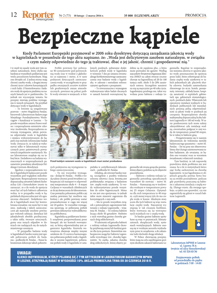 12 Nr 2 (73) 18 lutego - 2 marca 2016 r. 35 000 EGZEMPLARZY PROMOCJA Bezpieczne kąpiele Kiedy Parlament Europejski przyjmował w 2006 roku dyrektywę dotyczącą zarządzania jakością wody w kąpieliskach w preambule do tego aktu napisano, że: „Woda jest deficytowym zasobem naturalnym, w związku z czym należy odpowiednio do tego ją traktować, dbać o jej jakość, chronić i gospodarować nią.” Próbki powinny być pobierane 30 centymetrów pod powierzchnią wody oraz w wodzie o głębokości co najmniej 1 metra. A w razie podejrzeń dotyczących zanieczyszczenia wody, w szczególności w przypadku awaryjnych zrzutów ścieków lub gwałtownych zmian atmosferycznych, powinno się pobrać próbki wody również w miejscach, w któ- lonych punktach, pobieranie dodatkowych próbek wody w kąpielisku w terminie 7 dni po ustaniu ewentualnego krótkoterminowego zanieczyszczenia oraz badanie wody z kąpieliska, w zakresie i metodami referencyjnymi zgodnymi z przepisami. – To równoznaczne z wymogiem wykonywania także badań zlecanych w ramach kontroli wewnętrznej ką- dobne są do zapalenia płuc, a która może prowadzić do zgonów. Według szacunków Światowej Organizacji Zdrowia (WHO) na całym świecie rocznie choruje na legionellozę od 20 do 100 tysięcy osób, około 5 do 20% zarażonych umiera. Szczególnie narażeni na nią są mężczyźni po 40 roku życia. Łagodniejszy przebiega ma, także wywołana przez bakterie z rodzaju Le- fot. Archiwum I w myśl tej zasady woda jest tym zasobem naturalnym, który chyba najbardziej ze wszystkich poddawany jest wielu procedurom kontrolnym. Mają one dwojaki cel. Z jednej strony mają chronić zasoby wody, z drugiej strony chronić życie i zdrowie korzystających z nich ludzi. O kontrolowaniu i badaniu wody do spożycia pisaliśmy na naszych łamach już w październiku. To jednak nie wyczerpuje tematu, bo przepisy stawiają podobne wymagania w innych sytuacjach. Na przykład dotyczące wody w kąpieliskach. – Te kwestie są uregulowane prawnie – mówi Magdalena Patalas, kierownik Laboratorium Badawczego Miejskiego Przedsiębiorstwa Wodociągów i Kanalizacji w Lesznie. – To przede wszystkim ustawa Prawo wodne i rozporządzenia ministrów zdrowia i środowiska. Rozporządzenia zawierają wymagania, jakim powinna odpowiadać woda w kąpielisku i miejscu wykorzystywanym do kąpieli oraz metody referencyjne badań wody. Oznacza to, że należy je wykonywać tylko w laboratoriach wyznaczonych przez państwowych powiatowych inspektorów sanitarnych. Nasze laboratorium znajduje się na takiej liście. Dodatkowo na badania wyznaczonych w rozporządzeniach parametrów posiadamy akredytacje Polskiego Centrum Akredytacji. Zgodnie z rozporządzeniem woda w kąpieliskach badana jest przede wszystkim pod względem mikrobiologicznym. Rozporządzenie wyznacza dopuszczalną zawartość bakterii Escherichia Coli i Enterekoków (warto tu zaznaczyć, że o ile woda do spożycia musi być od tych bakterii całkowicie wolna, to w przypadku wody w kąpieliskach dopuszczalna jest ich ograniczona obecność). Dodatkowo woda w kąpieliskach musi być kontrolowana wizualnie: nie może być w niej sinic, makroalg i takich zanieczyszczeń jak materiały smoliste powstające wskutek rafinacji, destylacji lub jakiejkolwiek obróbki pirolitycznej, a także szkła, tworzyw sztucznych, gumy oraz innych odpadów w ilościach nie nadających się do natychmiastowego usunięcia. – W przypadku badania wody w kąpieliskach bardzo ważny jest sposób pobierania próbek do badania – podkreśla M. Patalas. – Nasze laboratorium dokonuje takich poborów. Przed każdym sezonem woda w kąpieliskach musi zostać przebadana rych podejrzewa się wystąpienie takiego zanieczyszczenia. – To nie wszystkie wymagania – dodaje M. Patalas. – Próbki z wodą należy chronić przed światłem i zabezpieczyć ich transport w odpowiedniej temperaturze około 4 – 8 stopni Cecljusza w warunkach chłodniczych aż do jej dostarczenia do laboratorium. Czas pomiędzy pobraniem próbki a jej analizą powinien być możliwie najkrótszy i ale próbki powinny zostać przeanalizowane w ciągu nie więcej niż 24 godzin. Te wszystkie wymagania sprawiają, że pobierania próbek powinien dokonywać wykwalifikowany próbkobiorca. Kąpieliska są poddawane kontroli urzędowej przeprowadzanej przez Sanepid, ale też kontroli wewnętrznej, za którą odpowiedzialny jest organizator kąpieliska. Kontrola wewnętrzna obejmuje między innymi ustalenie do 15 czerwca harmonogramu pobierania próbek wody z kąpieliska w sezonie kąpielowym, pobieranie próbek wody w kąpielisku w usta- pieliska w certyfikowanych laboratoriach – podkreśla M. Patalas. Odrębną, ale również bardzo ważną, szczególnie z punktu widzenia ochrony zdrowia i życia, kwestią jest problematyka związana z badaniem tzw. ciepłej wody użytkowej. To woda wykorzystywana przede wszystkim do celów higienicznych. Mimo że nie jest ona spożywana, to jednak także może stanowić zagrożenie dla korzystających z niej osób. – Ma to przede wszystkim związek z potencjalnym zagrożeniem bakteriami z rodzaju Legionnella – wyjaśnia M. Patalas. – To rodzina bakterii licząca około 50 gatunków. Niektóre z nich wywołują groźne choroby górnych dróg oddechowych. W zależności od gatunku bakterii z rodziny rodzaju Legionnella choroby przybierają mniej lub bardziej groźne dla życia postacie. Śmiertelnie niebezpieczne mogą być bakterie Legionnella wywołujące tzw. chorobę legionistów. To ciężka, zakaźna choroba dróg oddechowych, której objawy po- gionnella tak zwana gorączka pontiac, której objawy podobne są do objawów przeziębienia. – Bakterie z rodziny rodzaju Legionnella potrzebują specyficznych warunków do rozwoju – mówi M. Patalas. – Namnażają się w środowisku wodnym w temperaturze powyżej 25 stopni Celsjusza. Optymalna dla nich temperatura to 40 stopni, czyli mniej w