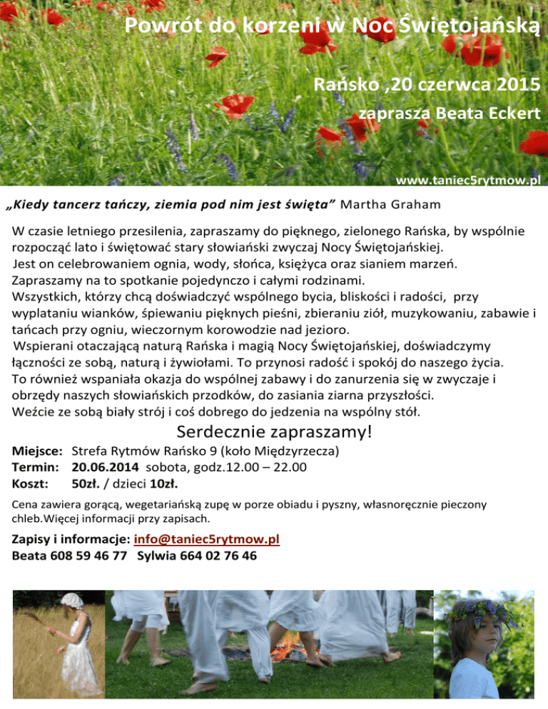Powrót do korzeni w Noc Świętojańską Rańsko ,20 czerwca 2015 zaprasza Beata Eckert www.taniec5rytmow.pl „Kiedy tancerz tańczy, ziemia pod nim jest święta” Martha Graham W czasie letniego przesilenia, zapraszamy do pięknego, zielonego Rańska, by wspólnie rozpocząć lato i świętować stary słowiański zwyczaj Nocy Świętojańskiej. Jest on celebrowaniem ognia, wody, słońca, księżyca oraz sianiem marzeń. Zapraszamy na to spotkanie pojedynczo i całymi rodzinami. Wszystkich, którzy chcą doświadczyć wspólnego bycia, bliskości i radości, przy wyplataniu wianków, śpiewaniu pięknych pieśni, zbieraniu ziół, muzykowaniu, zabawie i tańcach przy ogniu, wieczornym korowodzie nad jezioro. Wspierani otaczającą naturą Rańska i magią Nocy Świętojańskiej, doświadczymy łączności ze sobą, naturą i żywiołami. To przynosi radość i spokój do naszego życia. To również wspaniała okazja do wspólnej zabawy i do zanurzenia się w zwyczaje i obrzędy naszych słowiańskich przodków, do zasiania ziarna przyszłości. Weźcie ze sobą biały strój i coś dobrego do jedzenia na wspólny stół. Serdecznie zapraszamy! Miejsce: Strefa Rytmów Rańsko 9 (koło Międzyrzecza) Termin: 20.06.2014 sobota, godz.12.00 – 22.00 Koszt: 50zł. / dzieci 10zł. Cena zawiera gorącą, wegetariańską zupę w porze obiadu i pyszny, własnoręcznie pieczony chleb.Więcej informacji przy zapisach. Zapisy i informacje: [email protected] Beata 608 59 46 77 Sylwia 664 02 76 46