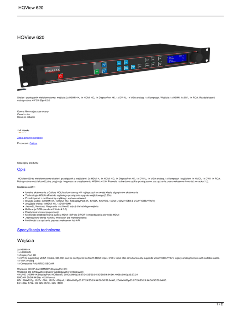 HQView 620 HQView 620 Skaler i przełącznik wieloformatowy, wejścia: 2x HDMI 4K, 1x HDMI HD, 1x DisplayPort 4K, 1x DVI-U, 1x VGA analog, 1x Kompozyt. Wyjścia: 1x HDMI, 1x DVI, 1x RCA. Rozdzielczość maksymalna: 4K*2K 60p 4:2:0 Ocena Nie ma jeszcze oceny Cena brutto Cena po rabacie Zadaj pytanie o produkt Producent: Calibre Szczegóły produktu Opis HQView 620 to wieloformatowy skaler i przełącznik z wejściami: 2x HDMI 4, 1x HDMI HD, 1x DisplayPort 4K, 1x DVI-U, 1x VGA analog, 1x Kompozyt i wyjściem 1x HMDI, 1x DVI i 1x RCA. Maksymalna rozdzielczość jaką przyjmuje i wypuszcza urządzenie to 4K60Hz 4:2:0. Pozwala na bardzo szybkie przełączanie, zarządzenia przez webserver i montaż w racku(1U). Kluczowe cechy: Idealne skalowanie z Calibre HQUltra low-latency 4K najlepszych w swojej klasie algorytmów skalowania Technologia HQUltraFast do szybkiego przełącznia sygnału wejściowego(0.25s) Przedni panel z możliwością szybkiego wyboru ustawień 8 wejśc wideo: 2xHDMI 4K, 1xHDMI HD, 1xDisplayPort 4K, 1xVGA, 1xCVBS, 1xDVI-U (DVI/HDMI & VGA/RGBS/YPbPr) 2 wyjścia wideo: 1xHDMI 4K, 1xDVI/HDMI Jasność, Kontrast, Nasycenie możliwość edycji dla każdego wejścia Kalibracja RGB (nie dla 4:2:0 do 4:2:0) Elastyczna konwersja proporcji Możliwość deebedowania audio z HDMI i DP do S/PDIF i embedowania do wyjśc HDMI Jednoczesny obraz na kilku wyjściach dla monitorowania Możliwość zarządzania poprzez webserver lub API Specyfikacja techniczna Wejścia 2x HDMI 4K 1x HDMI HD 1xDisplayPort 4K 1x DVI-U supporting VESA modes, SD, HD, can be configured as fourth HDMI input. DVI-U input also simultaneously supports VGA/RGBS/YPbPr legacy analog formats with suitable cable. 1x VGA Analog 1x Composite PAL/NTSC/SECAM Wsparcie HDCP dla HDMI/DVI/DisplayPort I/O Wsparcie dla cyfrowych sygnałów wejściowych i wyjściowych: 4K/UHD (HDMI 4K/DisplayPort /HDBaseT) 3840x2160p23.97/24/25/29.94/30/50/59.94/60; 4096x2160p23.97/24 UHD/4K 50/59.94/60p 4:2:0 format HD 1280x720p, 1920x1080i, 1920x1080psf, 1920x1080p23.97/24/25/29.94/30/50/59.94/60, 2048x1080p23.97/24/25/29.94/30/50/59.94/60. ED 480p, 576p, SD 625i (576i), 525i (480i) 1/2 HQView 620 Standardowe foramty graficzne VESA od VGA do 4K Wyjścia 1x HDMI 4K 1x DVI 1x S/PDIF poprzez RCA Wszystkie wyjścia są aktywne jednocześnie z tym samym obrazem na wyjściu. Wsparcie dla przełączania i tryby synchronizacji HQUltraFast Switching w trybie Free-Run Wspiera Source Lock Kontrola użytkownika Zarządzany przedni panel i wyświetlacz dla szybszego zarządzania. Klawiatura do bezpośredniego wyboru wejścia i diody LED. Zarządzanie poprzez RS232, TCP/IP API i Web Server. Gigabit Ethernet do webserver i l API Zasilanie: 100-264VAC, 50W Do pobrania Karta katalogowa 2/2 Powered by TCPDF (www.tcpdf.org)