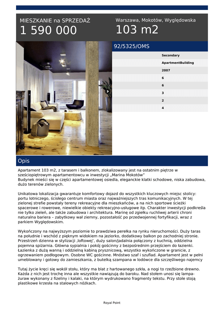 MIESZKANIE na SPRZEDAŻ 1 590 000 Warszawa, Mokotów, Wyględowska 103 m2 92/5325/OMS Secondary ApartmentBuilding 2007 6 6 3 2 4 Opis Apartament 103 m2, z tarasem i balkonem, zlokalizowany jest na ostatnim piętrze w sześciopiętrowym apartamentowcu w inwestycji „Marina Mokotów” Budynek mieści się w części apartamentowej osiedla, eleganckie klatki schodowe, niska zabudowa, dużo terenów zielonych. Unikatowa lokalizacja gwarantuje komfortowy dojazd do wszystkich kluczowych miejsc stolicy: portu lotniczego, ścisłego centrum miasta oraz najważniejszych tras komunikacyjnych. W tej zielonej strefie powstały tereny rekreacyjne dla mieszkańców, a na nich sportowe ścieżki spacerowe i rowerowe, niewielkie obiekty rekreacyjno-usługowe itp. Charakter inwestycji podkreśla nie tylko zieleń, ale także zabudowa i architektura. Marinę od zgiełku ruchliwej arterii chroni naturalna bariera – zabytkowy wał ziemny, pozostałość po przedwojennej fortyfikacji, wraz z parkiem Wyględowskim. Wykończony na najwyższym poziomie to prawdziwa perełka na rynku nieruchomości. Duży taras na południe i wschód z pięknym widokiem na jeziorko, dodatkowy balkon po zachodniej stronie. Przestrzeń dzienna w stylizacji ‚loftowej’, duży salon/jadalnia połączony z kuchnią, oddzielna pojemna spiżarnia. Główna sypialnia i pokój gościnny z bezpośrednim przejściem do łazienki. Łazienka z dużą wanną i oddzielną kabiną prysznicową, wszystko wykończone w granicie, z ogrzewaniem podłogowym. Osobne WC gościnne. Mnóstwo szaf i szuflad. Apartament jest w pełni umeblowany i gotowy do zamieszkania, z butelką szampana w lodówce dla szczęśliwego najemcy Tutaj życie kręci się wokół stołu, który ma blat z hartowanego szkła, a nogi to rzeźbione drewno. Każda z nich jest trochę inna ale wszystkie nawiązują do baroku. Nad stołem unosi się lampażuraw wykonany z fizeliny i kalaki, na którym wydrukowano fragmenty tekstu. Przy stole stoją plastikowe krzesła na stalowych nóżkach. Royal Point W salonie i holu mamy czarny sufit – dość ekstrawaganckie potraktowanie wnętrza. W łazience przy wannie właściciele wycieli w kamieniu otwór na butelkę szampana. Wystarczy dosypać lodu i kąpiel z bąbelkami gotowa.Romantyczny nastrój łazienki jest też zasługą kinkietów z czarnymi abażurami i okiennych rolet. W apartamencie jest jeszcze jedno oryginalne pomieszczenie – toaleta dla gości, pokryta kolorowymi rysunkami. To miejsce robi największe wrażenie na gościach. W cenie zawarte są dwa miejsca parkingowe – jedno w garażu ok. 15 metrów od windy, drugie naziemne ok. 20 metrów od drzwi wejściowych. Apartament sprzedawany z pełnym wyposażeniem. POLECAM !!! Zapraszam na prezentację. Henryk Jóźwiak tel. 660166215 email: [email protected] Royal Point Powered by TCPDF (www.tcpdf.org)