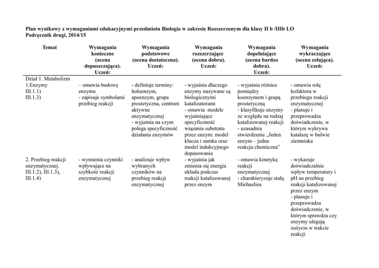 Plan wynikowy z wymaganiami edukacyjnymi przedmiotu Biologia w zakresie Rozszerzonym dla klasy II b /IIIb LO Podręcznik drugi, 2014/15 Temat Dział 1. Metabolizm 1.Enzymy III.1.1) III.1.3) 2. Przebieg reakcji enzymatycznej. III.1.2), III.1.3), III.1.4) Wymagania konieczne (ocena dopuszczająca). Uczeń: Wymagania podstawowe (ocena dostateczna). Uczeń: Wymagania rozszerzające (ocena dobra). Uczeń: Wymagania dopełniające (ocena bardzo dobra). Uczeń: Wymagania wykraczające (ocena celująca). Uczeń: – omawia budowę enzymu - zapisuje symbolami przebieg reakcji - definiuje terminy: holoenzym, apoenzym, grupa prostetyczna, centrum aktywne enzymatycznej - wyjaśnia na czym polega specyficzność działania enzymów - wyjaśnia różnice pomiędzy koenzymem i grupą prostetyczną - klasyfikuje enzymy ze względu na rodzaj katalizowanej reakcji - uzasadnia stwierdzenie „Jeden enzym – jedna reakcja chemiczna” - omawia rolę kofaktora w przebiegu reakcji enzymatycznej - planuje i przeprowadza doświadczenie, w którym wykrywa katalazę w bulwie ziemniaka - wymienia czynniki wpływające na szybkość reakcji enzymatycznej - analizuje wpływ wybranych czynników na przebieg reakcji enzymatycznej - wyjaśnia dlaczego enzymy nazywane są biologicznymi katalizatorami - omawia modele wyjaśniające specyficzność wiązania substratu przez enzym: model klucza i zamka oraz model indukcyjnego dopasowania - wyjaśnia jak zmienia się energia układu podczas reakcji katalizowanej przez enzym - omawia kinetykę reakcji enzymatycznej - charakteryzuje stałą Michaelisa - wykazuje doświadczalnie wpływ temperatury i pH na przebieg reakcji katalizowanej przez enzym - planuje i przeprowadza doświadczenie, w którym sprawdza czy enzymy ulegają zużyciu w trakcie reakcji 3. Regulacja - wymienia sposoby aktywności enzymów. regulacji aktywności Rybozymy. enzymów III.1.3), III.1.4), III 1.5) - omawia sposoby regulacji aktywności enzymów i podaje przykłady - wyjaśnia mechanizm ujemnego sprzężenia zwrotnego w działaniu enzymów - porównuje różne sposoby regulacji aktywności enzymów - omawia budowę i mechanizm działania rybozymów 4. Przenośniki energii. III.2.3) - podaje przykłady reakcji endoergicznej i egzoergicznej - omawia budowę cząsteczki ATP 5. Inne uniwersalne przenośniki. III.2.5) - wymienia najważniejsze przenośniki elektronów i wodoru w komórce - porównuje formę utlenioną i zredukowaną najważniejszych przenośników - wymienia i charakteryzuje sposoby syntezy ATP - ocenia znaczenie ATP w metabolizmie komórki - omawia budowę koenzymu A i wyjaśnia jego funkcje w komórce - zapisuje reakcje chemiczne fosforylacji substratowej, oksydacyjnej i fotosyntetycznej - analizuje mechanizm powstania acetyloCoA 6. Szlaki metaboliczne. Katabolizm i anabolizm. III.2.1), III.2.2), III.2.4), III.2.5) - podaje przykłady reakcji katabolicznych i anabolicznych oraz najważniejszych szlaków metabolicznych w komórce - wymienia rodzaje oddychania komórkowego - wymienia etapy oddychania komórkowego tlenowego - definiuje pojęcia: katabolizm, anabolizm, szlak metaboliczny - porównuje reakcje anaboliczne i kataboliczne -omawia cykl przemian ATP-ADP w komórce - zapisuje reakcje syntezy i rozpadu ATP - podaje przykłady szlaków metabolicznych, w których wykorzystywane są omawiane przenośniki - omawia typowy cykl przemian metabolicznych - wyjaśnia na dowolnym przykładzie na czym polega oszczędność i optymalizacja metabolizmu - podaje przykłady zachwiania równowagi pomiędzy reakcjami anabolicznymi i katabolicznymi w organizmie -wymienia substraty i produkty glikolizy - zapisuje ogólne równanie oddychania tlenowego - porównuje oddychanie tlenowe i - omawia przebieg procesu glikolizy - wyjaśnia rolę oddychania komórkowego u organizmów heterotroficznych i - przedstawia bilans energetyczny glikolizy 7. Oddychanie komórkowe. Glikoliza. III.2.5), III.3.1), III.3.2), III.3.3) - podaje przykłady organizmów przeprowadzających fermentację - wskazuje miejsce zachodzenia glikolizy w komórce beztlenowe - omawia przebieg fermentacji mleczanowej i alkoholowej - porównuje fermentacje mleczanową, alkoholową 8. Metabolizm pirogronianu. III.3.2), III.3.3) - wymienia rodzaje fermentacji - podaje substraty i produkty fermentacji mleczanowej i alkoholowej - wymienia miejsca w organizmie człowieka w których zachodzi fermentacja mleczanowa 9. Cykl Krebsa. III.3.3) - wskazuje miejsce w komórce, w którym zachodzi cykl Krebsa - wymienia produkty i substraty cyklu Krebsa - wskazuje czy cykl Krebsa jest procesem anabolicznym czy katabolicznym - omawia przebieg cyklu Krebsa 10. Utlenianie na łańcuchu oddechowym. III.3.3), III.3.4) - lokalizuje proces utleniania na łańcuchu oddechowym w komórce - wymienia substraty i produkty utleniania na łańcuchu oddechowym - analizuje transport protonów i elektronów w czasie utleniania na łańcuchu oddechowym - wskazuje w których etapach utleniania na autotroficznych - zapisuje reakcje chemiczne fermentacji mleczanowej i alkoholowej - porównuje wydajność energetyczną oddychania tlenowego i beztlenowego - przedstawia przebieg i lokalizację w komórce reakcji pomostowej - ocenia znaczenie cyklu Krebsa w przebiegu oddychania komórkowego - omawia zmiany liczby atomów węgla w cząsteczkach ulegających przemianie w cyklu Krebsa - wyjaśnia znaczenie transportu protonów i elektronów w łańcuchu oddechowym - omawia proces glukoneogenezy i określa jego rolę w metabolizmie - omawia znaczenie reakcji pomostowej w oddychaniu komórkowym - wyjaśnia dlaczego cykl Krebsa nie będzie zachodził w warunkach beztlenowych - przedstawia bilans cyklu Krebsa - omawia budowę syntazy ATP - omawia bilans utleniania na łańcuchu oddechowym łańcuchu oddechowym powstaje transbłonowy gradient protonów - analizuje przebieg procesu β-oksydacji i syntezy kwasów tłuszczowych 11. Metabolizm kwasów tłuszczowych. III.2.5) - wymienia związ