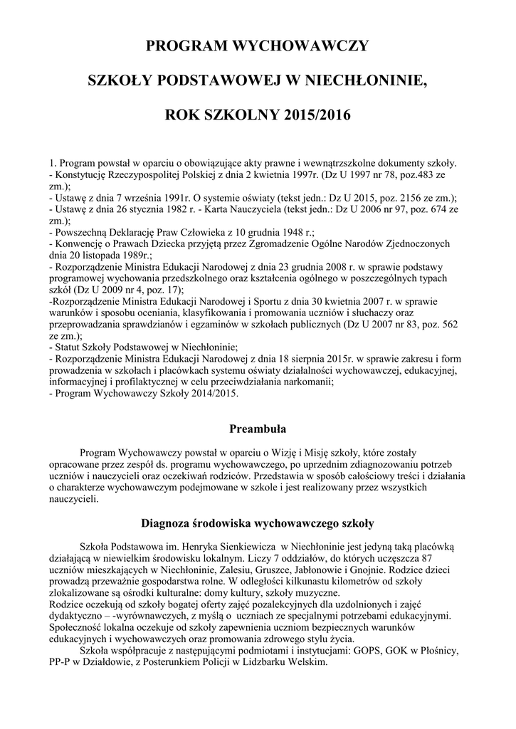 PROGRAM WYCHOWAWCZY SZKOŁY PODSTAWOWEJ W NIECHŁONINIE, ROK SZKOLNY 2015/2016 1. Program powstał w oparciu o obowiązujące akty prawne i wewnątrzszkolne dokumenty szkoły. - Konstytucję Rzeczypospolitej Polskiej z dnia 2 kwietnia 1997r. (Dz U 1997 nr 78, poz.483 ze zm.); - Ustawę z dnia 7 września 1991r. O systemie oświaty (tekst jedn.: Dz U 2015, poz. 2156 ze zm.); - Ustawę z dnia 26 stycznia 1982 r. - Karta Nauczyciela (tekst jedn.: Dz U 2006 nr 97, poz. 674 ze zm.); - Powszechną Deklarację Praw Człowieka z 10 grudnia 1948 r.; - Konwencję o Prawach Dziecka przyjętą przez Zgromadzenie Ogólne Narodów Zjednoczonych dnia 20 listopada 1989r.; - Rozporządzenie Ministra Edukacji Narodowej z dnia 23 grudnia 2008 r. w sprawie podstawy programowej wychowania przedszkolnego oraz kształcenia ogólnego w poszczególnych typach szkół (Dz U 2009 nr 4, poz. 17); -Rozporządzenie Ministra Edukacji Narodowej i Sportu z dnia 30 kwietnia 2007 r. w sprawie warunków i sposobu oceniania, klasyfikowania i promowania uczniów i słuchaczy oraz przeprowadzania sprawdzianów i egzaminów w szkołach publicznych (Dz U 2007 nr 83, poz. 562 ze zm.); - Statut Szkoły Podstawowej w Niechłoninie; - Rozporządzenie Ministra Edukacji Narodowej z dnia 18 sierpnia 2015r. w sprawie zakresu i form prowadzenia w szkołach i placówkach systemu oświaty działalności wychowawczej, edukacyjnej, informacyjnej i profilaktycznej w celu przeciwdziałania narkomanii; - Program Wychowawczy Szkoły 2014/2015. Preambuła Program Wychowawczy powstał w oparciu o Wizję i Misję szkoły, które zostały opracowane przez zespół ds. programu wychowawczego, po uprzednim zdiagnozowaniu potrzeb uczniów i nauczycieli oraz oczekiwań rodziców. Przedstawia w sposób całościowy treści i działania o charakterze wychowawczym podejmowane w szkole i jest realizowany przez wszystkich nauczycieli. Diagnoza środowiska wychowawczego szkoły Szkoła Podstawowa im. Henryka Sienkiewicza w Niechłoninie jest jedyną taką placówką działającą w niewielkim środowisku lokalnym. Liczy 7 oddziałów, do których uczęszcza 87 uczniów mieszkających w Niechłoninie, Zalesiu, Gruszce, Jabłonowie i Gnojnie. Rodzice dzieci prowadzą przeważnie gospodarstwa rolne. W odległości kilkunastu kilometrów od szkoły zlokalizowane są ośrodki kulturalne: domy kultury, szkoły muzyczne. Rodzice oczekują od szkoły bogatej oferty zajęć pozalekcyjnych dla uzdolnionych i zajęć dydaktyczno – -wyrównawczych, z myślą o uczniach ze specjalnymi potrzebami edukacyjnymi. Społeczność lokalna oczekuje od szkoły zapewnienia uczniom bezpiecznych warunków edukacyjnych i wychowawczych oraz promowania zdrowego stylu życia. Szkoła współpracuje z następującymi podmiotami i instytucjami: GOPS, GOK w Płośnicy, PP-P w Działdowie, z Posterunkiem Policji w Lidzbarku Welskim. Wartości preferowane przez społeczność szkolną Zadaniem Programu Wychowawczego Szkoły jest kształtowanie odpowiedzialnej osobowości ucznia w oparciu o: - empatię wobec drugiego człowieka; - dojrzałe funkcjonowanie we współczesnym świecie; - wykorzystywanie wiadomości i umiejętności w rozwiązywaniu problemów; - samodzielność; - dbanie o zdrowie swoje i innych. Zadania wychowawcze 1. Kształtowanie potencjału intelektualnego. 2. Rozwijanie uczuć i emocji. 3. Komunikacja społeczna. 4. Kształtowanie systemu wartości. Misja i Wizja Wychowawcza Szkoły Misja Szkoły W naszej szkole tworzymy atmosferę sprzyjającą wszechstronnemu rozwojowi uczniów, którzy aktywnie uczestniczą w życiu szkoły, środowiska. Podtrzymują tradycje szkoły, regionu, kraju, kontynentu. Krzewimy postawy wolne od uprzedzeń światopoglądowych, popularyzujemy zachowania oparte na asertywności, empatii, szacunku do ludzi, do pracy, podkreślamy znaczenie odpowiedzialności, systematyczności, obiektywizmu w ocenie siebie i innych, prowadzimy działania w celu kształtowania nawyków higieniczno - zdrowotnych. Wspólnie z rodzicami tworzymy wizerunek szkoły, która dostosowuje się do zmian cywilizacyjnych w nowoczesny sposób. Współpracujemy z instytucjami, których celem jest dobro dziecka. Wizja Szkoły Nasza szkoła jest nowoczesną, przyjazną placówką przygotowującą uczniów do kontynuowania nauki na kolejnym etapie edukacyjnym. Przeciwdziałającą zagrożeniom współczesnego świata, popularyzującą zdrowy styl życia, podkreślającą znaczenie samokształcenia, wagę dążenia do realizacji pozytywnych celów umożliwiających samodoskonalenie w wybranych dziedzinach. Nasi uczniowie staną się aktywnymi uczestnikami życia społeczności lokalnej, będą świadomi nierozerwalnego współistnienia ze środowiskiem przyrodniczym, świadomi własnego pochodzenia, dumni z bycia Polakami i członkami swojej „malej ojczyzny”. Uczniowie, rodzice i nauczyciele będą współpracować podczas realizacji zadań, które przygotują dziecko do dorosłego życia, do podejmowania samodzielnych decyzji, do odpowiedzialnego wyboru ponadczasowych i ogólnoludzkich wartości wspieranych przez kulturę i tradycję narodową. Należy do nich prawda, dobro, wiara, wolność, uczciwość, rodzina, ojczyzna. Szkoła zadba o fizyczny, psychiczny i duchowy rozwój ucznia, aby w przyszłości mógł propagować zdrowy styl życia. Wzór absolwenta. Idea programu. Chcemy wychować człowieka, który: Odznacza się wysoką kulturą osobistą, odpowiada za swoje słowa i czyny, a jego zachowanie jest godne naśladowania. 2. Pracuje systematycznie i wyraża tę cechę w rzetelnej nauce, rozwijaniu talentów, niesieniu pomocy koleżankom i kolegom. 3. Szanuje innych ludzi, ich odmienność, pracę. Odnosi się z szacunkiem do symboli szkolnych , narodowych i religijnych. 4. Kieruje procesem samokształcenia i szuka pomysłów na rozwiązanie napotkanych problemów. 5. Czuje się odpowiedzialny za swoje najbliższe otoczenie (grupę, klasę). 6. Dba o własne zdrowie, 