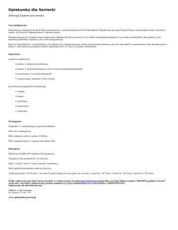 Opiekunka dla Seniorki [Oferuję] Szukam pracownika Nasz podopieczny: Potrzebujemy opiekunki dla pani Maria mieszkaj?cej w okolicach miejscowo?ci Schwalbach. Podopieczna ma nadci?nienie t?tnicze oraz bezdech senny, korzysta z toalety, ale bywa te? inkontynentna w zakresie moczu. Podopieczna jest po z?amaniu stawu skokowego i dlatego chwilowo porusza si? na wózku inwalidzkim (porusza si? na wózku samodzielnie, bez pomocy, przy transferze potrzebuje wsparcia a nie ca?kowitej pomocy). Pani nie ma problemów w komunikacji, jest jednak nieco zdezorientowana, mimo to ma poczucie humoru, chce by? jak najd?u?ej samodzielna. Pani mieszka sama w domu, w odwiedziny przychodzi rodzina, opiekunka mo?e te? liczy? na pomoc siostrzenicy. Obowi?zki: czynno?ci opieku?cze: pomoc w ubieraniu/rozbieraniu, pomoc w utrzymaniu higieny cia?a (w tym zmiana pieluchomajtek), asystowanie w wizytach lekarskich, wsparcie przy transferze ?ó?ko-wózek; prowadzenie gospodarstwa domowego: zakupy, pranie, sprz?tanie, prasowanie, gotowanie Wymagania: Znajomo?? j. niemieckiego na poziomie dobrym, Mo?e by? osoba pal?ca, Mile widziane osoby w wieku: 35-60 lat, Du?e zaanga?owanie w wykonywane obowi?zki. Oferujemy: Op?acone sk?adki ZUS od przeci?tnej krajowej, Zorganizowany przejazd do i ze zlecenia, Jedn?, czyteln? umow? i jasne warunki wspó?pracy, Sta?a opieka konsultantów podczas zlecenia, Atrakcyjny bonus ?wi?teczny w wysoko?ci uzale?nionej od czasu pracy na zleceniu: 2 miesi?ce: 207 Euro, 3 miesi?ce: 247 Euro, 4 miesi?ce: 287 Euro. Osoby zainteresowane ofert? pracy prosimy o e-mail zwrotny na [email protected] albo wys?anie SMS na numer: 786196934, podaj?c równie? swoje imi?, nazwisko i deklarowany poziom znajomo?ci j?zyka niemieckiego oraz województwo. ODDZWONIMY Zapraszamy do odwiedzenia nas! Oddzia? w Bia?ymstoku ul. Lipowa 32, lok. 210 www.opiekunka.gowork.pl Informacje dodatkowe Brak Adres ogłoszenia http://www.superoferty24.pl/opiekunka-dla-seniorki,o1061 Kontakt Mail: [email protected] Telefon: 786196934 Lokalizacja , Podlaskie (Polska) Ogłoszenie dodano: 2016-11-28 14:07:24 Ogłoszenie wygasa: 2017-01-27 14:07:24 Powered by TCPDF (www.tcpdf.org)