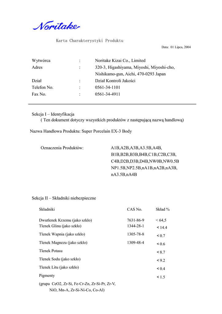 Karta Charakterystyki Produktu Data: 01 Lipca, 2004 Wytwórca : Noritake Kizai Co., Limited Adres : 320-3, Higashiyama, Miyoshi, Miyoshi-cho, Nishikamo-gun, Aichi, 470-0293 Japan Dział Telefon No. : : Dział Kontroli Jakości 0561-34-1101 Fax No. : 0561-34-4911 Sekcja I – Identyfikacja ( Ten dokument dotyczy wszystkich produktów z następującą nazwą handlową) Nazwa Handlowa Produktu: Super Porcelain EX-3 Body Oznaczenia Produktów: A1B,A2B,A3B,A3.5B,A4B, B1B,B2B,B3B,B4B,C1B,C2B,C3B, C4B,D2B,D3B,D4B,NW0B,NW0.5B NP1.5B,NP2.5B,nA1B,nA2B,nA3B, nA3.5B,nA4B Sekcja II – Składniki niebezpieczne Składniki CAS No. Skład % Dwutlenek Krzemu (jako szkło) Tlenek Glinu (jako szkło) 7631-86-9 1344-28-1 < 64,5 Tlenek Wapnia (jako szkło) 1305-78-8 <0.7 Tlenek Magnezu (jako szkło) 1309-48-4 <0.6 <14.4 Tlenek Potasu <8.7 Tlenek Sodu (jako szkło) <9.2 Tlenek Litu (jako szkło) <0.4 Pigmenty <1.5 (grupa CeO2, Zr-Si, Fe-Cr-Zn, Zr-Si-Pr, Zr-V, NiO, Mn-A, Zr-Si-Ni-Co, Co-Al) Sekcja III – Charakterystyka Fizyko-Chemiczna Wygląd i Zapach: drobno zmielony, różowy proszek. Bez zapachu. Dopuszczalny próg zapachowy: nie dotyczy Punkt wrzenia: nieokreślony Punkt topnienia: nieokreślony Punkt krzepnięcia: Nie dotyczy Gęstość względna: 2,5 g/cc Szybkość parowania: nie dotyczy pH: nie dotyczy Rozpuszczalność w wodzie: nierozpuszczalny Sekcja IV- Właściwości palne i podatności na wybuch Temperatura zapłonu: nie dotyczy Środek gaszący: nie dotyczy Dolna granica wybuchu (%): nie dotyczy Górna gr. wybuchu (%): nie dot. Specjalne zasady gaszenia: nie ma Niebezpieczeństwo wybuchu: nie ma Sekcja V- Niebezpieczeństwo dla zdrowia/ Pierwsza pomoc Podstawowe zagrożenie: Możliwość wdechu Oczy: Może powodować podrażnienie przy kontakcie Pierwsza pomoc: Natychmiast przemywać oczy dużą ilością wody przez 15 min., jeśli podrażnienie się utrzymuje skontaktować się z lekarzem Skóra: Może powodować podrażnienie u osób wrażliwych. Pierwsza pomoc : Umyć wodą I mydłem Wdychanie: Nie należy wdychać proszku ceramicznego, krótkotrwałe lub głębsze wciągnięcie może powodować podrażnienie dróg oddechowych, ale nie jest uważane za niebezpieczne dla zdrowia. Wdychanie pyłu może powodować nasilenie astmy i chorób zapalnych płuc. Chroniczne lub długotrwałe wdychanie może powodować uszkodzenie płuc. Pierwsza pomoc: Wyprowadzić na świeże powietrze Połknięcie: Może powodować niestrawność i łagodną biegunkę Pierwsza pomoc: Przy połknięciu skonsultować się z lekarzem Rakotwórczość: NTP: nie IARC: nie OSHA: nie Sekcja VI- Wrażliwość Stabilność: Stabilny Niekompatybilność (materiały do unikania): nie ma Niebezpieczeństwo rozkładu: nie ma Niebezpieczeństwo polimeryzacji: nie występuje Warunki do unikania (polimeryzacja): nie ma Sekcja VII- Uwagi do bezpiecznego stosowania, usuwania Czyszczenie i usuwanie rozsypanego, rozlanego materiału: zmieść lub zebrać do . odpowiednich pojemników. Zmyć powierzchnię wilgotną gąbką. Metody usuwania: zgodnie z lokalnymi regulacjami Zalecenia stosowania i przechowywania: Przechowywać z daleka od żywności i napojów, w suchym miejscu, w temperaturze pokojowej. Inne zalecenia: Zachować standardowe zasady przechowywania Informacje ekologiczne: Stabilny, nieorganiczny materiał, nie rozkłada się, nie paruje Sekcja VIII- Szczególna Informacja dot. zabezpieczenia Ochrona oddychania: Należy stosować maski ochronne zgodnie z OSHA 29 CFR 1910.134. Wentylacja: Ogólny mechaniczny wyciąg. Zalecany miejscowy wyciąg (oparów chemicznych). Rękawice zabezpieczające: Stosować rękawice odporne chemicznie. Zabezpieczenie oczu: Stosować okulary ochronne, przy mieszaniu okulary szczelne. Inne elementy zabezpieczające: Miejsce do przemycia oczu. Zasady pracy/higieny: Zachować normalną ochronę przy pracy z drobnym, suchym proszkiem. Sekcja IX- Międzynarodowe kody ryzyka i bezpieczeństwa R: 36/37/38 S: 20 S: 22 S: 24/25 Podrażnienie oczu, układu oddechowego i skóry Przy stosowaniu nie jeść i nie pić Nie wdychać pyłu Unikać kontaktu ze skórą I oczami