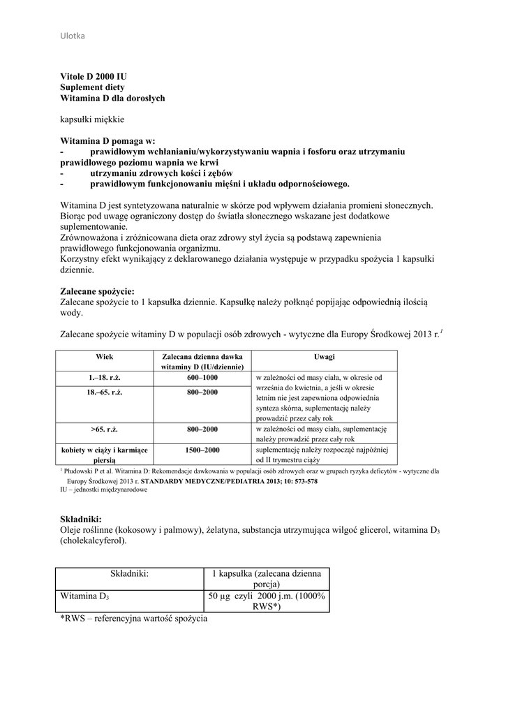 Ulotka Vitole D 2000 IU Suplement diety Witamina D dla dorosłych kapsułki miękkie Witamina D pomaga w: prawidłowym wchłanianiu/wykorzystywaniu wapnia i fosforu oraz utrzymaniu prawidłowego poziomu wapnia we krwi utrzymaniu zdrowych kości i zębów prawidłowym funkcjonowaniu mięśni i układu odpornościowego. Witamina D jest syntetyzowana naturalnie w skórze pod wpływem działania promieni słonecznych. Biorąc pod uwagę ograniczony dostęp do światła słonecznego wskazane jest dodatkowe suplementowanie. Zrównoważona i zróżnicowana dieta oraz zdrowy styl życia są podstawą zapewnienia prawidłowego funkcjonowania organizmu. Korzystny efekt wynikający z deklarowanego działania występuje w przypadku spożycia 1 kapsułki dziennie. Zalecane spożycie: Zalecane spożycie to 1 kapsułka dziennie. Kapsułkę należy połknąć popijając odpowiednią ilością wody. Zalecane spożycie witaminy D w populacji osób zdrowych - wytyczne dla Europy Środkowej 2013 r.1 Wiek 1.–18. r.ż. Zalecana dzienna dawka witaminy D (IU/dziennie) 600–1000 18.–65. r.ż. 800–2000 >65. r.ż. 800–2000 kobiety w ciąży i karmiące piersią 1500–2000 Uwagi w zależności od masy ciała, w okresie od września do kwietnia, a jeśli w okresie letnim nie jest zapewniona odpowiednia synteza skórna, suplementację należy prowadzić przez cały rok w zależności od masy ciała, suplementację należy prowadzić przez cały rok suplementację należy rozpocząć najpóźniej od II trymestru ciąży Płudowski P et al. Witamina D: Rekomendacje dawkowania w populacji osób zdrowych oraz w grupach ryzyka deficytów - wytyczne dla Europy Środkowej 2013 r. STANDARDY MEDYCZNE/PEDIATRIA 2013; 10: 573-578 IU – jednostki międzynarodowe 1 Składniki: Oleje roślinne (kokosowy i palmowy), żelatyna, substancja utrzymująca wilgoć glicerol, witamina D3 (cholekalcyferol). Składniki: Witamina D3 *RWS – referencyjna wartość spożycia 1 kapsułka (zalecana dzienna porcja) 50 µg czyli 2000 j.m. (1000% RWS*) Ulotka Dostępne opakowania: 30, 60 i 90 kapsułek Przechowywanie: Przechowywać w temperaturze od 15C do 25C. Chronić od światła i wilgoci. Przechowywać w sposób niedostępny dla małych dzieci. Nie należy przekraczać zalecanej porcji do spożycia w ciągu dnia. Produkt nie może być stosowany jako substytut zróżnicowanej diety. Nie stosować produktu jeśli kiedykolwiek wcześniej wystąpiła nadwrażliwość na którykolwiek z jego składników. Producent Medana Pharma S A ul. Władysława Łokietka 10 98-200 Sieradz