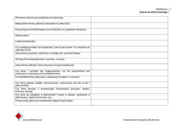 DMKMoney 1 Pytania do oferty factoringu Planowany obrót roczny przekazany do factoringu Maksymalne terminy płatności stosowane na odbiorcach Proponowany limit factoringowy na kontrahenta, ew. globalnie miesięczny Rodzaj waluty Liczba kontrahentów Czy występują korekty lub kompensaty i jaki to jest poziom % w stosunku do ogólnego obrotu Szacunkowy przychód i zysk firmy za ubiegły rok i za okres bieżący Od kogo firma zakupuje towar / surowiec, co to jest Jakie terminy płatności firma otrzymuje od swych dostawców Czy towar / surowiec jest magazynowany, czy też bezpośrednio jest przewożony od dostawcy do kontrahenta firmy Co kontrahent firmy dalej czyni z zakupionym towarem / surowcem Czy firma posiada majątek (nieruchomości, ruchomości), jeśli tak to jaki i jakiej wartości Czy firma korzysta z zewnętrznego finansowania (pożyczki, kredyty, factoring, leasing) Czy firma ma zaległości w płatnościach? (wpisy w bazach, opóźnienia w płatnościach, zajęcia komornicze, itp.) Proszę podać głównych kontrahentów objętych factoringiem www.dmkmoney.pl Nowoczesne rozwiązania dla biznesu DMKMoney 2 Pytania do oferty factoringu Dane ogólne Data rozpoczęcia działalności: Wartość miesięcznej sprzedaży z odroczonym terminem płatności: Przychody za ubiegły rok: Zysk / strata netto: Terminy płatności: Średnie opóźnienia w spłacie (dni): Miesięczna wartość faktur (brutto) do wykupu przez Faktora: Miesięczna ilość faktur do wykupu przez Faktora: Liczba stałych odbiorców/ odbiorców do faktoringu: Udział sprzedaży zagranicznej (%): Udział faktur korygujących: Kompensaty: TAK / NIE Czy firma ma ubezpieczone TAK / NIE transakcje? Czy w umowach handlowych znajduje się następujące zapisy? TAK / NIE Nazwa innego Faktora: Zwroty: Czy firma ma podpisane umowy handlowe z odbiorcami: Czy firma ma umowę z innym Faktorem Ubezpieczyciel: zakaz cesji prawo zwrotu towaru pełnowartościowego - Odbiorcy do faktoringu LP Nazwa i adres odbiorcy NIP Ś/m obrót Terminy płatności 1 2 3 Uwagi: www.dmkmoney.pl Nowoczesne rozwiązania dla biznesu