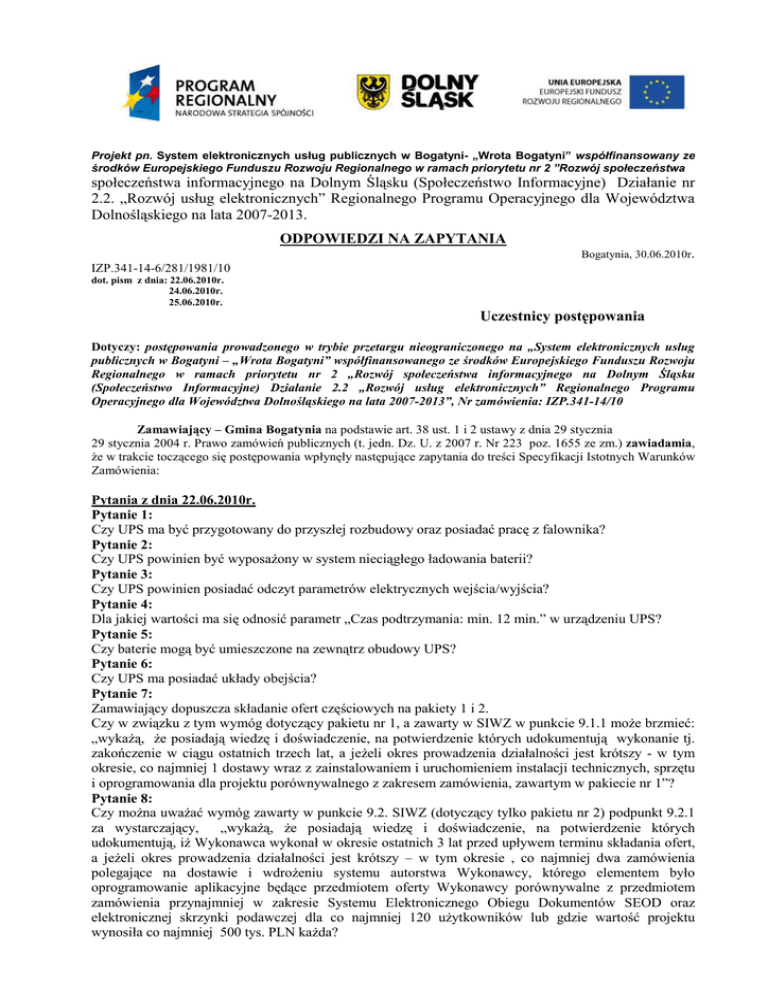 Projekt pn. System elektronicznych usług publicznych w Bogatyni- „Wrota Bogatyni” współfinansowany ze środków Europejskiego Funduszu Rozwoju Regionalnego w ramach priorytetu nr 2 ”Rozwój społeczeństwa społeczeństwa informacyjnego na Dolnym Śląsku (Społeczeństwo Informacyjne) Działanie nr 2.2. „Rozwój usług elektronicznych” Regionalnego Programu Operacyjnego dla Województwa Dolnośląskiego na lata 2007-2013. ODPOWIEDZI NA ZAPYTANIA Bogatynia, 30.06.2010r. IZP.341-14-6/281/1981/10 dot. pism z dnia: 22.06.2010r. 24.06.2010r. 25.06.2010r. Uczestnicy postępowania Dotyczy: postępowania prowadzonego w trybie przetargu nieograniczonego na „System elektronicznych usług publicznych w Bogatyni – „Wrota Bogatyni” współfinansowanego ze środków Europejskiego Funduszu Rozwoju Regionalnego w ramach priorytetu nr 2 „Rozwój społeczeństwa informacyjnego na Dolnym Śląsku (Społeczeństwo Informacyjne) Działanie 2.2 „Rozwój usług elektronicznych” Regionalnego Programu Operacyjnego dla Województwa Dolnośląskiego na lata 2007-2013”, Nr zamówienia: IZP.341-14/10 Zamawiający – Gmina Bogatynia na podstawie art. 38 ust. 1 i 2 ustawy z dnia 29 stycznia 29 stycznia 2004 r. Prawo zamówień publicznych (t. jedn. Dz. U. z 2007 r. Nr 223 poz. 1655 ze zm.) zawiadamia, Ŝe w trakcie toczącego się postępowania wpłynęły następujące zapytania do treści Specyfikacji Istotnych Warunków Zamówienia: Pytania z dnia 22.06.2010r. Pytanie 1: Czy UPS ma być przygotowany do przyszłej rozbudowy oraz posiadać pracę z falownika? Pytanie 2: Czy UPS powinien być wyposaŜony w system nieciągłego ładowania baterii? Pytanie 3: Czy UPS powinien posiadać odczyt parametrów elektrycznych wejścia/wyjścia? Pytanie 4: Dla jakiej wartości ma się odnosić parametr „Czas podtrzymania: min. 12 min.” w urządzeniu UPS? Pytanie 5: Czy baterie mogą być umieszczone na zewnątrz obudowy UPS? Pytanie 6: Czy UPS ma posiadać układy obejścia? Pytanie 7: Zamawiający dopuszcza składanie ofert częściowych na pakiety 1 i 2. Czy w związku z tym wymóg dotyczący pakietu nr 1, a zawarty w SIWZ w punkcie 9.1.1 moŜe brzmieć: „wykaŜą, Ŝe posiadają wiedzę i doświadczenie, na potwierdzenie których udokumentują wykonanie tj. zakończenie w ciągu ostatnich trzech lat, a jeŜeli okres prowadzenia działalności jest krótszy - w tym okresie, co najmniej 1 dostawy wraz z zainstalowaniem i uruchomieniem instalacji technicznych, sprzętu i oprogramowania dla projektu porównywalnego z zakresem zamówienia, zawartym w pakiecie nr 1”? Pytanie 8: Czy moŜna uwaŜać wymóg zawarty w punkcie 9.2. SIWZ (dotyczący tylko pakietu nr 2) podpunkt 9.2.1 za wystarczający, „wykaŜą, Ŝe posiadają wiedzę i doświadczenie, na potwierdzenie których udokumentują, iŜ Wykonawca wykonał w okresie ostatnich 3 lat przed upływem terminu składania ofert, a jeŜeli okres prowadzenia działalności jest krótszy – w tym okresie , co najmniej dwa zamówienia polegające na dostawie i wdroŜeniu systemu autorstwa Wykonawcy, którego elementem było oprogramowanie aplikacyjne będące przedmiotem oferty Wykonawcy porównywalne z przedmiotem zamówienia przynajmniej w zakresie Systemu Elektronicznego Obiegu Dokumentów SEOD oraz elektronicznej skrzynki podawczej dla co najmniej 120 uŜytkowników lub gdzie wartość projektu wynosiła co najmniej 500 tys. PLN kaŜda? Pytanie 9: Czy zamawiający dopuszcza, by tylko klient poczty wychodzącej był wbudowany w system EOD? Wbudowany w system klient poczty przychodzącej, stanowi bardzo istotne i bezpośrednie zagroŜenie sprawnej i wydajnej pracy systemu oraz uŜytkowników poprzez przyjmowanie tzw. poczty niechcianej (spam). Pytanie 10: W nawiązaniu do wymogu zawartego w Załączniku nr 2 do SIWZ, a dotyczącego aplikacji typu CMS Czy zamawiający dopuszcza moŜliwość dokonywania uploadu plików na serwer/do galerii za pomocą protokołu http, jeśli w ten sposób moŜna równieŜ przesłać wiele plików jednocześnie? Pytanie 11: Czy jest moŜliwe, by zamawiający dopuścił, aby pliki były przechowywane na wydzielonym serwerze plików? Ma to istotny wpływ na wydajność bazy danych, jej pojemność i zdolność do efektywnego wyszukiwania informacji przez wszystkich uŜytkowników systemu. Powszechną praktyką, jest trzymanie plików poza silnikiem bazy danych, dlaczego więc forsowane jest rozwiązanie odwrotne, gdzie jak powszechnie wiadomo, bazy danych nie są idealnym miejscem do przechowywania duŜych rozmiarem binariów. Dodatkowo przez to wzrasta znacznie, a niepotrzebnie, obciąŜenie silnika bazy danych. W sytuacji gdy przestanie wystarczać jedna maszyna wraz z przyrostem danych – powstaje bardzo duŜy problem – konieczność wymiany serwera na mocniejszy, klastrowanie, co między innymi pociąga za sobą znaczny wzrost kosztów uŜytkowania systemu, takŜe związanych z licencjami za oprogramowanie, nowym sprzętem oraz konieczną migracją danych. Czy Zamawiający dopuści rozwiązanie wydajniejsze i nie generujące niepotrzebnych kosztów w którym pliki przechowywane są na serwerze plików? Pytanie 12: Wymóg zamawiającego zawarty w punkcie 2.6.ppkt 4 lit. "e” opisu przedmiotu zamówienia, dotyczący zarządzania konfiguracją systemu, w tym incydentami i problemami, powinien być prowadzony zgodnie z odpowiednimi standardami (np. ITIL, ISO 20000. COBI itp.) Czy w opinii Zamawiającego certyfikat bezpieczeństwa informatycznego oraz bezpieczeństwa informacji, zgodny z normą ISO 27001, jest certyfikatem zgodnym z wymogami zamawiającego? Pytanie 13: Czy wymóg zawarty w punkcie 2.6 podpunkt 4 ,litera „J”, opisu przedmiotu zamówienia, a dotyczący zezwolenia na wykonywanie zaleŜnego prawa autorskiego, moŜe być anulowany na rzecz wymagań określonych w literach „I” oraz „K” tegoŜ samego punktu? Interes zamawiającego, dotyczący posiadania kodów źródłowych, w opisywanych przy