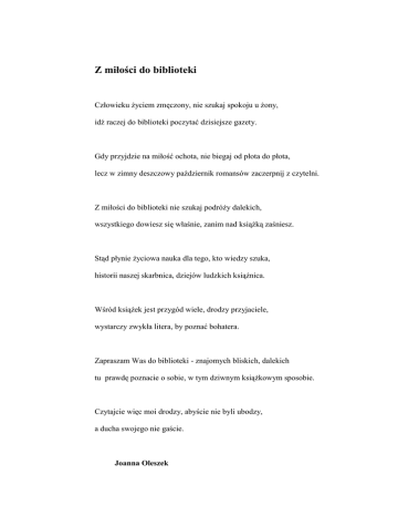 Z miłości do biblioteki Człowieku życiem zmęczony, nie szukaj spokoju u żony, idź raczej do biblioteki poczytać dzisiejsze gazety. Gdy przyjdzie na miłość ochota, nie biegaj od płota do płota, lecz w zimny deszczowy październik romansów zaczerpnij z czytelni. Z miłości do biblioteki nie szukaj podróży dalekich, wszystkiego dowiesz się właśnie, zanim nad książką zaśniesz. Stąd płynie życiowa nauka dla tego, kto wiedzy szuka, historii naszej skarbnica, dziejów ludzkich książnica. Wśród książek jest przygód wiele, drodzy przyjaciele, wystarczy zwykła litera, by poznać bohatera. Zapraszam Was do biblioteki - znajomych bliskich, dalekich tu prawdę poznacie o sobie, w tym dziwnym książkowym sposobie. Czytajcie więc moi drodzy, abyście nie byli ubodzy, a ducha swojego nie gaście. Joanna Oleszek