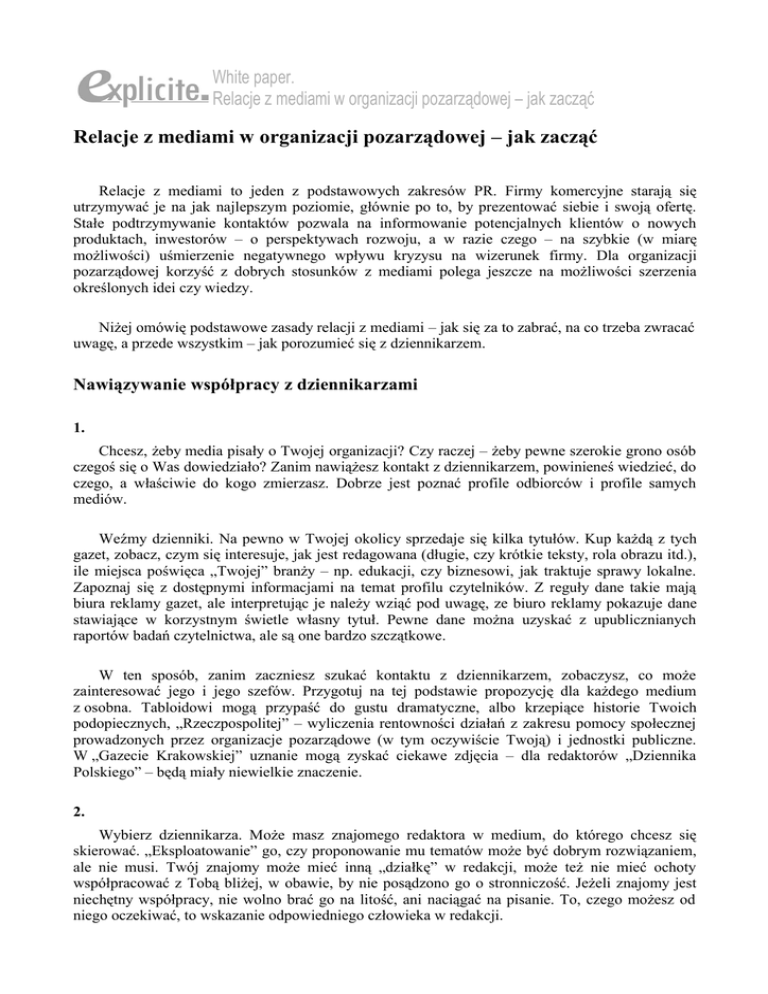 White paper. Relacje z mediami w organizacji pozarządowej – jak zacząć Relacje z mediami w organizacji pozarządowej – jak zacząć Relacje z mediami to jeden z podstawowych zakresów PR. Firmy komercyjne starają się utrzymywać je na jak najlepszym poziomie, głównie po to, by prezentować siebie i swoją ofertę. Stałe podtrzymywanie kontaktów pozwala na informowanie potencjalnych klientów o nowych produktach, inwestorów – o perspektywach rozwoju, a w razie czego – na szybkie (w miarę możliwości) uśmierzenie negatywnego wpływu kryzysu na wizerunek firmy. Dla organizacji pozarządowej korzyść z dobrych stosunków z mediami polega jeszcze na możliwości szerzenia określonych idei czy wiedzy. Niżej omówię podstawowe zasady relacji z mediami – jak się za to zabrać, na co trzeba zwracać uwagę, a przede wszystkim – jak porozumieć się z dziennikarzem. Nawiązywanie współpracy z dziennikarzami 1. Chcesz, żeby media pisały o Twojej organizacji? Czy raczej – żeby pewne szerokie grono osób czegoś się o Was dowiedziało? Zanim nawiążesz kontakt z dziennikarzem, powinieneś wiedzieć, do czego, a właściwie do kogo zmierzasz. Dobrze jest poznać profile odbiorców i profile samych mediów. Weźmy dzienniki. Na pewno w Twojej okolicy sprzedaje się kilka tytułów. Kup każdą z tych gazet, zobacz, czym się interesuje, jak jest redagowana (długie, czy krótkie teksty, rola obrazu itd.), ile miejsca poświęca „Twojej” branży – np. edukacji, czy biznesowi, jak traktuje sprawy lokalne. Zapoznaj się z dostępnymi informacjami na temat profilu czytelników. Z reguły dane takie mają biura reklamy gazet, ale interpretując je należy wziąć pod uwagę, ze biuro reklamy pokazuje dane stawiające w korzystnym świetle własny tytuł. Pewne dane można uzyskać z upublicznianych raportów badań czytelnictwa, ale są one bardzo szczątkowe. W ten sposób, zanim zaczniesz szukać kontaktu z dziennikarzem, zobaczysz, co może zainteresować jego i jego szefów. Przygotuj na tej podstawie propozycję dla każdego medium z osobna. Tabloidowi mogą przypaść do gustu dramatyczne, albo krzepiące historie Twoich podopiecznych, „Rzeczpospolitej” – wyliczenia rentowności działań z zakresu pomocy społecznej prowadzonych przez organizacje pozarządowe (w tym oczywiście Twoją) i jednostki publiczne. W „Gazecie Krakowskiej” uznanie mogą zyskać ciekawe zdjęcia – dla redaktorów „Dziennika Polskiego” – będą miały niewielkie znaczenie. 2. Wybierz dziennikarza. Może masz znajomego redaktora w medium, do którego chcesz się skierować. „Eksploatowanie” go, czy proponowanie mu tematów może być dobrym rozwiązaniem, ale nie musi. Twój znajomy może mieć inną „działkę” w redakcji, może też nie mieć ochoty współpracować z Tobą bliżej, w obawie, by nie posądzono go o stronniczość. Jeżeli znajomy jest niechętny współpracy, nie wolno brać go na litość, ani naciągać na pisanie. To, czego możesz od niego oczekiwać, to wskazanie odpowiedniego człowieka w redakcji. White paper. Relacje z mediami w organizacji pozarządowej – jak zacząć Jeśli w medium, w które celujesz, nie masz znajomych – a tak właśnie jest prawie zawsze – zwróć się do redakcji. Zadzwoń do sekretarza redakcji lub redaktora naczelnego. Przedstaw się i swoją organizację, a następnie poproś o nazwisko i telefon dziennikarza zajmującego się „Twoją” tematyką. Niekiedy wystarczy uważnie przeczytać parę wydań gazety, żeby dowiedzieć się, jak się nazywa „nasz” dziennikarz. Na przykład o marketingu w „Gazecie Wyborczej” najlepiej rozmawiać z Vadimem Makarenką. A w „Pulsie Biznesu” każdy większy tekst jest podpisany nazwiskiem dziennikarza, wraz z e-mailem i numerem telefonu na biurko. Możesz uzyskać kontakt od znajomego. W takim przypadku koniecznie upewnij się, że fakty się zgadzają: dziennikarz faktycznie pracuje dla danego tytułu, faktycznie zajmuje się daną tematyką, faktycznie... tak się nazywa. Możesz to zrobić dzwoniąc do recepcji, sekretariatu redakcji, albo bezpośrednio do zainteresowanego. 3. Pierwszy kontakt z dziennikarzem to telefon. Przedstaw się, powiedz, dlaczego zwracasz się właśnie do tego redaktora: „kontakt z Panem polecił mi Pan X, sekretarz Państwa redakcji”, „czytam Pani artykuły i mam wrażenie, że mogłaby być Pani zainteresowana...” Opowiedz w maksimum trzech zdaniach, czym zajmuje się Twoja organizacja i rzuć dwa pomysły na materiał dziennikarski. Spytaj, co druga strona o tym sądzi. Z reguły odpowiedź będzie mało konkretna. Rzadko zdarzy Ci się usłyszeć „Wie Pan, jak będziecie mieli coś naprawdę ekstra, to proszę zadzwonić, a na razie to mi niepotrzebne żadne piarowskie kwity”. Jeżeli nie uzyskasz tak stanowczej odpowiedzi, zaproponuj spotkanie, w miejscu i czasie dogodnym dla dziennikarza. Jeżeli będzie niechętny, spytaj, czy możesz mu przesłać zestaw materiałów prasowych. Na to na pewno się zgodzi. Zestaw prasowy, zwany w żargonie press-kitem, zawiera podstawowe informacje na temat organizacji, jej celów, najważniejszych przedsięwzięć, kluczowych osób. Dobrze, gdy znajduje się tam odpowiednia liczba cytatów i wypowiedzi różnych osób – łatwiej wtedy dziennikarzowi wpleść zdanie z Twoich „kwitów” do swojego materiału. W takim zestawie powinny znajdować się grafiki obrazujące wielkość i dynamikę organizacji wraz podstawowymi liczbami. Jeżeli ludzie spoza organizacji mogą o Was coś powiedzieć, to zbiór takich wypowiedzi też dobrze jest zawrzeć w pakiecie. Każdy element zestawu powinien stanowić odrębną całość, z własnym tytułem i własną strukturą. Ułatwi to dziennikarzowi korzystanie z materiałów. Co do materiałów multimedialnych, to zalecam oszczędność. Dziennikarz rzadko kiedy zrobi użytek z załączonej płyty. Już lepiej polecić mu adres 
