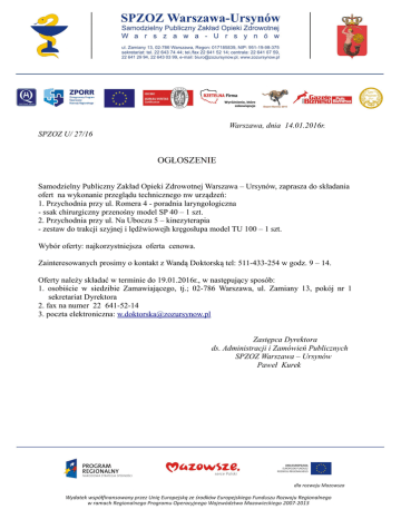 Warszawa, dnia 14.01.2016r. SPZOZ U/ 27/16 OGŁOSZENIE Samodzielny Publiczny Zakład Opieki Zdrowotnej Warszawa – Ursynów, zaprasza do składania ofert na wykonanie przeglądu technicznego nw urządzeń: 1. Przychodnia przy ul. Romera 4 - poradnia laryngologiczna - ssak chirurgiczny przenośny model SP 40 – 1 szt. 2. Przychodnia przy ul. Na Uboczu 5 – kinezyterapia - zestaw do trakcji szyjnej i lędźwiowejh kręgosłupa model TU 100 – 1 szt. Wybór oferty: najkorzystniejsza oferta cenowa. Zainteresowanych prosimy o kontakt z Wandą Doktorską tel: 511-433-254 w godz. 9 – 14. Oferty należy składać w terminie do 19.01.2016r., w następujący sposób: 1. osobiście w siedzibie Zamawiającego, tj.; 02-786 Warszawa, ul. Zamiany 13, pokój nr 1 sekretariat Dyrektora 2. fax na numer 22 641-52-14 3. poczta elektroniczna: [email protected] Zastępca Dyrektora ds. Administracji i Zamówień Publicznych SPZOZ Warszawa – Ursynów Paweł Kurek