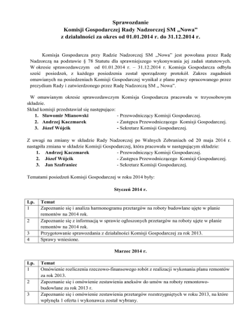 Sprawozdanie Komisji Gospodarczej Rady Nadzorczej SM „Nowa” z działalności za okres od 01.01.2014 r. do 31.12.2014 r. Komisja Gospodarcza przy Radzie Nadzorczej SM „Nowa” jest powołana przez Radę Nadzorczą na podstawie § 78 Statutu dla sprawniejszego wykonywania jej zadań statutowych. W okresie sprawozdawczym od 01.01.2014 r. – 31.12.2014 r. Komisja Gospodarcza odbyła sześć posiedzeń, z każdego posiedzenia został sporządzony protokół. Zakres zagadnień omawianych na posiedzeniach Komisji Gospodarczej wynikał z planu pracy opracowanego przez prezydium Rady i zatwierdzonego przez Radę Nadzorczą SM „ Nowa”. W omawianym okresie sprawozdawczym Komisja Gospodarcza pracowała w trzyosobowym składzie. Skład komisji przedstawiał się następująco: 1. Sławomir Mianowski - Przewodniczący Komisji Gospodarczej. 2. Andrzej Kaczmarek - Zastępca Przewodniczącego Komisji Gospodarczej. 3. Józef Wójcik - Sekretarz Komisji Gospodarczej. Z uwagi na zmiany w składzie Rady Nadzorczej po Walnych Zebraniach od 20 maja 2014 r. nastąpiła zmiana w składzie Komisji Gospodarczej, która pracowała w następującym składzie: 1. Andrzej Kaczmarek - Przewodniczący Komisji Gospodarczej. 2. Józef Wójcik - Zastępca Przewodniczącego Komisji Gospodarczej. 3. Jan Szafraniec - Sekretarz Komisji Gospodarczej. Tematami posiedzeń Komisji Gospodarczej w roku 2014 były: Styczeń 2014 r. Lp. 1 2 3 4 Temat Zapoznanie się i analiza harmonogramu przetargów na roboty budowlane ujęte w planie remontów na 2014 rok. Zapoznanie się z informacją w sprawie ogłoszonych przetargów na roboty ujęte w planie remontów na 2014 rok. Przygotowanie sprawozdania z działalności Komisji Gospodarczej za rok 2013. Sprawy wniesione. Marzec 2014 r. Lp. 1 2 3 Temat Omówienie rozliczenia rzeczowo-finansowego robót z realizacji wykonania planu remontów za rok 2013. Zapoznanie się i omówienie zestawienia aneksów do umów na roboty remontowobudowlane za rok 2013 r. Zapoznanie się i omówienie zestawienia przetargów rozstrzygniętych w roku 2013, na które wpłynęła 1 oferta i wykonawca został wybrany. 4 5 6 Wniosek Zarządu o zmianę w planie remontów na 2014r. - zwiększenie zakresu prac poprzez dodatnie w planie remontów na os. Sikorskiego w pozycji nr 22 trzech budynków tj. wymiana kaset domofonowych i instalacji na cyfrową w budynkach na os. Sikorskiego 20, 30, 35 i 29, 32, 32A. Informacja Zarządu SM "Nowa" o odstąpieniu od postępowania przetargowego na dostawę i wymianę stolarki okiennej na przejściach komunikacyjnych i w piwnicach w budynkach mieszkalnych zlokalizowanych w zasobach SM "Nowa". Sprawy wniesione. Maj 2014 r. Lp. Temat 1. Kontrola zaawansowania prac remontowo-budowlanych w administrowanych zasobach. 2. Kontrola firm obcych sprzątających zasoby SM "Nowa". 3. Wniosek Zarządu o zmianę w planie remontów na 2014 r. - wprowadzenie pozycji w planie remontów w Kaczycach przy ul. Morcinka 17 C - malowanie klatki schodowej. Informacja Zarządu SM "NOWA" o zmianie w planie remontów na 2014 r. - odstąpienie od wykonania zadania na os. Gwarków: "Wykonanie projektu parkingu - zwiększenie miejsc parkingowych za budynkiem przy ul. Wielkopolskiej 2-16 w Jastrzębiu-Zdroju" Sprawy wniesione. 4. 5. Lipiec 2014 r. Lp. Temat 1. Kontrola w terenie zaawansowania i wykonania wybranych prac remontowo-budowlanych. 2. 3. Kontrola firmy wykonującej usługi związane z wykonywaniem prac pogotowia awaryjnego w zasobach SM "Nowa". Kontrola firm sprzątających. 4. Zapoznanie się z rozliczeniem sald budynków za lata 2001-2013. 5. Omówienie Regulaminu przeprowadzania sondażu. 6. Sprawy wniesione. Wrzesień 2014 r. Lp. 1 2 3 4 Temat Informacja z przygotowania zasobów SM "NOWA" do sezonu zimowego 2014/2015. Analiza pod względem finansowym rozliczenia funduszu remontowego za okres od 01.01.2014 r. do 31.08.2014. Wniosek Zarządu Spółdzielni Mieszkaniowej "NOWA" na dostawę systemu izolacji termicznej, akustycznej oraz przeciwpożarowej STO Therm KD do ocieplania stropów piwnic w budynkach SM "NOWA". Wniosek Zarządu Spółdzielni Mieszkaniowej "NOWA" na wykonanie i wymianę naświetli dachowych oraz włazów na dach i poddasze w zasobach SM "NOWA". 5 Sprawy wniesione. Listopad 2014 r. Lp. 1. 2. 3. 4. Temat Analiza i wnioski związane z planem remontów na 2015 rok. Kontrola wykonanych prac remontowych w zasobach SM "NOWA". Wniosek Zarządu Spółdzielni Mieszkaniowej "NOWA" dotyczący planowanych robót budowlanych finansowanych z kosztów utrzymania lokali użytkowych. Sprawy wniesione. Ponadto Komisja Gospodarcza wnioskowała do Rady Nadzorczej SM „Nowa” w następujących sprawach: • przyjęcia rozliczenia planu remontów za 2013 rok, • podjęcia uchwały w sprawie zmiany w planie remontów na 2014r. - zwiększenie zakresu prac poprzez dodatnie w planie remontów na os. Sikorskiego w pozycji nr 22 trzech budynków tj. wymiana kaset domofonowych i instalacji na cyfrową w budynkach na os. Sikorskiego 20, 30, 35 i 29, 32, 32A, • podjęcia uchwały w w sprawie zmiany w planie remontów na 2014 r. - wprowadzenie pozycji w planie remontów w Kaczycach przy ul. Morcinka 17 C - malowanie klatki schodowej, • podjęcia uchwały w w sprawie zmiany w planie remontów na 2014 r. - odstąpienie od wykonania zadania na os. Gwarków: "Wykonanie projektu parkingu - zwiększenie miejsc parkingowych za budynkiem przy ul. Wielkopolskiej 2-16 w Jastrzębiu-Zdroju, • podjęcia uchwały w sprawie wykonania izolacji ścian fundamentowych budynku na os. Powstańców 15 w Żorach wraz z wymianą przykanalików w roku 2014 i wprowadzenie takiej zmiany w planie remontów roku 2014, • podjęcia uchwały w sprawie malowania ścian klatek schodowych budynku na Al. Wojska Polskiego 6 w Żorach w roku 2014 i wprowadzenie takiej zmiany w planie remontów roku 2014, • podjęcia uchwały na dostawę systemu izolacji termicznej, akustycznej oraz przeciwpożarowej STO Therm KD do ocieplania 