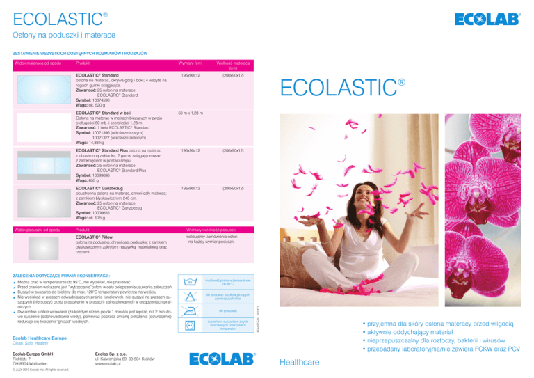 Ecolastic ® Osłony na poduszki i materace Zestawienie wszystkich dostępnych rozmiarów i rodzajów Produkt ECOLASTIC® Standard osłona na materac, okrywa górę i boki; 4 wszyte na rogach gumki ściągające. Zawartość: 25 osłon na materace ECOLASTIC® Standard Symbol: 10074590 Waga: ok. 520 g Widok poduszki od spodu Wymiary (cm) Wielkość materaca (cm) 195x90x12 (200x90x12) ECOLASTIC® Standard w beli Osłona na materac w metrach bieżących w zwoju o długości 50 mb. i szerokości 1,28 m. Zawartość: 1 bela ECOLASTIC® Standard Symbol: 10021396 (w kolorze szarym) 10021327 (w kolorze zielonym) Waga: 14,88 kg 50 m x 1,28 m ECOLASTIC® Standard Plus osłona na materac z obustronną zakładką; 2 gumki ściągające wraz z zamknięciem w postaci rzepu. Zawartość: 25 osłon na materace ECOLASTIC® Standard Plus Symbol: 10099698 Waga: 655 g 195x90x12 (200x90x12) ECOLASTIC® Ganzbezug obustronna osłona na materac, chroni cały materac; z zamkiem błyskawicznym 240 cm. Zawartość: 25 osłon na materace ECOLASTIC® Ganzbezug Symbol: 10000655 Waga: ok. 975 g 195x90x12 (200x90x12) Produkt Wymiary i wielkość poduszki ECOLASTIC® Pillow osłona na poduszkę, chroni całą poduszkę; z zamkiem błyskawicznym zakrytym naszywką materiałową oraz rzepami realizujemy zamówienia osłon na każdy wymiar poduszki Zalecenia dotyczące prania i konserwacji: \\ \\ \\ \\ \\ Można prać w temperaturze do 95°C, nie wybielać, nie prasować Przed praniem wskazane jest ”wytrzepanie”osłon, w celu polepszenia usuwania zabrudzeń Suszyć w suszarce do bielizny do max. 120°C temperatury powietrza na wejściu Nie wyciskać w prasach odwadniających pralnic tunelowych, nie suszyć na prasach suszących (nie suszyć przez prasowanie w prasach) zainstalowanych w urządzeniach pralniczych Dwukrotne krótkie wirowanie (za każdym razem po ok.1 minuta) jest lepsze, niż 2 minutowe suszenie (odprowadzanie wody), ponieważ poprzez zmianę położenia (odwrócenie) redukuje się tworzenie”gniazd” wodnych. 95 Ecolastic ® możliwość prania w temperaturze do 95°C nie stosować środków piorących zawierających chlor nie prasować suszenie w suszarce w zwykle stosowanych przedziałach temperatur EOLASTIC/07_2010/PL Widok materaca od spodu •przyjemna dla skóry osłona materacy przed wilgocią •aktywnie oddychający materiał •nieprzepuszczalny dla roztoczy, bakterii i wirusów •przebadany laboratoryjnie/nie zawiera FCKW oraz PCV Ecolab Healthcare Europe Clean. Safe. Healthy Ecolab Europe GmbH Richtistr. 7 CH-8304 Wallisellen © JULY 2010 Ecolab Inc. All rights reserved. Ecolab Sp. z o.o. ul. Kalwaryjska 69, 30-504 Kraków www.ecolab.pl Healthcare Ecolastic ® ECOLASTIC® to: \\ \\ \\ \\ \\ Koncepcja ochrony \\ W szpitalach, klinikach, ośrodkach rehabilitacyjnych, domach pomocy społecznej, gdzie pacjenci większą część dnia muszą spędzać w łóżku, szczególne ważne są poduszki i materace. Zarówno pod względem higienicznym jak i ekonomicznym konserwacja i ochrona materiałów, na których leży pacjent, odgrywa bardzo ważną rolę. \\ Osłony typu ECOLASTIC® firmy Ecolab chronią materace i poduszki przed zabrudzeniami i zniszczeniem. Powłoki te są nieprzepuszczalne dla bakterii, wirusów i roztoczy. W ten sposób Państwa pacjenci chronieni są przed ponownymi zakażeniami, obciążenie alergenowe wywołane roztoczami redukowane jest w optymalny sposób. Przyjemny dla skóry, aktywnie oddychający materiał oraz gładka, wolna od fałd i zagnieceń powierzchnia osłon przeciwdziałają powstawaniu odleżyn u pacjentów. Łatwe w stosowaniu osłony ECOLASTIC® ułatwiają pracę personelu medycznego. Państwa pacjenci, będą Wam za to wdzięczni. \\ Osłona chroniąca poduszki i materace Materiał: włókno tekstylne pokryte czystym, przepuszczającym parę wodną poliuretanem Przepuszczalność pary wodnej przetestowana zgodnie z Niemiecką Normą Przemysłową DIN 53122 (strefa klimatyczna B, 38°C) Materiał odporny na ścieranie, długotrwale elastyczny, łatwy do założenia Możliwość codziennej dezynfekcji Właściwości materiału pozostają niezmienne także przy częstym praniu osłon Nieprzepuszczalny dla roztoczy, bakterii i wirusów Produkt przebadany w laboratoriach badawczych ds. zastosowań i technologii firmy Ecolab Uzyskano następujące opinie biegłych: Z dokładnymi danymi dotyczącymi warunków wykonanych badań na zachowanie się materiału w czasie prania i suszenia prosimy zapoznać się w oparciu o szczegółową opinię, którą możecie Państwo otrzymać od firmy Ecolab. DANE TECHNICZNE: \\ \\ \\ \\ \\ Skład: 100% jersey poliestrowy (polimer syntetyczny), na stronie odwrotnej – powłoka wykonana z poliuretanu. Waga/gramatura – ok. 200g/m² Palność materiału zgodna z normą DIN 54333. Wyraźnie poniżej wymaganej wartości wynoszącej <125mm dla tekstyliów trudno zapalnych. Przepuszczalność pary wodnej wg DIN 53122 – 1050g/m²/dzień. Wodoszczelność tkaniny wg DIN 53886 – 150 mbar. Nieprzepuszczalność osłon ECOLASTIC® na bakterie i wirusy testowana była w oparciu o uznaną metodę działu Badawczego Biologii/Bezpieczeństwa Produktów firmy Henkel KGaA. Osłony ochronne badano pod kątem nieprzepuszczalności bakterii i wirusów przed i po 25 cyklach prania z przeprowadzoną dezynfekcją chemiczno-termiczną lub też termiczną: Nie udało się stwierdzić przedostania się bakterii lub wirusów przez materiał osłony. Korzyści wynikające z posiadania osłon ECOLASTIC® Właściwości Korzyści dla Państwa ECOLASTIC jest zmywalny i można go dezynfekować. Do dezynfekcji zaleca się preparaty firmy Ecolab: Incidin® Liquid Spray, Incidur® Spray, Incidin® Plus, Virufen. Nie należy stosować preparatów chlorowych. Dezynfekcja poduszek i materaców parą nie jest już konieczna. Oznacza to redukcję kosztów energii, ułatwia i przyspiesza pracę oraz przyczynia się do zachowania osłanianych przedmiotów w ideal