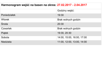 Harmonogram wej na basen na okres: 27.02.2017 - 2.04.2017 Godziny wej : Poniedzia ek 19:30 Wtorek Brak wolnych godzin roda 20:30 Czwartek Brak wolnych godzin Pi tek 19:30, 20:30 Sobota 14:00, 15:00, 16:00, 17:00 Niedziela 11:00, 12:00, 13:00, 14:00