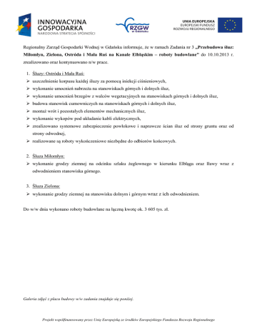 Regionalny Zarząd Gospodarki Wodnej w Gdańsku informuje, że w ramach Zadania nr 3 „Przebudowa śluz: Miłomłyn, Zielona, Ostróda i Mała Ruś na Kanale Elbląskim – roboty budowlane” do 10.10.2013 r. zrealizowano oraz kontynuowano n/w prace. 1. Śluzy: Ostróda i Mała Ruś: uszczelnienie korpusu każdej śluzy za pomocą iniekcji ciśnieniowych, wykonanie umocnień nabrzeża na stanowiskach górnych i dolnych śluz, wykonanie umocnień brzegów z walców wegetacyjnych na stanowiskach górnych i dolnych śluz, budowa stanowisk cumowniczych na stanowiskach górnych i dolnych śluz, montaż wrót i pozostałych elementów mechanicznych śluz, wykonanie wykopów pod układanie kabli elektrycznych, zrealizowano systemowe zabezpieczenie powłokowe i naprawcze ścian śluz od strony gruntu oraz od strony odwodnej, realizowane są roboty wykończeniowe niezbędne do odbiorów końcowych. 2. Śluza Miłomłyn: wykonanie grodzy ziemnej na odcinku szlaku żeglownego w kierunku Elbląga oraz Iławy wraz z odwodnieniem stanowiska górnego. 3. Śluza Zielona: wykonanie grodzy ziemnej na stanowisku dolnym i górnym wraz z ich odwodnieniem. Do w/w dnia wykonano roboty budowlane na łączną kwotę ok. 3 605 tys. zł. Galeria zdjęć z placu budowy w/w zadania znajduje się poniżej. Projekt współfinansowany przez Unię Europejską ze środków Europejskiego Funduszu Rozwoju Regionalnego Fot. 1. Śluza Ostróda – budowa umocnień brzegowych na stanowisku górnym. Fot. 2. Głowa górna śluzy Ostróda. Projekt współfinansowany przez Unię Europejską ze środków Europejskiego Funduszu Rozwoju Regionalnego Fot. 3. Wymienione wrota dolne na śluzie Ostróda. Fot. 4. Śluza Ostróda – budowa umocnień brzegowych na stanowisku dolnym. Projekt współfinansowany przez Unię Europejską ze środków Europejskiego Funduszu Rozwoju Regionalnego Fot. 5. Śluza Mała Ruś – wnętrze komory śluzy (widok na głowę dolną). Fot. 6. Śluza Mała Ruś – budowa umocnień brzegowych na stanowisku dolnym. Projekt współfinansowany przez Unię Europejską ze środków Europejskiego Funduszu Rozwoju Regionalnego Fot. 7. Wymienione wrota górne na śluzie Mała Ruś. Fot. 8. Śluza Miłomłyn – odwodnione stanowisko górne. Projekt współfinansowany przez Unię Europejską ze środków Europejskiego Funduszu Rozwoju Regionalnego Fot. 9. Odwodniony fragment szlaku za śluzą Miłomłyn w kierunku Iławy (za mostem widoczna grodza ziemna). Fot. 10. Grodza ziemna widziana z bliska. Projekt współfinansowany przez Unię Europejską ze środków Europejskiego Funduszu Rozwoju Regionalnego Fot. 11. Śluza Zielona – odwodnione wnętrze komory śluzy. Fot. 12. Śluza Zielona – odwodnione stanowisko dolne (w tle widoczna grodza ziemna). Zamieszczone zdjęcia stanowią własność Archiwum RZGW Gdańsk. Projekt współfinansowany przez Unię Europejską ze środków Europejskiego Funduszu Rozwoju Regionalnego