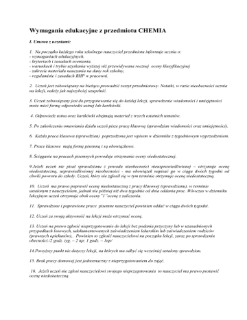 Wymagania edukacyjne z przedmiotu CHEMIA I. Umowa z uczniami: 1. Na początku każdego roku szkolnego nauczyciel przedmiotu informuje ucznia o: - wymaganiach edukacyjnych, - kryteriach i zasadach oceniania, - warunkach i trybie uzyskania wyższej niż przewidywana rocznej oceny klasyfikacyjnej - zakresie materiału nauczania na dany rok szkolny, - regulaminie i zasadach BHP w pracowni. 2. Uczeń jest zobowiązany na bieżąco prowadzić zeszyt przedmiotowy. Notatki, w razie nieobecności ucznia na lekcji, należy jak najszybciej uzupełnić. 3. Uczeń zobowiązany jest do przygotowania się do każdej lekcji, sprawdzenie wiadomości i umiejętności może mieć formę odpowiedzi ustnej lub kartkówki. 4. Odpowiedz ustna oraz kartkówki obejmują materiał z trzech ostatnich tematów. 5. Po zakończeniu omawiania działu uczeń pisze pracę klasową (sprawdzian wiadomości oraz umiejętności). 6. Każda praca klasowa (sprawdzian) poprzedzona jest wpisem w dzienniku z tygodniowym wyprzedzeniem. 7. Prace klasowe mają formę pisemną i są obowiązkowe. 8. Ściąganie na pracach pisemnych powoduje otrzymanie oceny niedostatecznej. 9 Jeżeli uczeń nie pisał sprawdzianu z powodu nieobecności nieusprawiedliwionej – otrzymuje ocenę niedostateczną, usprawiedliwionej nieobecności - ma obowiązek napisać go w ciągu dwóch tygodni od chwili powrotu do szkoły. Uczeń, który nie zgłosił się w tym terminie otrzymuje ocenę niedostateczną. 10. Uczeń ma prawo poprawić ocenę niedostateczną z pracy klasowej (sprawdzianu), w terminie ustalonym z nauczycielem, jednak nie później niż dwa tygodnie od dnia oddania prac. Wówczas w dzienniku lekcyjnym uczeń otrzymuje obok oceny”1”ocenę z zaliczenia. 11. Sprawdzone i poprawione prace pisemne nauczyciel powinien oddać w ciągu dwóch tygodni. 12. Uczeń za swoją aktywność na lekcji może otrzymać ocenę. 13. Uczeń na prawo zgłosić nieprzygotowanie do lekcji bez podania przyczyny lub w uzasadnionych przypadkach losowych, udokumentowanych zaświadczeniem lekarskim lub zaświadczeniem rodziców (prawnych opiekunów),. Powinien to zgłosić nauczycielowi na początku lekcji, zaraz po sprawdzeniu obecności./2 godz. tyg. – 2 np; 1 godz. – 1np/ 14.Powyższy punkt nie dotyczy lekcji, na których ma odbyć się wcześniej ustalony sprawdzian. 15. Brak pracy domowej jest jednoznaczny z nieprzygotowaniem do zajęć. 16. Jeżeli uczeń nie zgłosi nauczycielowi swojego nieprzygotowania to nauczyciel ma prawo postawić ocenę niedostateczną. 17. Jeżeli uczeń wykorzysta wszystkie „szanse”, za kolejne nieprzygotowanie otrzymuje ocenę niedostateczną. 18. Uczeń, który opuścił więcej niż 50% lekcji chemii w ciągu semestru, może nie być klasyfikowany. 19. Jeśli uczeń otrzymał ocenę niedostateczną za I semestr musi w drugim semestrze uzupełnić wskazany przez nauczyciela materiał. Termin zaliczenia wskazuje nauczyciel. W przypadku nie wyrównania materiału – uczeń uzyskuje ocenę niedostateczną na koniec roku. Ocenę tą można poprawić pisząc egzamin poprawkowy w terminie wskazanym przez Dyrektora Szkoły. Warunki i tryb uzyskania wyższej niż przewidywana rocznej oceny klasyfikacyjnej z obowiązkowych i dodatkowych zajęć edukacyjnych. Wyższa niż przewidywana roczna ocena klasyfikacyjna z zajęć edukacyjnych może być ustalona na podstawie wyniku rocznego sprawdzianu wiadomości i umiejętności przeprowadzonego na wniosek ucznia lub rodziców (opiekunów prawnych). Wniosek należy złożyć w sekretariacie do Dyrektora szkoły w terminie nie później niż trzy dni po uzyskaniu informacji o przewidywanej ocenie. Wniosek powinien zawierać uzasadnienie. Uczeń może ubiegać się o podwyższenie oceny przewidywanej o jeden stopień. II. Sposób informowania rodziców o postępach i ocenach bieżących ucznia O postępach ucznia rodzic będzie mógł zasięgnąć informacji w czasie spotkań z nauczycielem w ramach „dni otwartych”, zebrań oraz w każdy inny czas, gdy rodzic bądź opiekun zgłosi się do szkoły – w czasie przerwy, gdy nauczyciel nie ma dyżuru lub zajęć lekcyjnych. Oceny cząstkowe są jawne i podawane na • wykazuje brak zrozumienia, niektórych zagadnień i pojęć, • w odpowiedziach popełnia liczne błędy, • przejawia obojętny stosunek do przedmiotu i obowiązków. przedmiotu. Informacje o postępach ucznia udzielane są w oparciu o wpis w dzienniku, obserwację ucznia, prace pisemne ucznia. Informacja o przewidywanej ocenie klasyfikacyjnej jest przekazywana zgodnie z procedurą Oceniania Wewnątrzszkolnego. III. Sposób ustalania oceny śródrocznej i rocznej Przy ustalaniu oceny semestralnej lub rocznej nauczyciel bierze pod uwagę oceny ucznia z poszczególnych obszarów działalności: - sprawdziany, - kartkówki i odpowiedz ustna, - aktywność na zajęciach, - prace domowe, - referaty, prezentacje i inne. Ocena śródroczna i roczna nie jest średnią arytmetyczną ocen cząstkowych. IV. Formy sprawdzania wiedzy i umiejętności 1. Prace klasowe i sprawdziany, które zapowiadane są z co najmniej tygodniowym wyprzedzeniem. 2. Kartkówki, które nie są zapowiadane, obejmujące zagadnienia z trzech ostatnich tematów. 3. Odpowiedzi ustne 4. Aktywność na lekcjach 5. Zadania domowe. Ocena ze sprawdzianu , testu zostaje ustalona według następującej skali: · 100% - celujący · 88% - 99% - bardzo dobry · 75% - 87% - dobry · 51% - 74% - dostateczny · 36% - 50% - dopuszczający · 0% - 35% - niedostateczny V. Wymagania programowe Zamierzone osiągnięcia uczniów zostały sprecyzowane w formie osobnego załącznika – do każdego działu określone są na poszczególne oceny szkolne w oparciu o realizowany program nauczania. W stosunku do uczniów o szczególnych potrzebach dydaktycznych uwzględniane są zalecenia Poradni Psychologiczno – Pedagogicznych sformułowane w opiniach przez nich wydanych. VI. Sposoby korygowania niepowodzeń szkolnych i podnos