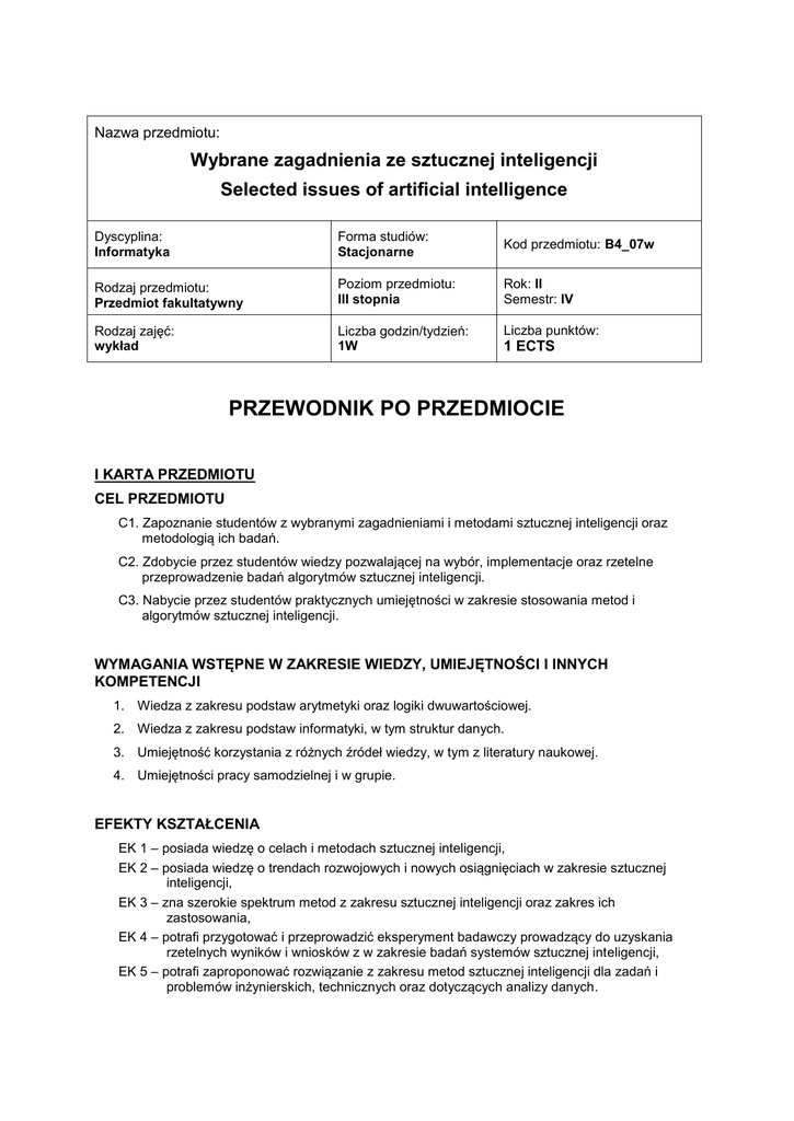 Nazwa przedmiotu: Wybrane zagadnienia ze sztucznej inteligencji Selected issues of artificial intelligence Dyscyplina: Informatyka Forma studiów: Stacjonarne Kod przedmiotu: B4_07w Rodzaj przedmiotu: Przedmiot fakultatywny Poziom przedmiotu: III stopnia Rok: II Semestr: IV Rodzaj zajęć: wykład Liczba godzin/tydzień: 1W Liczba punktów: 1 ECTS PRZEWODNIK PO PRZEDMIOCIE I KARTA PRZEDMIOTU CEL PRZEDMIOTU C1. Zapoznanie studentów z wybranymi zagadnieniami i metodami sztucznej inteligencji oraz metodologią ich badań. C2. Zdobycie przez studentów wiedzy pozwalającej na wybór, implementacje oraz rzetelne przeprowadzenie badań algorytmów sztucznej inteligencji. C3. Nabycie przez studentów praktycznych umiejętności w zakresie stosowania metod i algorytmów sztucznej inteligencji. WYMAGANIA WSTĘPNE W ZAKRESIE WIEDZY, UMIEJĘTNOŚCI I INNYCH KOMPETENCJI 1. Wiedza z zakresu podstaw arytmetyki oraz logiki dwuwartościowej. 2. Wiedza z zakresu podstaw informatyki, w tym struktur danych. 3. Umiejętność korzystania z różnych źródeł wiedzy, w tym z literatury naukowej. 4. Umiejętności pracy samodzielnej i w grupie. EFEKTY KSZTAŁCENIA EK 1 – posiada wiedzę o celach i metodach sztucznej inteligencji, EK 2 – posiada wiedzę o trendach rozwojowych i nowych osiągnięciach w zakresie sztucznej inteligencji, EK 3 – zna szerokie spektrum metod z zakresu sztucznej inteligencji oraz zakres ich zastosowania, EK 4 – potrafi przygotować i przeprowadzić eksperyment badawczy prowadzący do uzyskania rzetelnych wyników i wniosków z w zakresie badań systemów sztucznej inteligencji, EK 5 – potrafi zaproponować rozwiązanie z zakresu metod sztucznej inteligencji dla zadań i problemów inżynierskich, technicznych oraz dotyczących analizy danych. TREŚCI PROGRAMOWE Liczba godzin 1 1 1 1 1 1 2 1 1 1 2 2 Forma zajęć – Seminarium / Wykład W 1 - Wstęp do sztucznej inteligencji W 2 - Procedury badania systemów sztucznej inteligencji W 3 - Sieci neuronowe jednokierunkowe W 4 - Sieci neuronowe ze sprzężeniami zwrotnymi W 5 - Wstęp do przetwarzania ziarnistego W 6 - Teoria zbiorów rozmytych W 7, 8 - Rozmyte systemy decyzyjne W 9 - Miara możliwości i konieczności W 10 - Systemy neuronowo-rozmyte W 11 - Zbiory rozmyte typu 2 i ich zastosowanie W 12, 13 - Teoria zbiorów przybliżonych W 14, 15 - Drzewa decyzyjne NARZĘDZIA DYDAKTYCZNE 1. – Wykład z wykorzystaniem prezentacji multimedialnych. 2. – Literatura naukowa. SPOSOBY OCENY ( F – FORMUJĄCA, P – PODSUMOWUJĄCA) F1. – Ocena aktywności podczas zajęć P1. – Ocena opanowania materiału nauczania będącego przedmiotem wykładu – zaliczenie wykładu (lub egzamin) OBCIĄŻENIE PRACĄ DOKTORANTA Forma aktywności Średnia liczba godzin na zrealizowanie aktywności Godziny kontaktowe z prowadzącym 15h Godziny konsultacji z prowadzącym 5h Zapoznanie się ze wskazaną literaturą, przygotowanie do seminariów, wykonanie zadań domowych 10 h Suma ∑30 SUMARYCZNA LICZBA PUNKTÓW ECTS DLA PRZEDMIOTU 1 ECTS h* LITERATURA PODSTAWOWA I UZUPEŁNIAJĄCA 1. 2. 3. Mariusz Flasiński, Wstęp do sztucznej inteligencji, Wydawnictwo Naukowe PWN, Warszawa 2011 Dawid E. Goldberg, Algorytmy genetyczne i ich zastosowania, Wydawnictwa NaukowoTechniczne, Warszawa 1995 Amit Konar, Computational Intelligence. Principles, techniques and applications, Springer 2005 Jacek Łęski, Systemy neuronowo-rozmyte, Wydawnictwa Naukowo-Techniczne, Warszawa 2008 5. Zbigniew Michalewicz, Algorytmy genetyczne + struktury danych = programy ewolucyjne, Wydawnictwa Naukowo-Techniczne, Warszawa 1996 6. Robert K. Nowicki, Rozmyte systemy decyzyjne w zadaniach z ograniczoną wiedzą, Akademicka Oficyna Wydawnicza EXIT, Warszawa 2009 7. Leszek Rutkowski, Metody i techniki sztucznej inteligencji, Wydawnictwo Naukowe PWN, Warszawa 2005 8. Katarzyna Stąpor, Metody klasyfikacji obiektów w wizji komputerowej, Wydawnictwo Naukowe PWN, Warszawa 2011 9. Krzysztof Ślot, Wybrane zagadnienia biometrii, Wydawnictwa Komunikacji i Łączności, Warszawa 2008 10. Sławomir T. Wierzchoń, Sztuczne systemy immunologiczne. Teoria i zastosowania, Akademicka Oficyna Wydawnicza EXIT, Warszawa 2001 4. PROWADZĄCY PRZEDMIOT (IMIĘ, NAZWISKO, ADRES E-MAIL) 1. dr hab. inż. Robert Nowicki, prof. PCz, [email protected] MACIERZ REALIZACJI EFEKTÓW KSZTAŁCENIA Efekt kształcenia EK1 EK2 EK3 EK4 EK5 Odniesienie danego efektu do efektów zdefiniowanych dla całego programu (PEK) K_W01, K_W02, K_W05 K_W04 K_W01, K_W02, K_W05 K_U10, K_U11, K_U12, K_U15, K_U19 K_U15, K_U17, K_U19 Cele przedmiotu Treści programowe Narzędzia dydaktyczne Sposób oceny C1 1-15 1, 2 1, 2 C1, C2 1-15 1, 2 1, 2 C1, C2 1-15 1, 2 1, 2 C2 1-15 1, 2 1, 2 C3 1-15 1, 2 1, 2 II. FORMY OCENY Na pierwszych zajęciach prowadzący przestawia skalę ocen i sposób weryfikacji efektów kształcenia na studiach III stopnia. III. INNE PRZYDATNE INFORMACJE O PRZEDMIOCIE 1. Informacja na temat konsultacji przekazywana jest studentom III stopnia podczas pierwszych zajęć z danego przedmiotu. 2. Informacje o harmonogramie odbywania zajęć znajdują się na stronach prowadzącego www.iisi.pcz.pl/Robert_Nowicki oraz na stronie www.wimii.pcz.pl