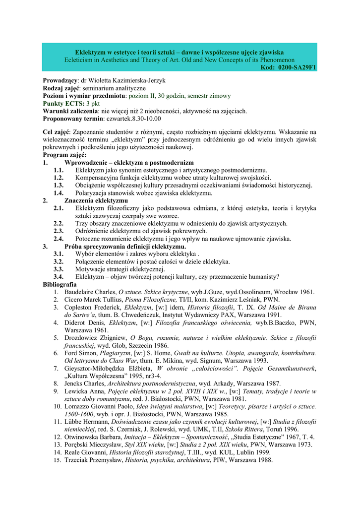 Eklektyzm w estetyce i teorii sztuki – dawne i współczesne ujęcie zjawiska Ecleticism in Aesthetics and Theory of Art. Old and New Concepts of its Phenomenon Kod: 0200-SA29F1 Prowadzący: dr Wioletta Kazimierska-Jerzyk Rodzaj zajęć: seminarium analityczne Poziom i wymiar przedmiotu: poziom II, 30 godzin, semestr zimowy Punkty ECTS: 3 pkt Warunki zaliczenia: nie więcej niŜ 2 nieobecności, aktywność na zajęciach. Proponowany termin: czwartek.8.30-10.00 Cel zajęć: Zapoznanie studentów z róŜnymi, często rozbieŜnym ujęciami eklektyzmu. Wskazanie na wieloznaczność terminu „eklektyzm” przy jednoczesnym odróŜnieniu go od wielu innych zjawisk pokrewnych i podkreśleniu jego uŜyteczności naukowej. Program zajęć: 1. Wprowadzenie – eklektyzm a postmodernizm 1.1. Eklektyzm jako synonim estetycznego i artystycznego postmodernizmu. 1.2. Kompensacyjna funkcja eklektyzmu wobec utraty kulturowej swojskości. 1.3. ObciąŜenie współczesnej kultury przesadnymi oczekiwaniami świadomości historycznej. 1.4. Polaryzacja stanowisk wobec zjawiska eklektyzmu. 2. Znaczenia eklektyzmu 2.1. Eklektyzm filozoficzny jako podstawowa odmiana, z której estetyka, teoria i krytyka sztuki zazwyczaj czerpały swe wzorce. 2.2. Trzy obszary znaczeniowe eklektyzmu w odniesieniu do zjawisk artystycznych. 2.3. OdróŜnienie eklektyzmu od zjawisk pokrewnych. 2.4. Potoczne rozumienie eklektyzmu i jego wpływ na naukowe ujmowanie zjawiska. 3. Próba sprecyzowania definicji eklektyzmu. 3.1. Wybór elementów i zakres wyboru eklektyka . 3.2. Połączenie elementów i postać całości w dziele eklektyka. 3.3. Motywacje strategii eklektycznej. 3.4. Eklektyzm – objaw twórczej potencji kultury, czy przeznaczenie humanisty? Bibliografia 1. Baudelaire Charles, O sztuce. Szkice krytyczne, wyb.J.Guze, wyd.Ossolineum, Wrocław 1961. 2. Cicero Marek Tullius, Pisma Filozoficzne, TI/II, kom. Kazimierz Leśniak, PWN. 3. Copleston Frederick, Eklektyzm, [w:] idem, Historia filozofii, T. IX. Od Maine de Birana do Sartre’a, tłum. B. Chwedeńczuk, Instytut Wydawniczy PAX, Warszawa 1991. 4. Diderot Denis, Eklektyzm, [w:] Filozofia francuskiego oświecenia, wyb.B.Baczko, PWN, Warszawa 1961. 5. Drozdowicz Zbigniew, O Bogu, rozumie, naturze i wielkim eklektyzmie. Szkice z filozofii francuskiej, wyd. Glob, Szczecin 1986. 6. Ford Simon, Plagiaryzm, [w:] S. Home, Gwałt na kulturze. Utopia, awangarda, kontrkultura. Od lettryzmu do Class War, tłum. E. Mikina, wyd. Signum, Warszawa 1993. 7. Gieysztor-Miłobędzka ElŜbieta, W obronie „całościowości”. Pojęcie Gesamtkunstwerk, „Kultura Współczesna” 1995, nr3-4. 8. Jencks Charles, Architektura postmodernistyczna, wyd. Arkady, Warszawa 1987. 9. Lewicka Anna, Pojęcie eklektyzmu w 2 poł. XVIII i XIX w., [w:] Tematy, tradycje i teorie w sztuce doby romantyzmu, red. J. Białostocki, PWN, Warszawa 1981. 10. Lomazzo Giovanni Paolo, Idea świątyni malarstwa, [w:] Teoretycy, pisarze i artyści o sztuce. 1500-1600, wyb. i opr. J. Białostocki, PWN, Warszawa 1985. 11. Lübbe Hermann, Doświadczenie czasu jako czynnik ewolucji kulturowej, [w:] Studia z filozofii niemieckiej, red. S. Czerniak, J. Rolewski, wyd. UMK, T.II, Szkoła Rittera, Toruń 1996. 12. Otwinowska Barbara, Imitacja – Eklektyzm – Spontaniczność, „Studia Estetyczne” 1967, T. 4. 13. Porębski Mieczysław, Styl XIX wieku, [w:] Studia z 2 poł. XIX wieku, PWN, Warszawa 1973. 14. Reale Giovanni, Historia filozofii staroŜytnej, T.III., wyd. KUL, Lublin 1999. 15. Trzeciak Przemysław, Historia, psychika, architektura, PIW, Warszawa 1988.