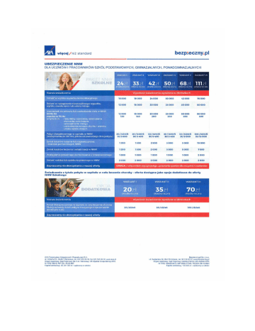 ubezpieczenia Warunki ubezpieczenia Bezpieczny.pl ubezpieczenie następstw nieszczęśliwych wypadków indeks NNWS/16/04/07 Formularz do WU Informacja sporządzona zgodnie z art. 17 ust. 1 ustawy z dnia 11 września 2015 r. o działalności ubezpieczeniowej i reasekuracyjnej Warunki ubezpieczenia następstw nieszczęśliwych wypadków Bezpieczny.pl – indeks NNWS/16/04/07 Rodzaj informacji Numer jednostki redakcyjnej wzorca umowy Przesłanki wypłaty odszkodowania i innych świadczeń lub wartości wykupu ubezpieczenia §2 §3 § 14 § 14 ust. 1 pkt 1) i 2) § 14 ust. 2 pkt 1) § 14 ust. 3 pkt 1) § 14 ust. 4 pkt 1) § 14 ust. 5 pkt 1) § 14 ust. 6 pkt 1), 2) i 3) § 14 ust. 7 pkt 1) i 2) § 14 ust. 8 pkt 1) Ograniczenia oraz wyłączenia odpowiedzialności zakładu ubezpieczeń uprawniające do odmowy wypłaty odszkodowania i innych świadczeń lub ich obniżenia §9 § 13 ust. 3 § 14 ust. 2 pkt 2) § 14 ust. 4 pkt 2) i 3) § 14 ust. 6 pkt 5) i 6) Postanowienia ogólne §1 Niniejsze warunki ubezpieczenia następstw nieszczęśliwych wypadków Bezpieczny.pl, zwane dalej „WU”, stosuje się do umów ubezpieczenia zawieranych pomiędzy AXA Towarzystwem Ubezpieczeń i Reasekuracji S.A., zwanym dalej „Towarzystwem”, a Ubezpieczającymi. Definicje §2 Pojęcia użyte w niniejszych WU, wniosku, polisie oraz dokumentach stanowiących integralną część umowy ubezpieczenia oznaczają: 1) bójka – starcie dwóch albo więcej osób wzajemnie zadających sobie razy, z których każda występuje w podwójnym charakterze (jako napadnięty i napastnik); 2) choroba – stwierdzona przez lekarza reakcja organizmu na działanie czynnika chorobotwórczego, prowadząca do zaburzeń czynnościowych, zmian organicznych w tkankach, narządach, układach lub całym ustroju; 3) koszty leczenia – poniesione na terytorium Rzeczypospolitej Polskiej niezbędne z medycznego punktu widzenia i udokumentowane koszty z tytułu pobytu w szpitalu, badań, zabiegów i operacji medycznych, związane z leczeniem następstw nieszczęśliwego wypadku; 4) nieszczęśliwy wypadek – przypadkowe, nagłe zdarzenie wywołane wyłącznie przyczyną zewnętrzną, niezależne od woli ani stanu zdrowia Ubezpieczonego lub odpowiednio rodzica Ubezpieczonego; za nieszczęśliwy wypadek nie uznaje się zawału serca, udaru mózgu i innych chorób, nawet występujących nagle; 5) obrażenia ciała – uszkodzenie narządów lub układów narządów Ubezpieczonego, powstałe w następstwie nieszczęśliwego wypadku; 6) osoba uprawniona – podmiot uprawniony do żądania spełnienia przez Towarzystwo świadczenia z tytułu umowy ubezpieczenia, w tym Uposażony; 7) placówka oświatowo-wychowawcza – placówka umożliwiająca uzyskanie i uzupełnienie wiedzy ogólnej i kwalifikacji zawodowych, zdobywanie umiejętności, kształtowanie i rozwijanie zainteresowań i uzdolnień, a także korzystanie z różnych form wypoczynku; 8) pobyt w szpitalu – potwierdzony dokumentacją medyczną pobyt w szpitalu na terenie całego świata, trwający co najmniej: a) nieprzerwanie 24 godziny – w przypadku leczenia doznanych obrażeń ciała, b) nieprzerwanie 4 dni – w przypadku leczenia choroby; w rozumieniu niniejszych WU okres pobytu w szpitalu rozpoczyna się w momencie przyjęcia Ubezpieczonego do szpitala, a kończy w momencie wypisania Ubezpieczonego ze szpitala; za dzień uważa się nieprzerwane 24 godziny; 9) polisa – dokument wystawiony przez Towarzystwo, potwierdzający zawarcie umowy ubezpieczenia; 10)poważne zachorowanie – jedna z niżej wymienionych chorób: a) nowotwór złośliwy z białaczkami i chłoniakami – niekontrolowany wzrost liczby komórek nowotworowych niszczący zdrowe tkanki; choroba musi być potwierdzona wynikiem badania histopatologicznego; ostateczny wynik badania histopatologicznego jednoznacznie potwierdzający nowotworowe tło choroby przyjmuje się za datę rozpoznania choroby; z ochrony ubezpieczeniowej wyłączone są: nowotwory in situ, nowotwory współistniejące z infekcją HIV, nowotwory skóry (w tym czerniak złośliwy do 1-B stopnia zaawansowania w klasyfikacji TNM), ziarnica złośliwa oraz chłoniaki w 1. stopniu zaawansowania, b) niewydolność nerek – krańcowe stadium przewlekłej niewydolności nerek, charakteryzujące się wskaźnikiem filtracji kłębuszkowej mniejszym niż 10 ml/min oraz wymagające ze wskazań życiowych przewlekłego leczenia dializami lub przeszczepu nerek, c) niewydolność wątroby – krańcowa przewlekła niewydolność wątroby ze stałą żółtaczką, encefalopatią i wodobrzuszem; rozpoznanie niewydolności wątroby wymaga potwierdzenia dokumentacją medyczną; za stan przewlekły uważa się co najmniej Warunki ubezpieczenia następstw nieszczęśliwych wypadków Bezpieczny.pl 6-miesięczny okres trwania choroby będącej przyczyną krańcowej niewydolności wątroby, liczony od dnia jej zdiagnozowania, d) cukrzyca – choroba metaboliczna o wieloczynnikowej etiologii, charakteryzująca się przewlekłą hiperglikemią, która rozwija się w wyniku defektu wydzielania lub działania insuliny bądź też obu tych zaburzeń, e) dystrofia mięśniowa – dystrofia mięśniowa typu Duchenne’a; rozpoznanie dystrofii mięśniowej wymaga potwierdzenia dokumentacją medyczną, f) guzy środczaszkowe – niezłośliwe guzy środczaszkowe będące przyczyną stałych ubytków neurologicznych; z ochrony ubezpieczeniowej wyłączone są: torbiele, ziarniaki, malformacje śródczaszkowe, guzy przysadki, g) śpiączka – stan utraty przytomności charakteryzujący się brakiem reakcji na bodźce zewnętrzne (oceniany w skali śpiączki Glasgow na mniej niż 9 punktów) i koniecznością użycia sprzętu wspomagającego utrzymanie czynności życiowych; stan ten winien trwać co najmniej 96 godzin oraz pozostawiać trwałe ubytki neurologiczne, a jego rozpoznanie wymaga potwierdzenia dokumentacją medyczną, zawierającą końcową ocenę stanu neurologi
