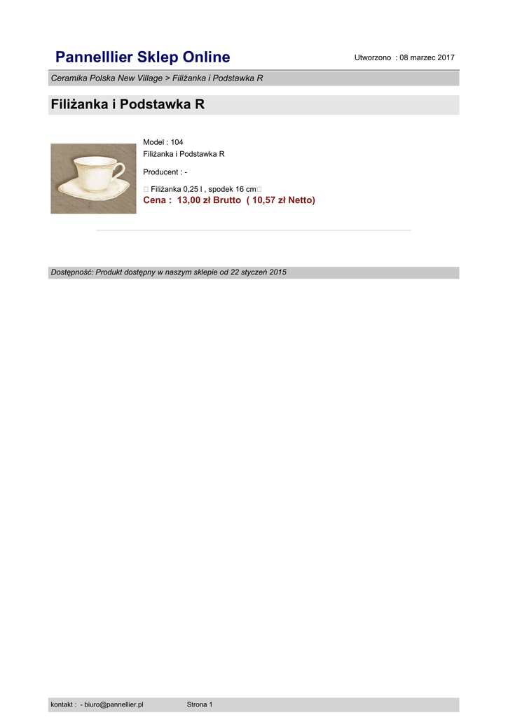 Pannelllier Sklep Online Ceramika Polska New Village > Filiżanka i Podstawka R Filiżanka i Podstawka R Model : 104 Filiżanka i Podstawka R Producent : �Filiżanka 0,25 l , spodek 16 cm� Cena : 13,00 zł Brutto ( 10,57 zł Netto) Dostępność: Produkt dostępny w naszym sklepie od 22 styczeń 2015 kontakt : - [email protected] Strona 1 Utworzono : 08 marzec 2017
