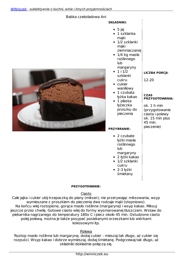 WINniczek - subiektywnie o kuchni, winie i innych przyjemnościach Babka czekoladowa Ani SKŁADNIKI: 5 jaj 1 szklanka mąki 1/2 szklanki mąki ziemniaczanej 1/4 kg masła roślinnego lub margaryny 1 i 1/2 szklanki cukru cukier waniliowy 1 czubata łyżka kakao 1 płaska łyżeczka proszku do pieczenia PRZYBRANIE: LICZBA PORCJI: 12-20 CZAS PRZYGOTOWANIA: ok. 1 h min (przygotowanie ciasta i polewy ok. 15 min plus 45 min. pieczenie) 2 czubate łyżki masła roślinnego lub margaryny 2 łyżki kakao 1/2 szklanki cukru 2-3 łyżki śmietany PRZYGOTOWANIE: Ciasto Całe jajka i cukier ubij trzepaczką do piany (mikser); nie przerywając miksowania, wsyp wymieszane z proszkiem do pieczenia dwa rodzaje mąki (stopniowo). Na końcu wlej roztopione, gorące masło roślinne (margarynę) i wsyp kakao. Miksuj jeszcze przez chwilę. Gotowe ciasto wlej do formy wysmarowanej tłuszczem. Wstaw do piekarnika nagrzanego do temperatury 180o C i piecz około 45 min. Ostudzone ciasto polej polewą, można je także posypać posiekanymi orzeszkami lub wiórkami kokosowymi itp. Polewa Roztop masło roślinne lub margarynę, dodaj cukier - mieszaj tak długo, aż cukier się rozpuści. Wsyp kakao i dobrze wymieszaj, dodaj śmietanę. Podgrzewaj tak długo, aż składniki dokładnie połączą się. http://winniczek.eu WINniczek - subiektywnie o kuchni, winie i innych przyjemnościach http://winniczek.eu